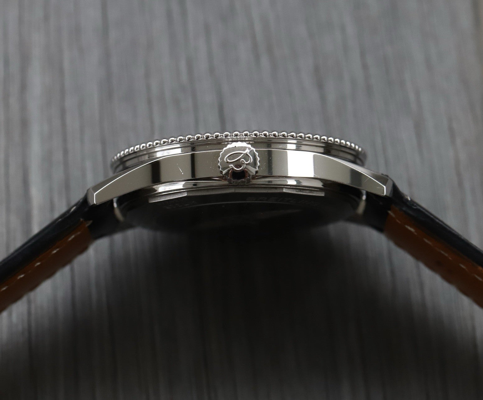 This version we have here is known as the Navitimer 38, and is a pared back and scaled down version of the stalwart from Breitling. It features a 38mm case in steel, with classic Navitimer beaded bezel surrounding a steeply sloped internal rotating slide rule bezel. Within this lies a deep black dial, brought to life with polished applied indices and the touches of red that abound the bezel and seconds hand tip. There's an applied Breitling logo at 12, balanced by a discreet date window at 6.
