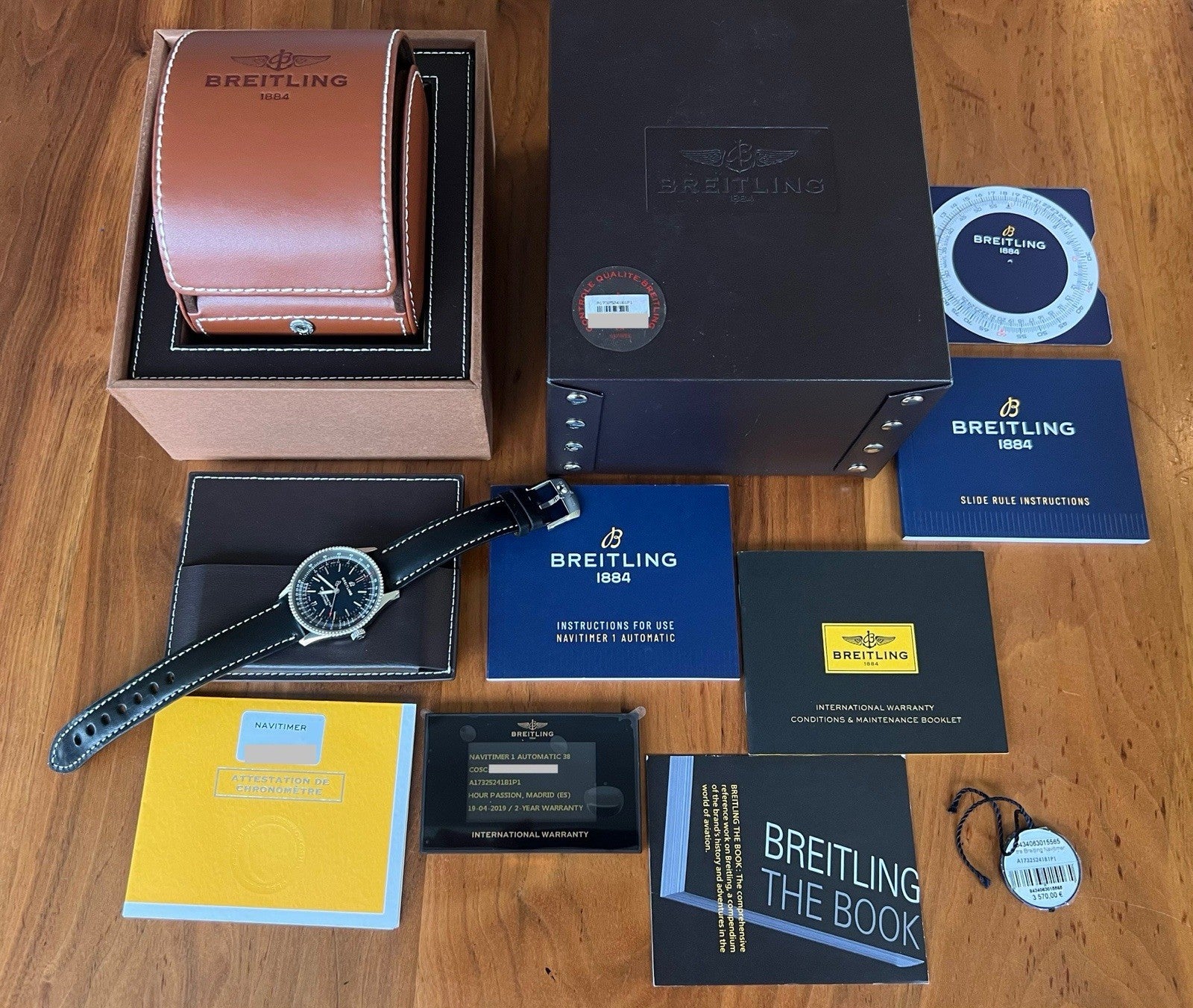 Includes outer box, inner box, travel case, slide rule instructions, chronometre certificate, warranty booklet, card holder (expired), instruction booklet, document holder, case back sticker and hangtag.