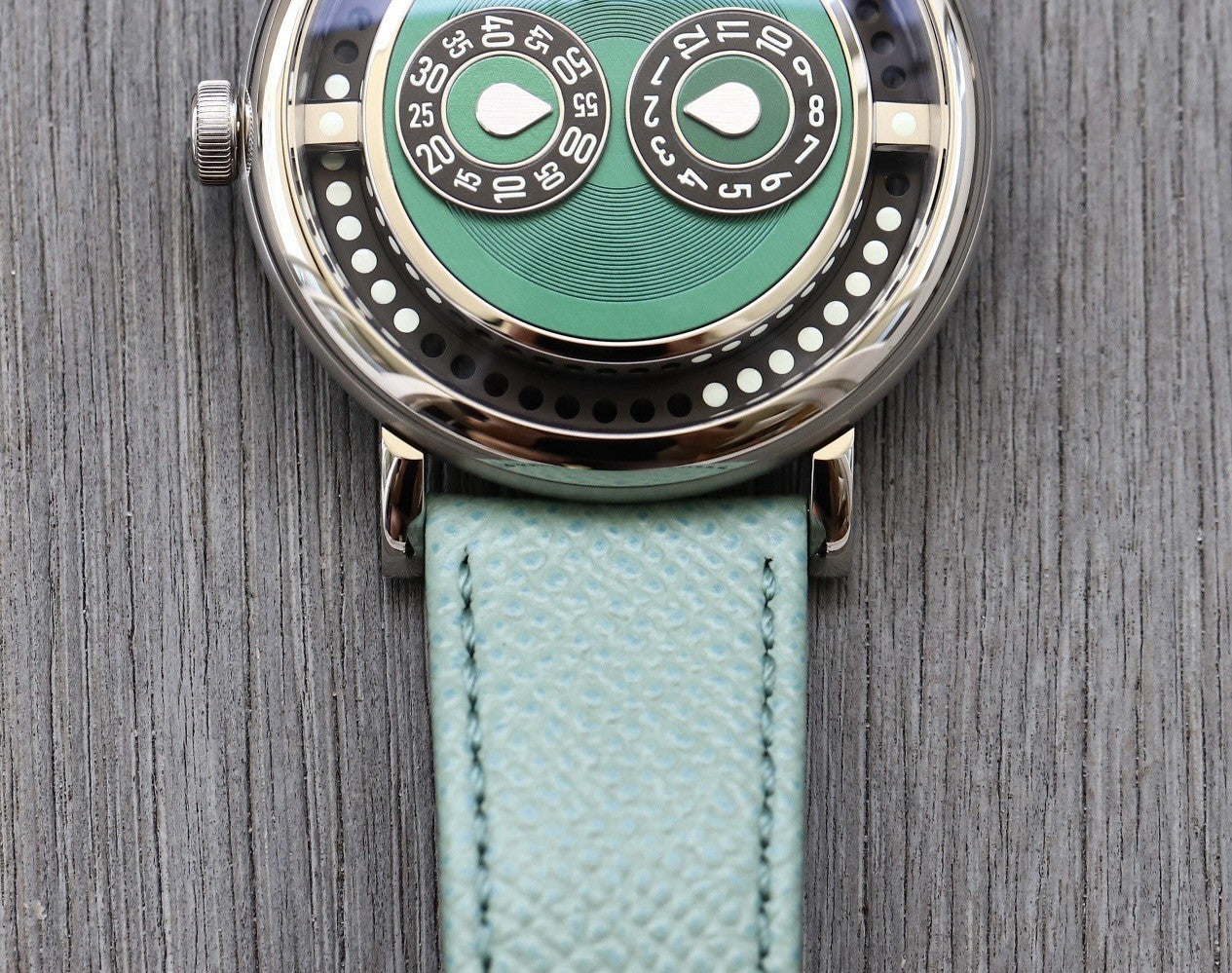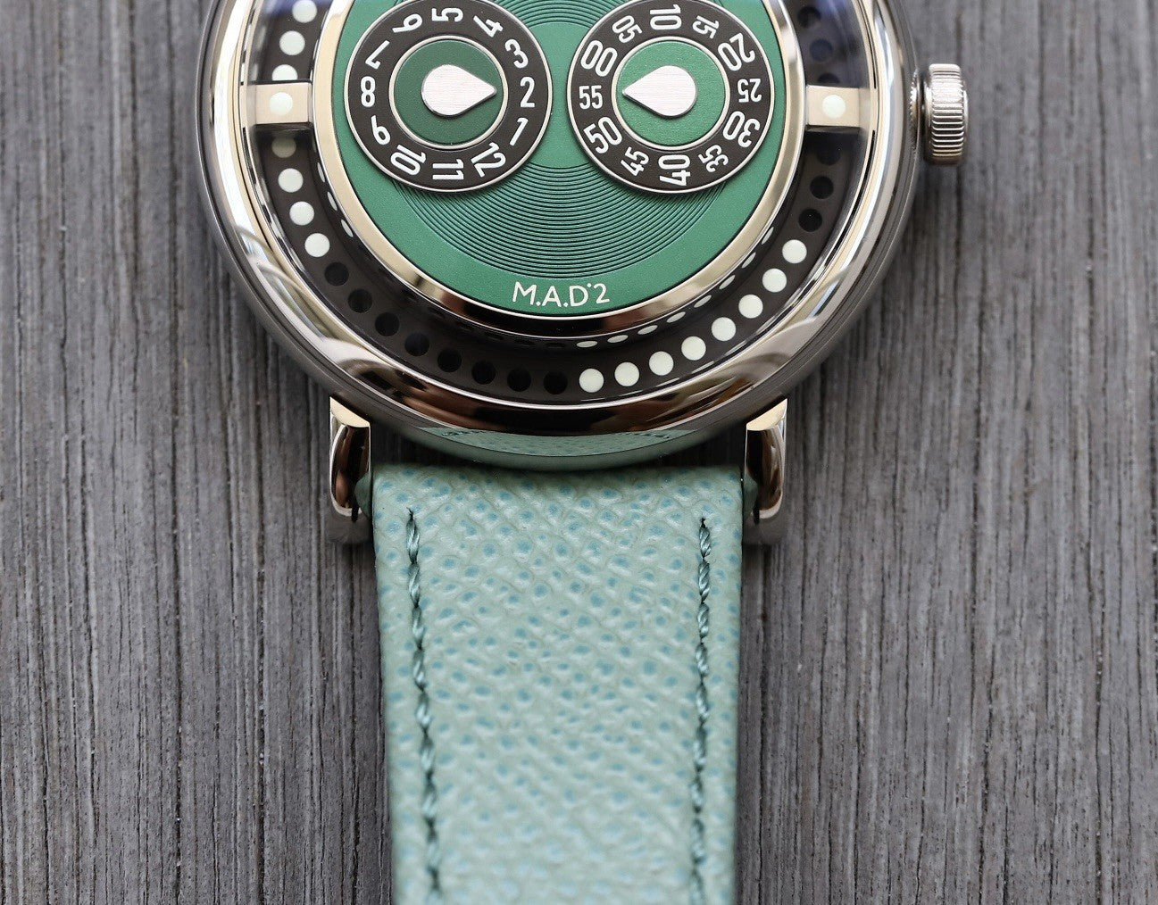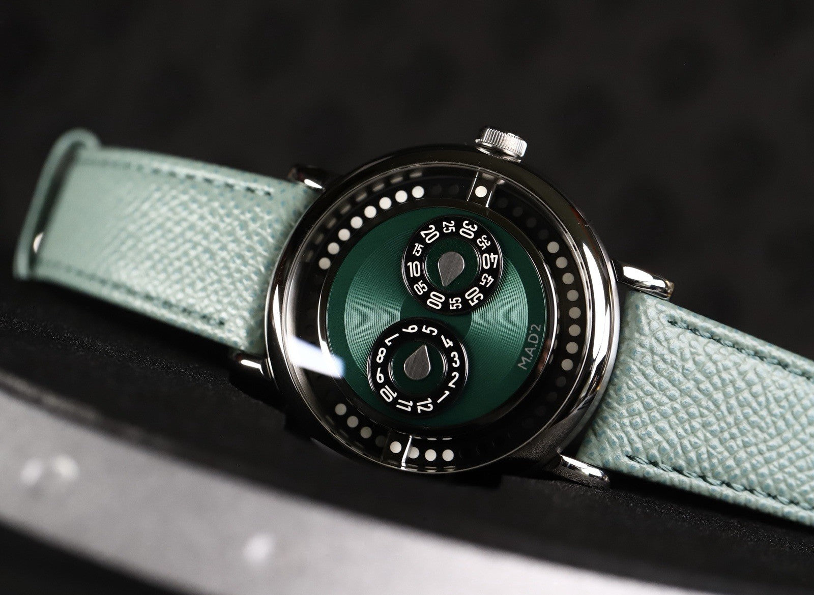 The case itself measures in at 42mm, and wears considerable smaller than the M.A.D 1 due to the pebble-like structure and thinner profile at 12.3mm, as well as the inset dial. Lug-to-lug is 48.5mm, and it is water resistant to 30m so not one for swimming with. Powering it is the Swiss made Manufacture La Joux-Perret calibre G101 with Bi-directional jumping hour and trailing minutes module developed by MB&F.