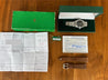 Comes with correct outer box, inner box, punched papers, hang tag with serial number, service receipt and aftermarket leather strap.