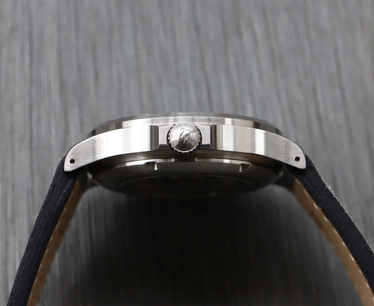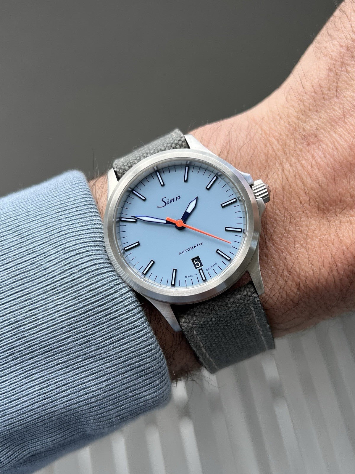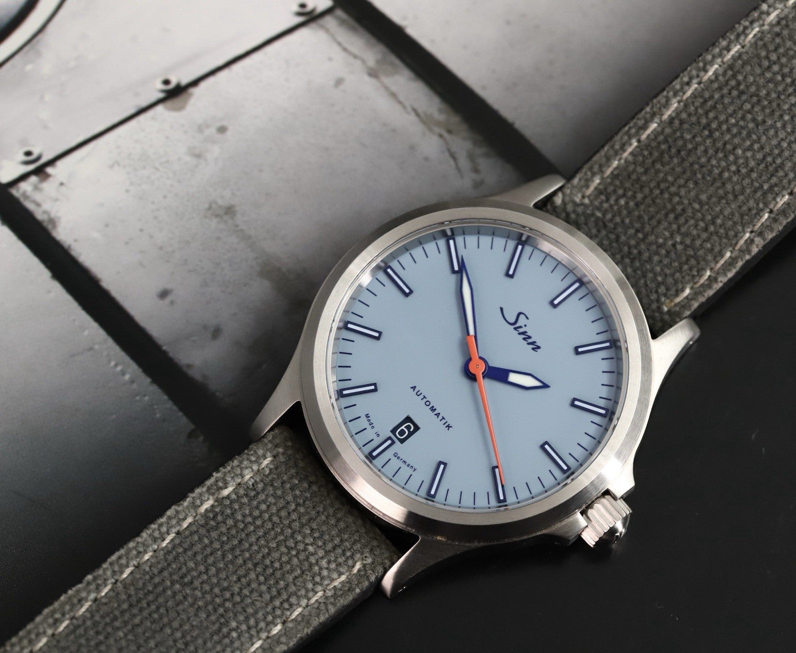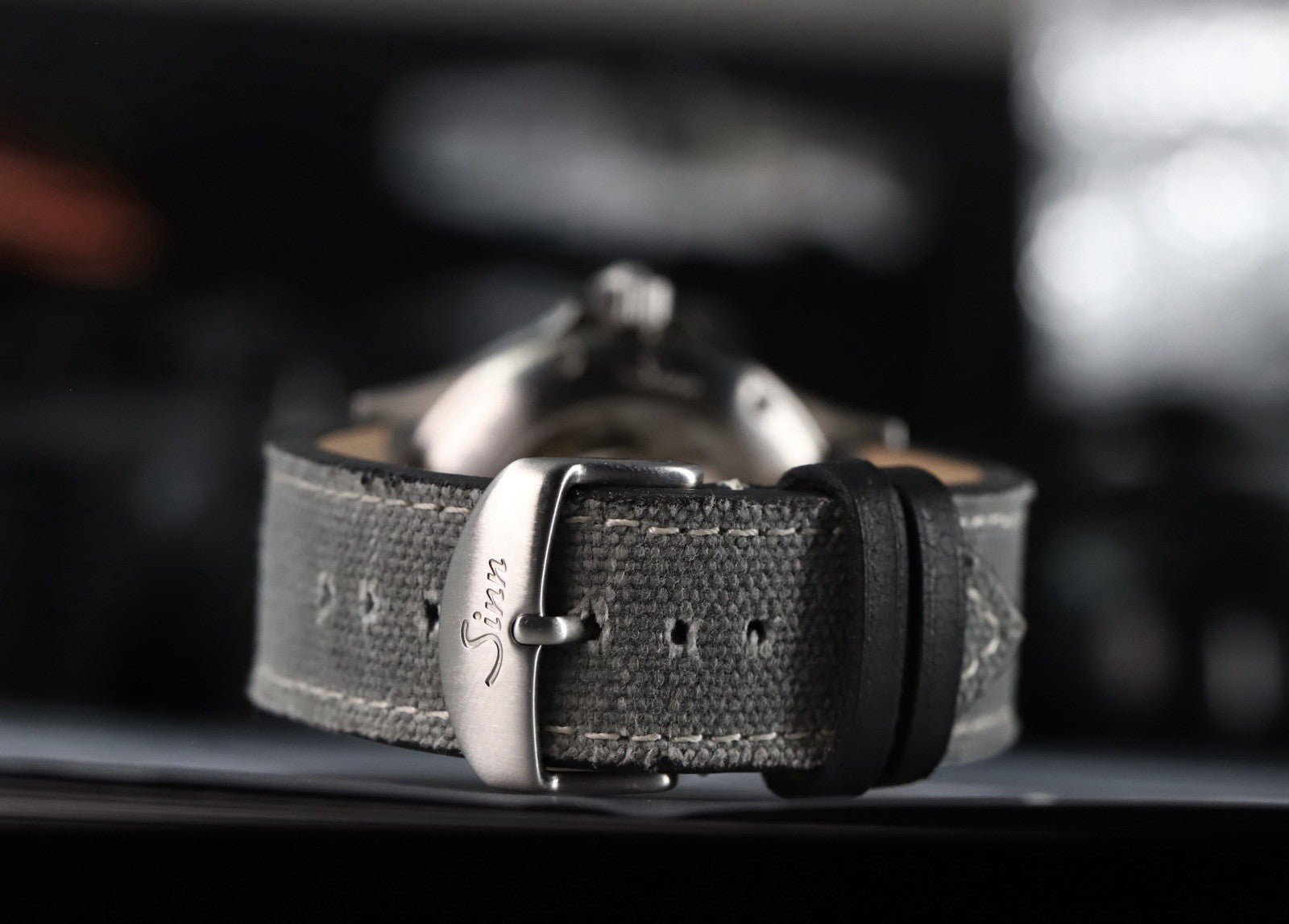 It comes mounted to Sinn's awesome canvas strap with tang buckle in near-new condition, and also includes a brand new Sinn calf leather strap in blue.