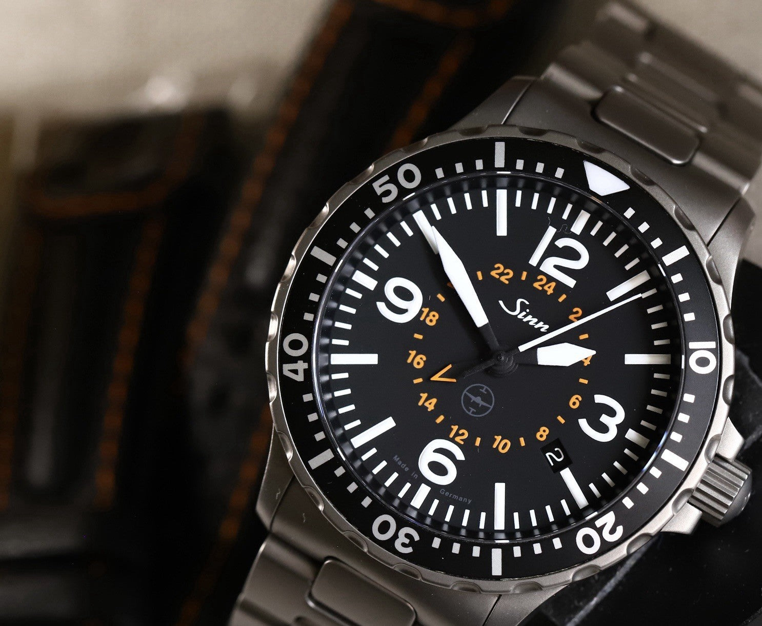 This all sits within a 43mm bead-blasted steel case, and is usually mounted to a very cool orange and leather Pilot style strap, but in this instance also includes a steel Tegimented Sinn bracelet.