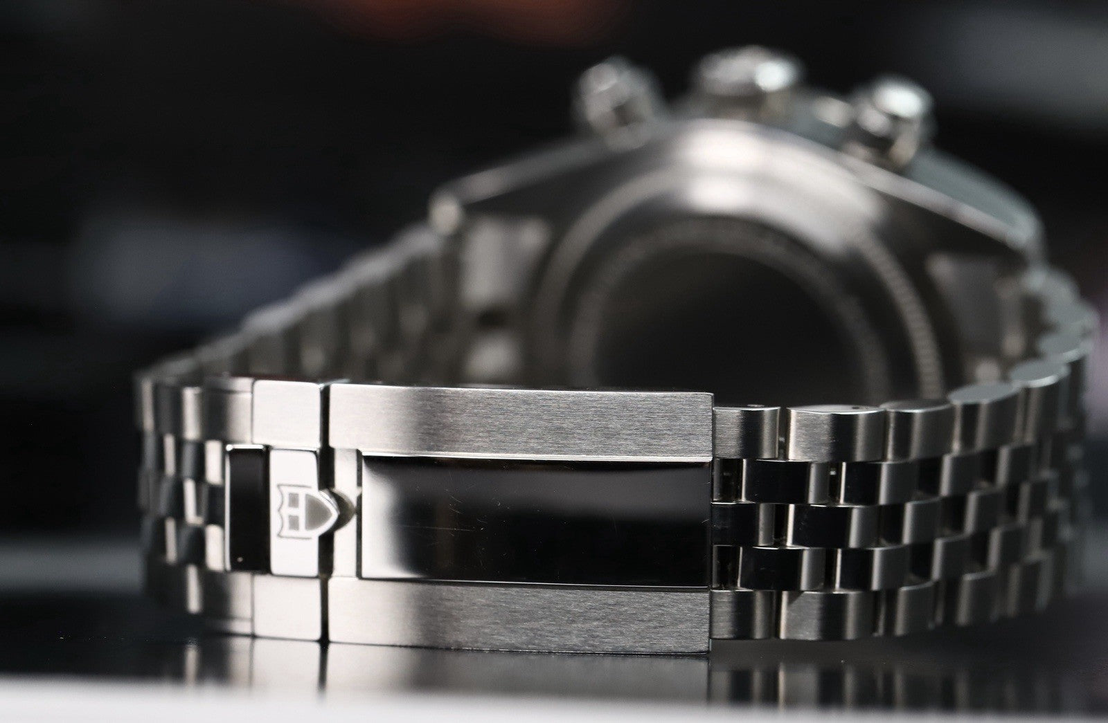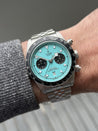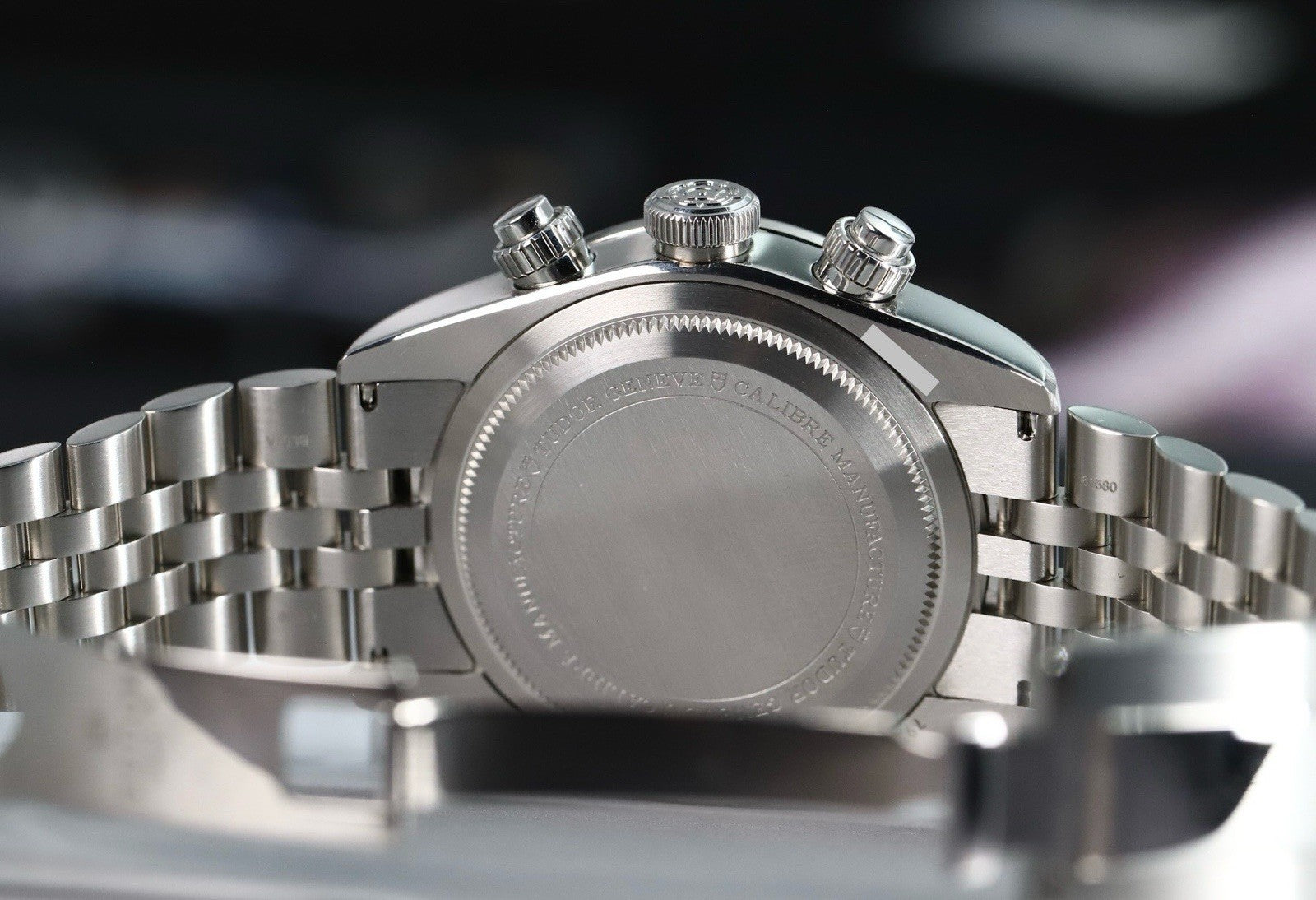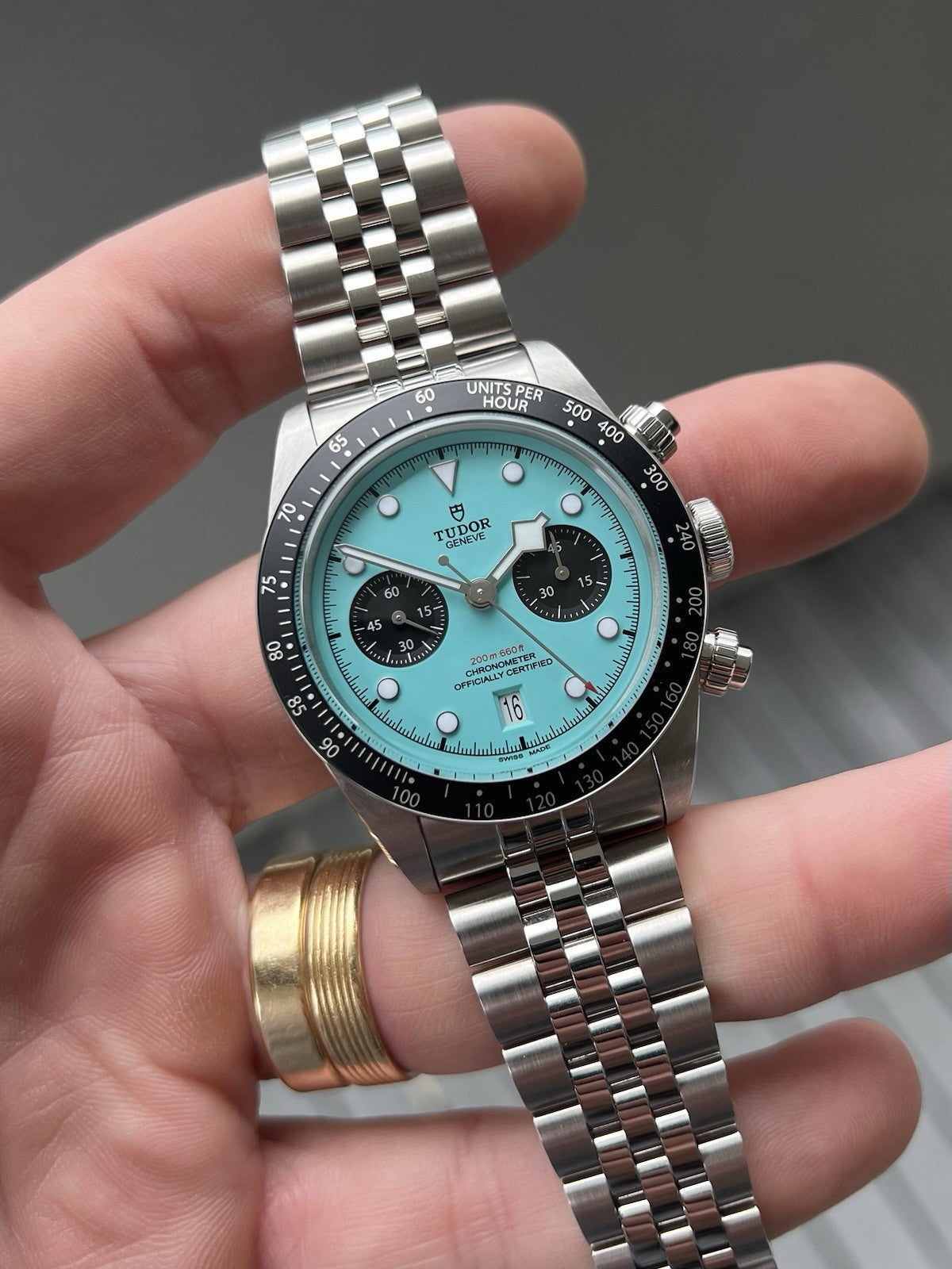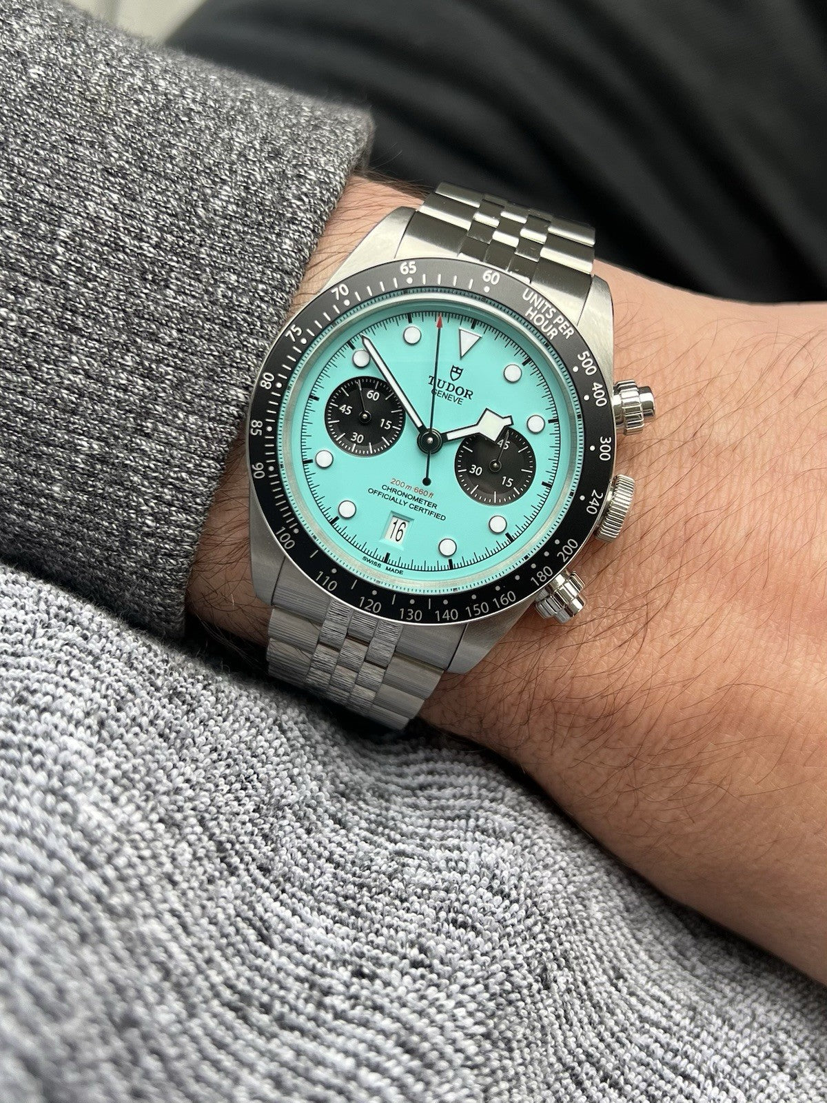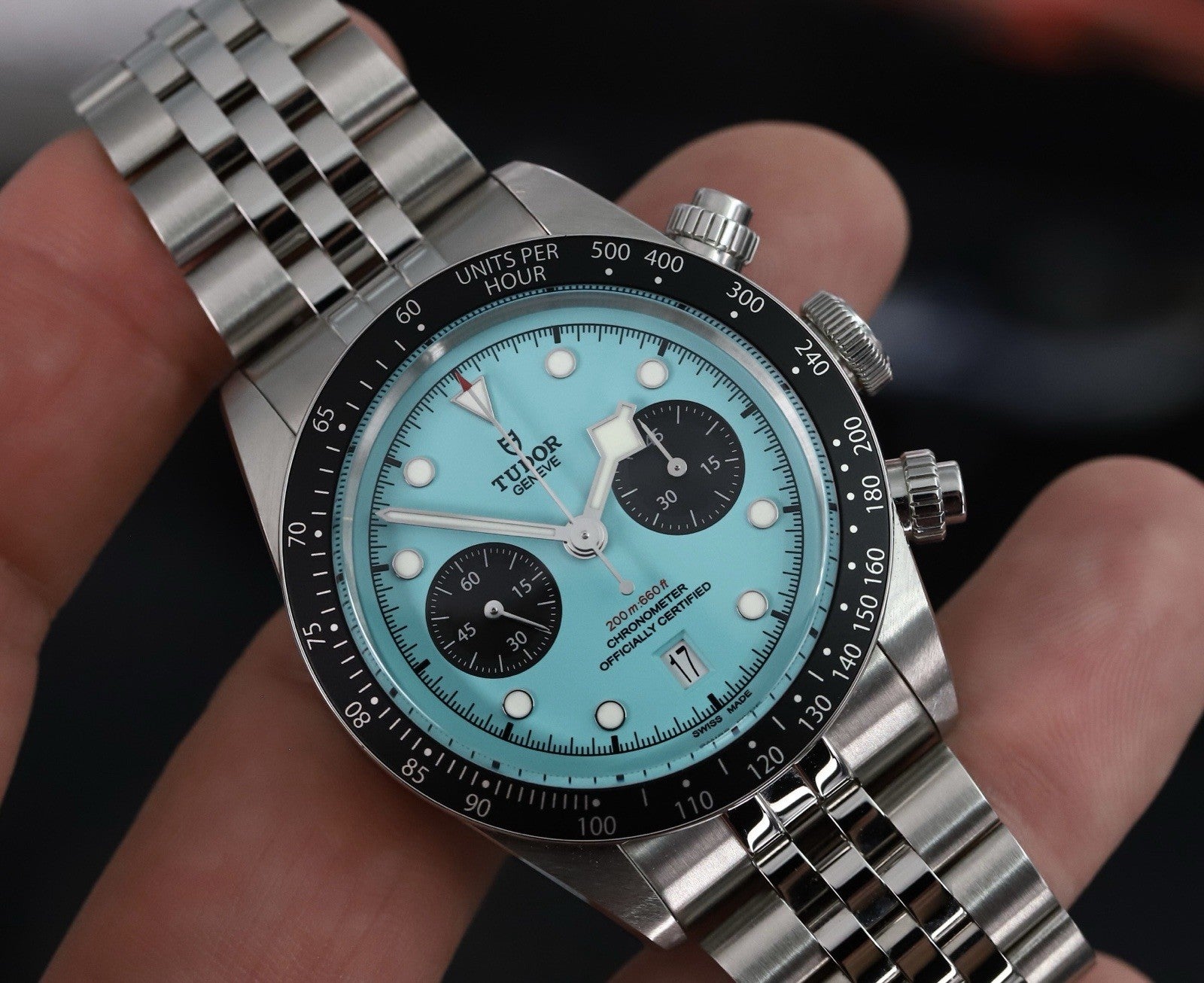The 41mm steel case is now thinner, while retaining it's 200m of water resistance and MT5813 automatic movement. Housed within that case is a special matte turquoise dial with black sub-dials, and a lovely touch of red for the depth rating evoking images of the 6263 Daytona. Mounted to Tudors steel Jubilee bracelet, its a special version of a brilliant piece. And with its limited production, it has become highly sought after and quite hard to come by.