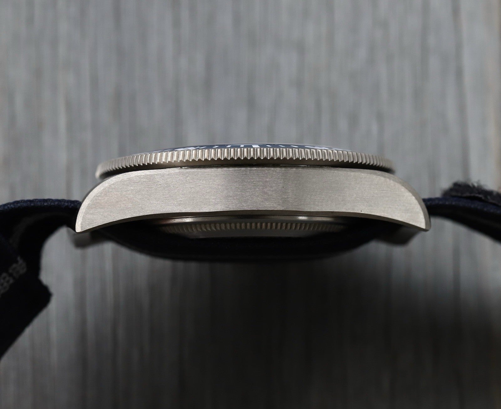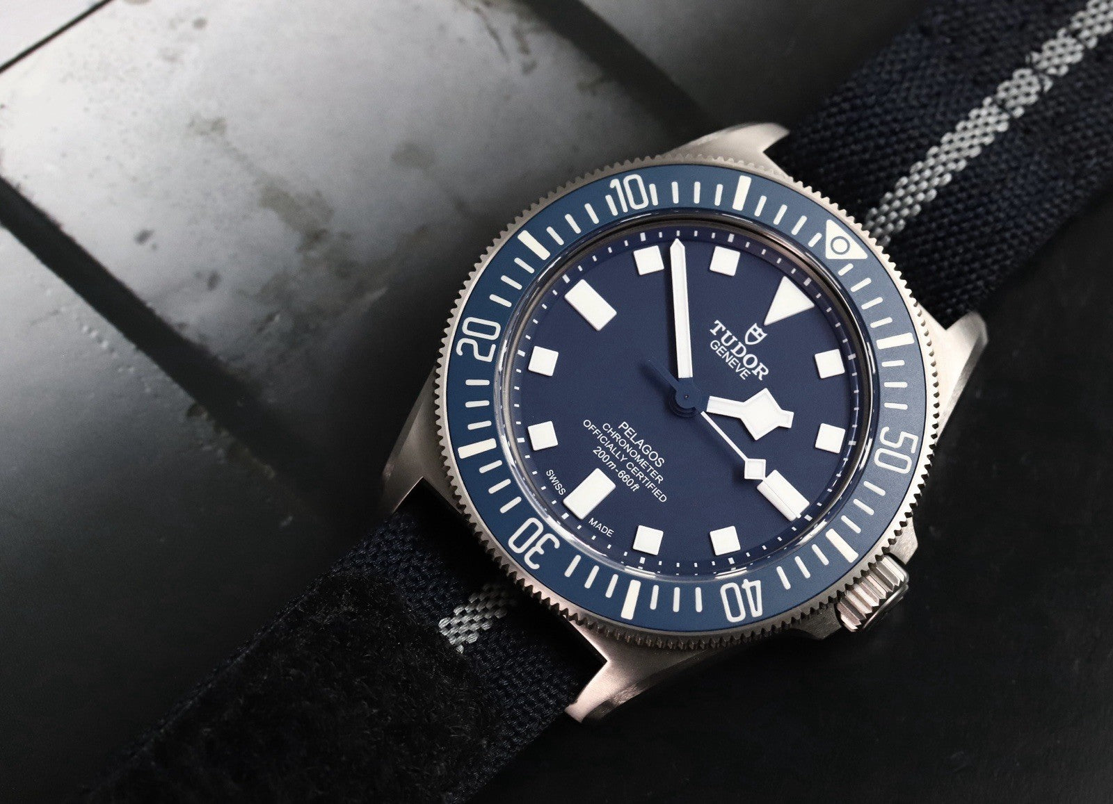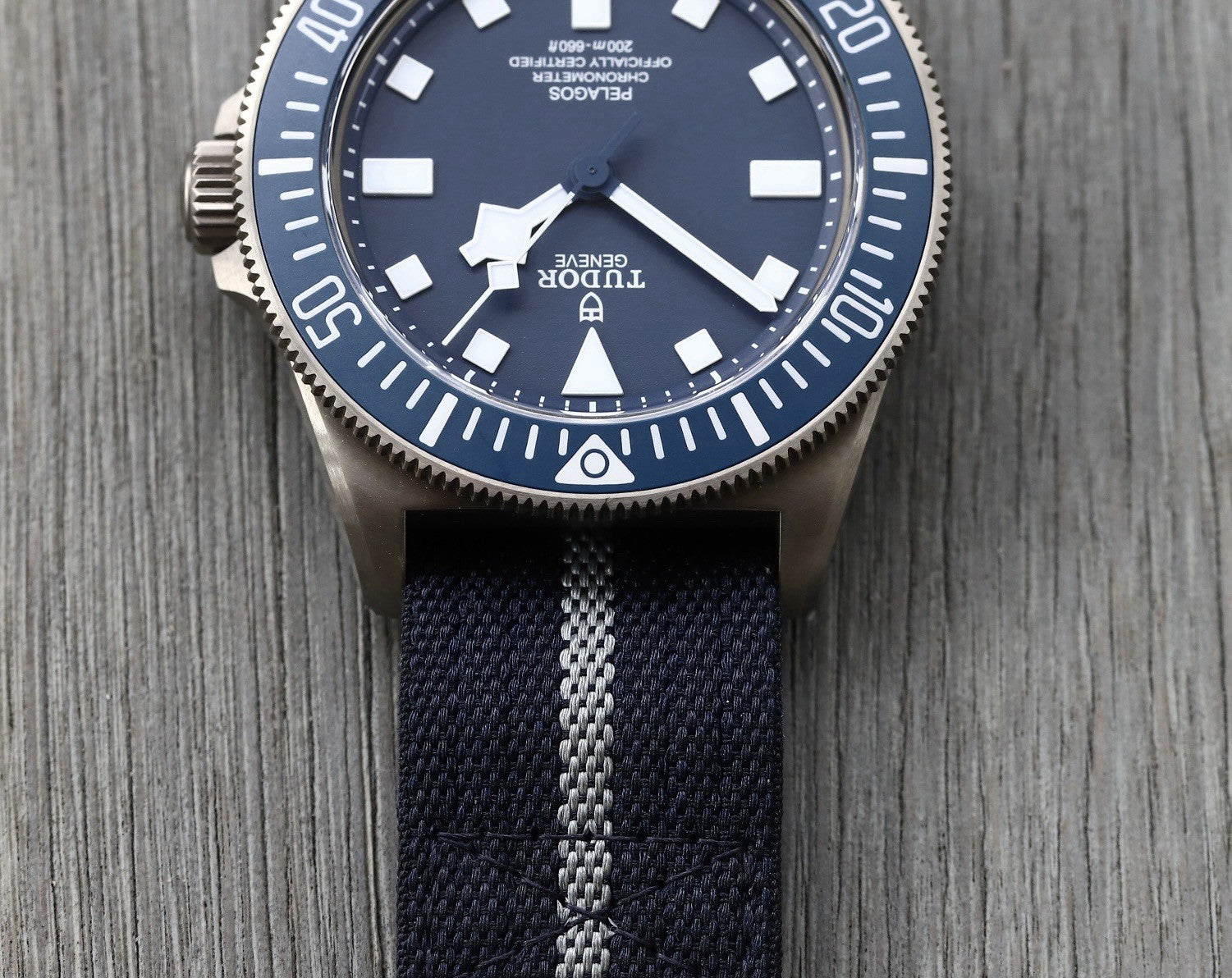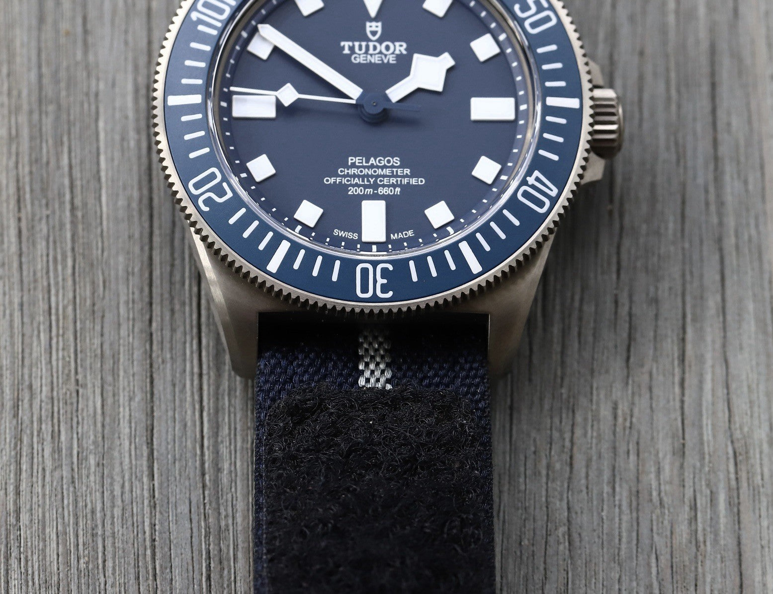Utilising a new 42mm case with fixed lugs, it's far thinner than a regular Pelagos at 12.75mm thick. This is always noticeable as the dial is far closer to the sapphire crustal than on a regular Pelly. It houses a super-legible navy blue dial with white markers and classic Snowflake hands, and is surrounded by a uni-directional dive bezel. Both are lumed to the nines. It's powered by the COSC MT5602 automatic movement, and comes equipped with an awesome fabric strap with velcro attachment, and a second rubber strap It's waterproof to 200m. Realistically, military are going to use G-Shocks or the like, but if they were wearing mechanical pieces in combat, this very much feels like what they'd be wearing.