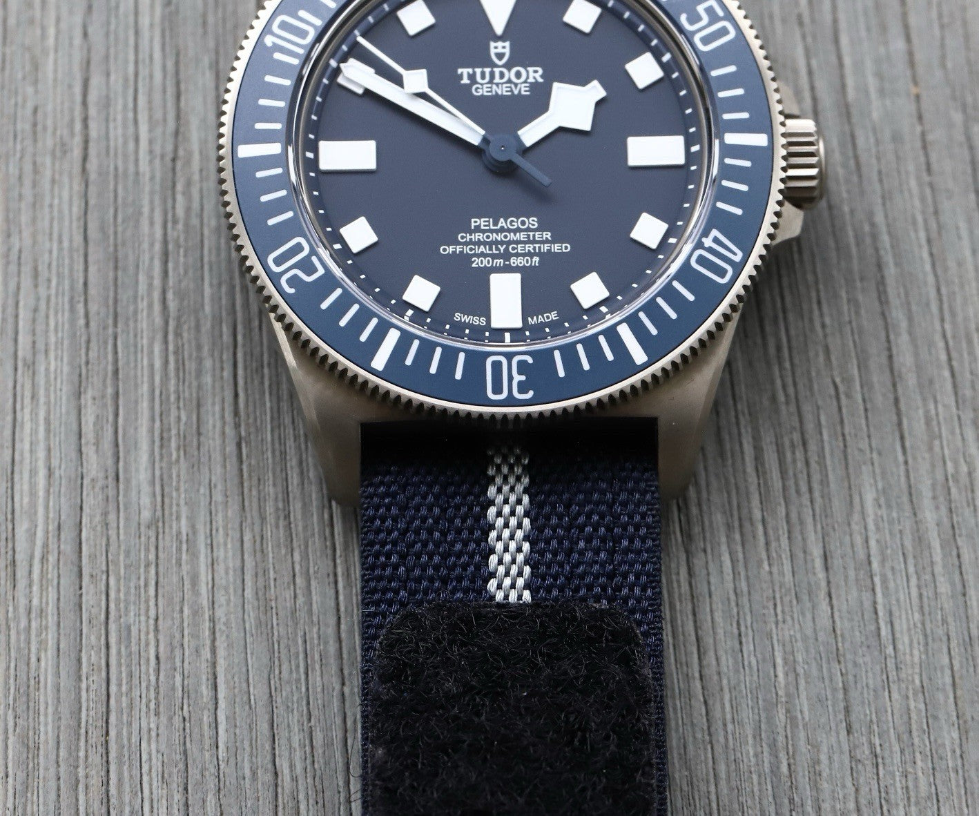 Utilising a new 42mm case with fixed lugs, it's far thinner than a regular Pelagos at 12.75mm thick. This is always noticeable as the dial is far closer to the sapphire crystal than on a regular Pelly. It houses a super-legible navy blue dial with white markers and classic Snowflake hands, and is surrounded by a uni-directional dive bezel. Both are lumed to the nines. It's powered by the COSC MT5602 automatic movement, and comes equipped with an awesome fabric strap with velcro attachment, and a second rubber strap, and it's waterproof to 200m. Realistically, military are going to use G-Shocks or the like, but if they were wearing mechanical pieces in combat, this very much feels like what they'd be wearing.