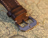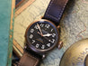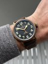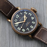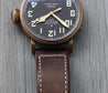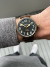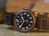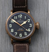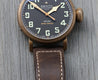 The bronze case is 45mm in diameter, a reasonably svelte for it's size 14.25mm thick, with a 54mm lug-to-lug with svelte lugs that allow the strap to go straight down on the wrist increasing comfort and wearability. The case back is fashioned in titanium to reduce weight, and also ensure it is hypoallergenic, and features a very cool engraving in relief. Within this case lies a classic Pilot's matte black dial with oversized numerals consisting of solid luminova, and a railroad minute track. It's topped with heavily lumed gilt cathedral hands.