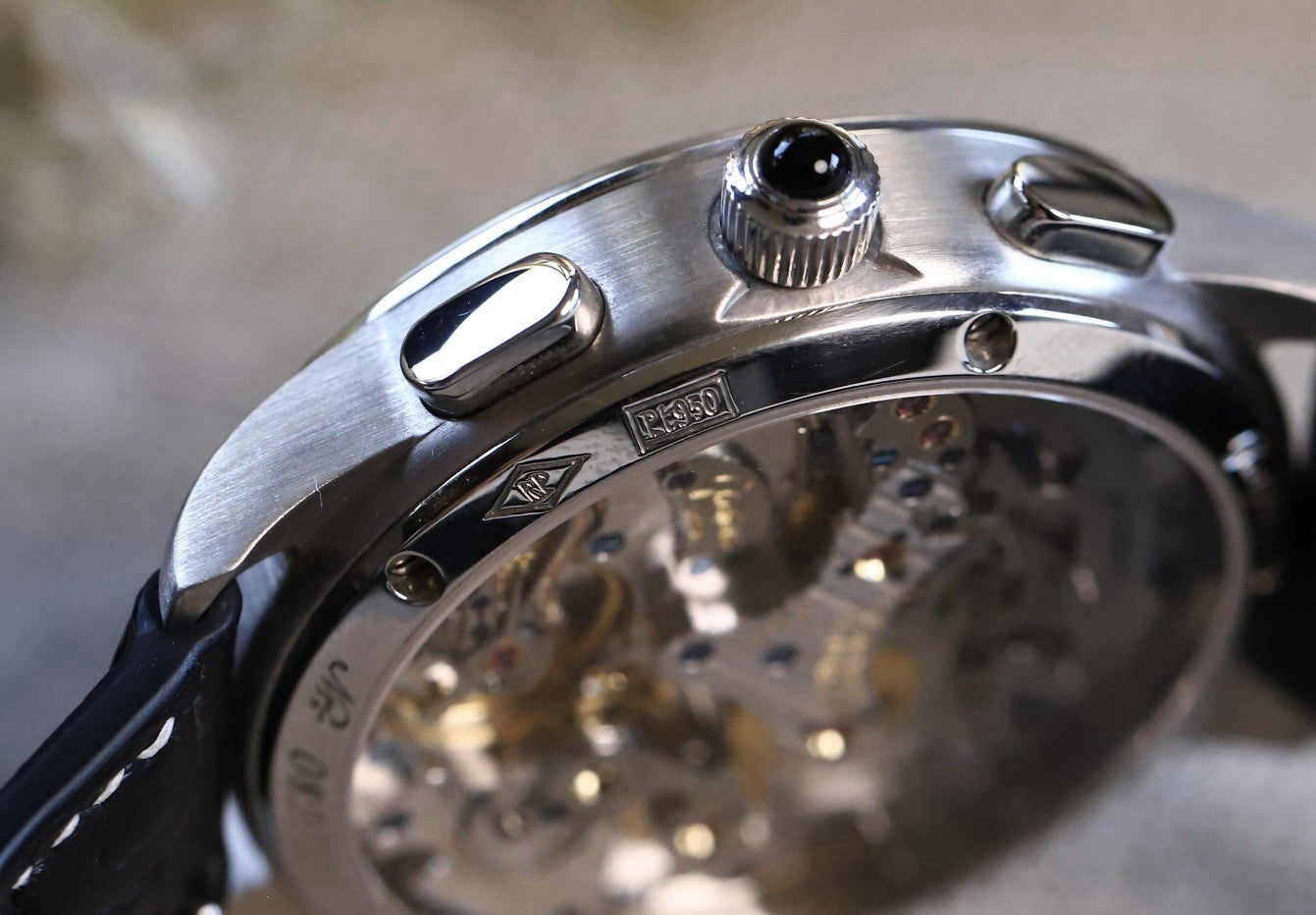Featuring a 39.5mm case crafted in platinum, it measures in at 13.2mm thick with a lug-to-lug of 45.8mm's. It's beautifully finished, with its soldered lugs being totally brushed, and the case is topped with a bezel in high polish, and sandwiched with a polished case back to help break up the side mass visually. This piece also features the correct cabochon crown, reserved for the limited 100 series which this is a part of, not the later series which featured a regular crown.