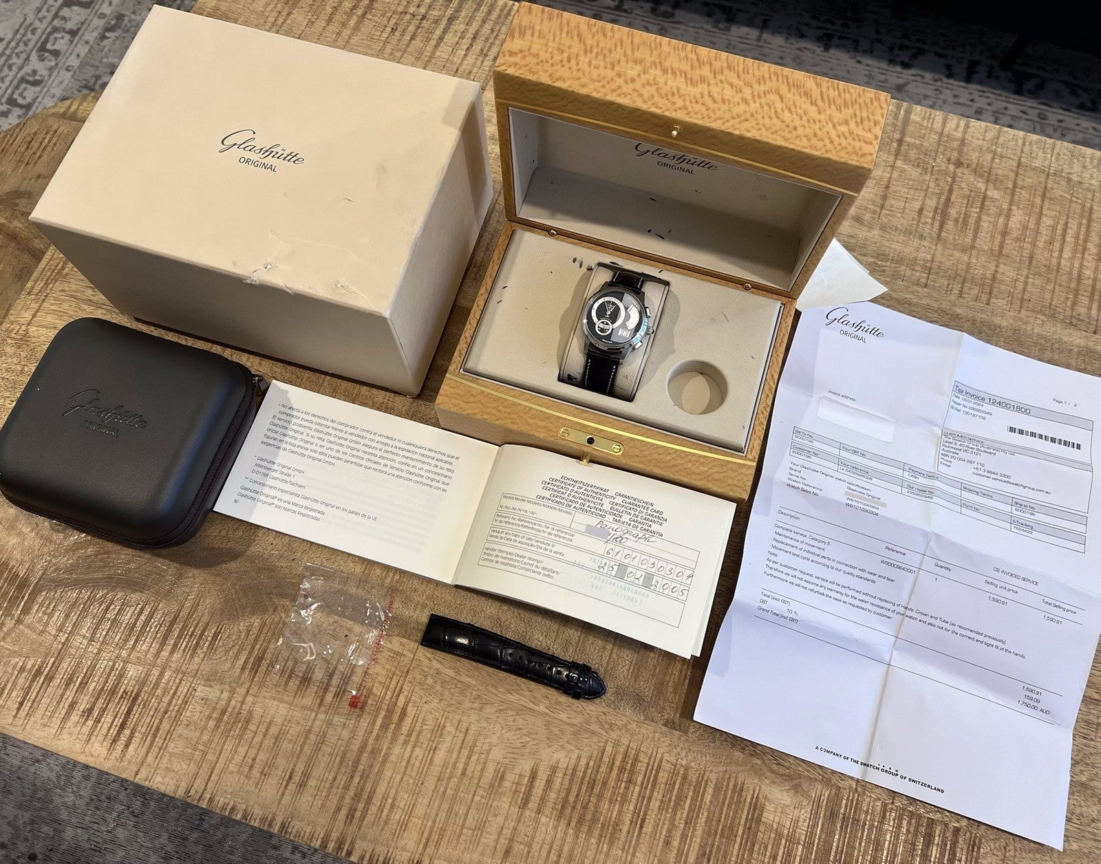 Was given a full service by Glashutte Original in 2024. Keeping COSC time when measured dial-up on a timegrapher. The previous owner instructed GO not to refinish the case. Watch remains under service warranty, though not for water resistance as the crown was not changed at service in order to retain the cabochon crown these first 100 examples featured.