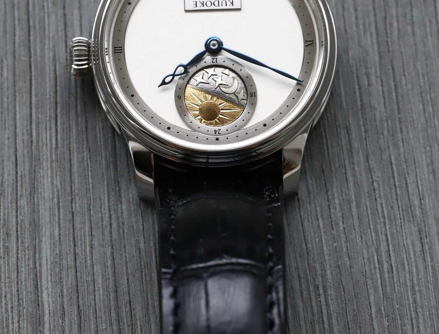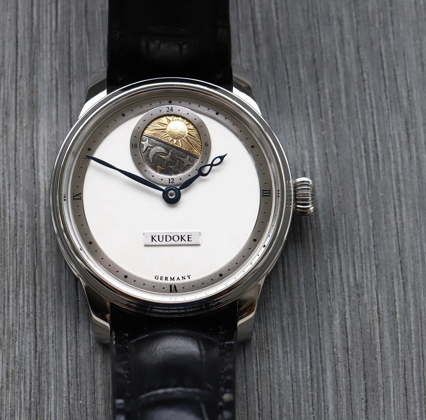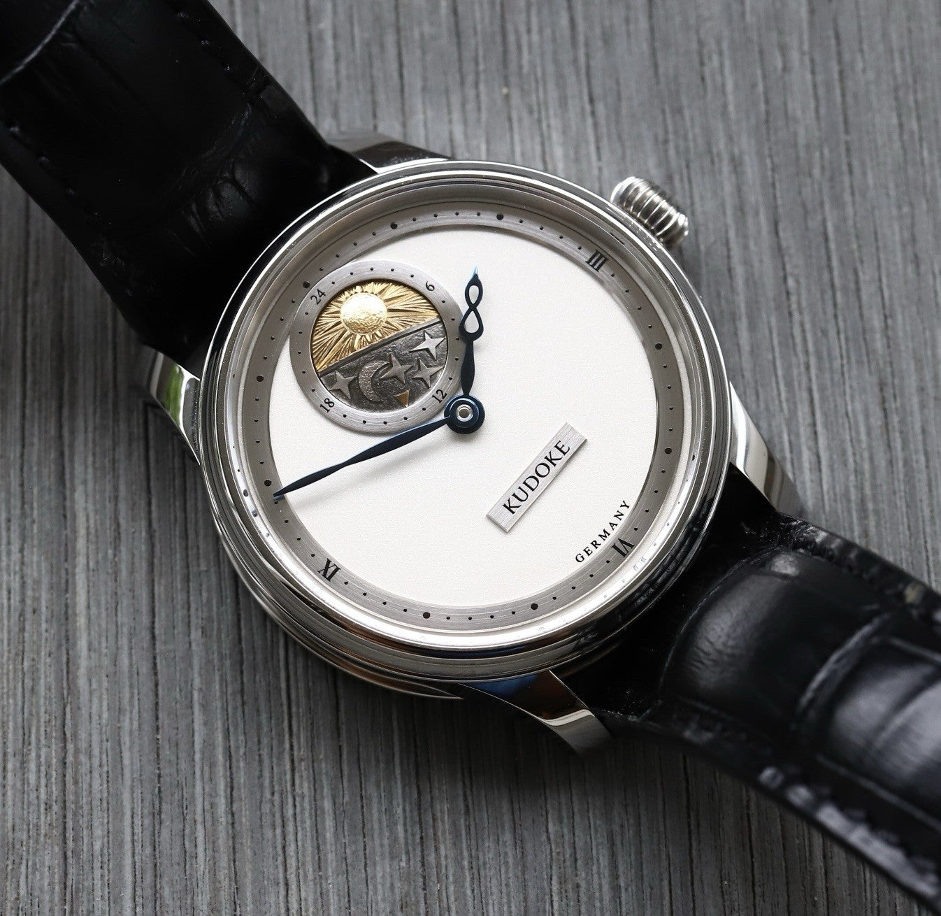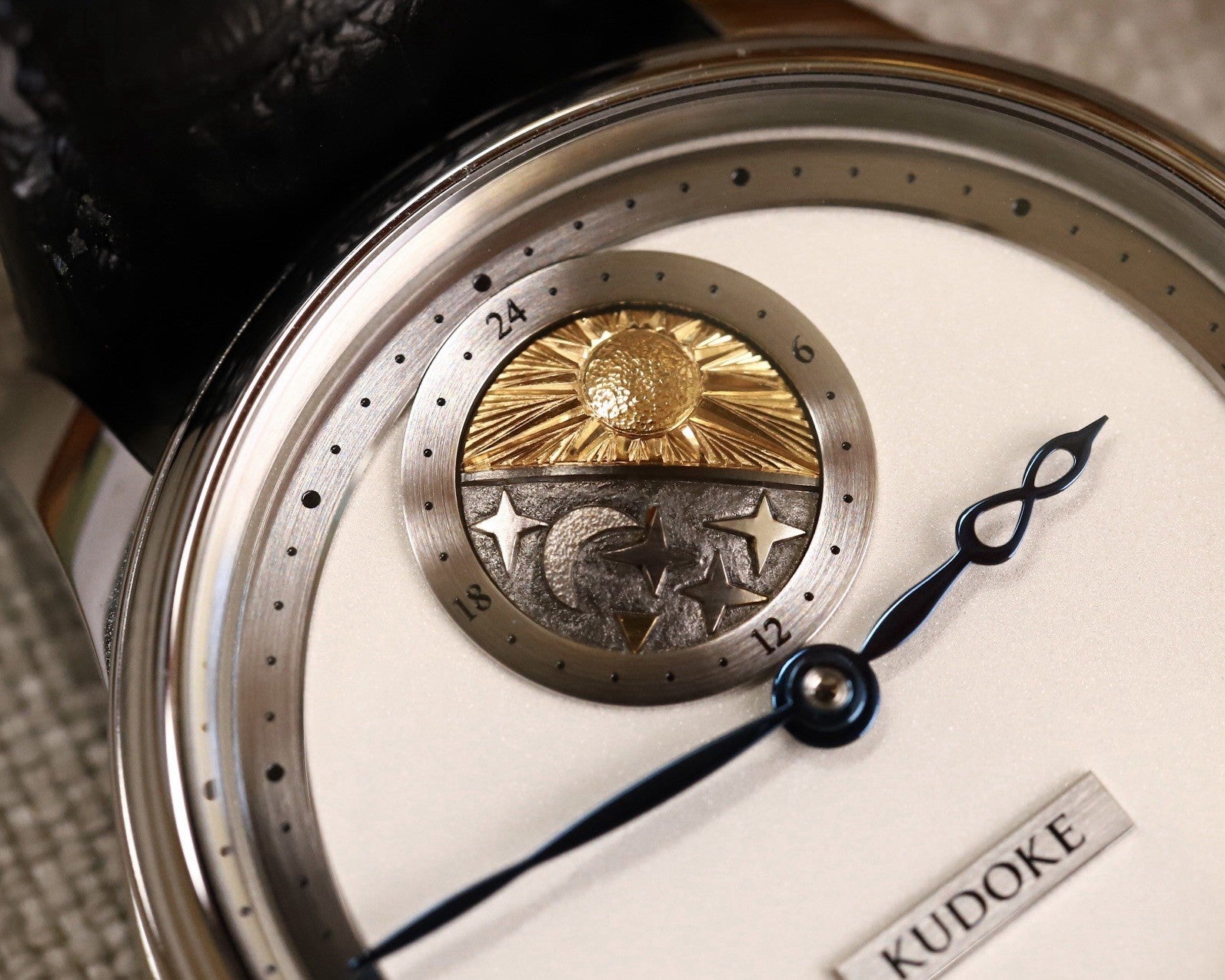 The piece we have here is the second amongst this HANDwerk (handmade) line, and is known simply as the K2. Featuring a 39mm case in steel, which stands at 10.7mm high. It is within this case that some proper magic lies. The base dial features a frosted white finish, with an outer rhodinized ring for the minute track. At 12 lies an intricate hand-engraved day/night indicator, electroplated in black & white rhodium aswell as yellow gold and looks absolutely spectacular in person. The hands are tempered blue steel, with the signature Kudoke infinity hour hand giving amazing legibility against the white of the dial.