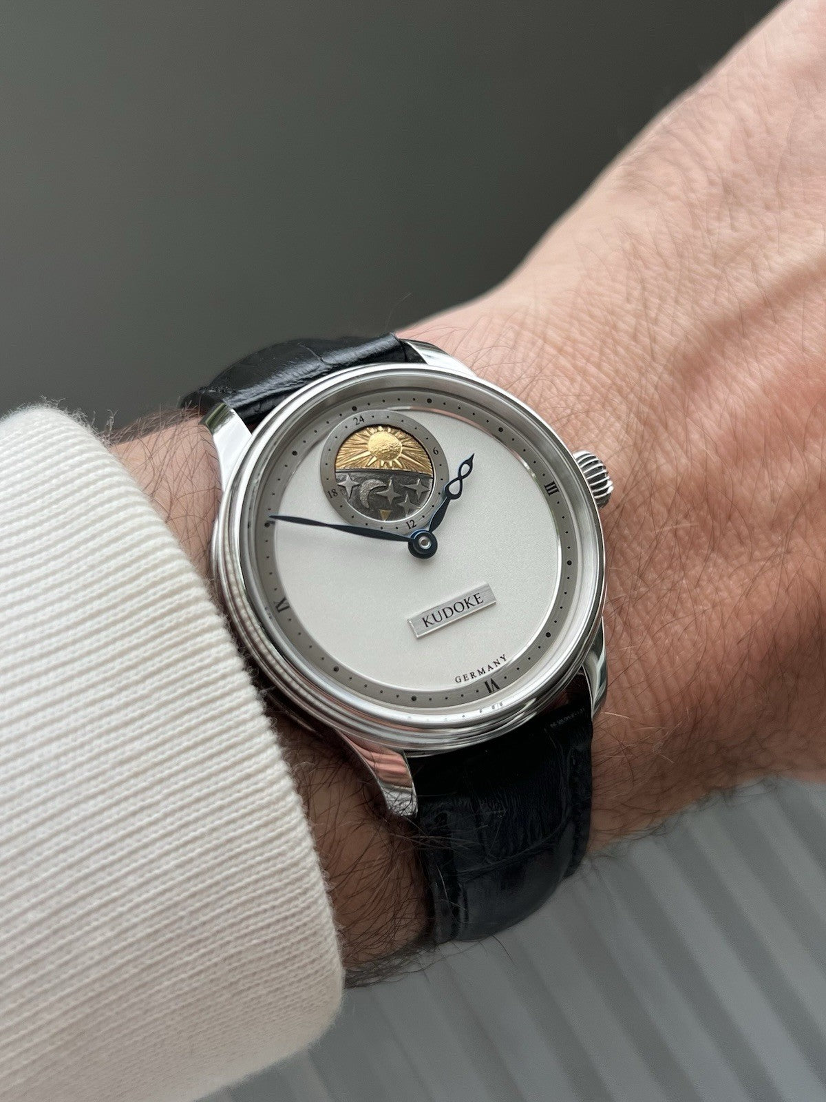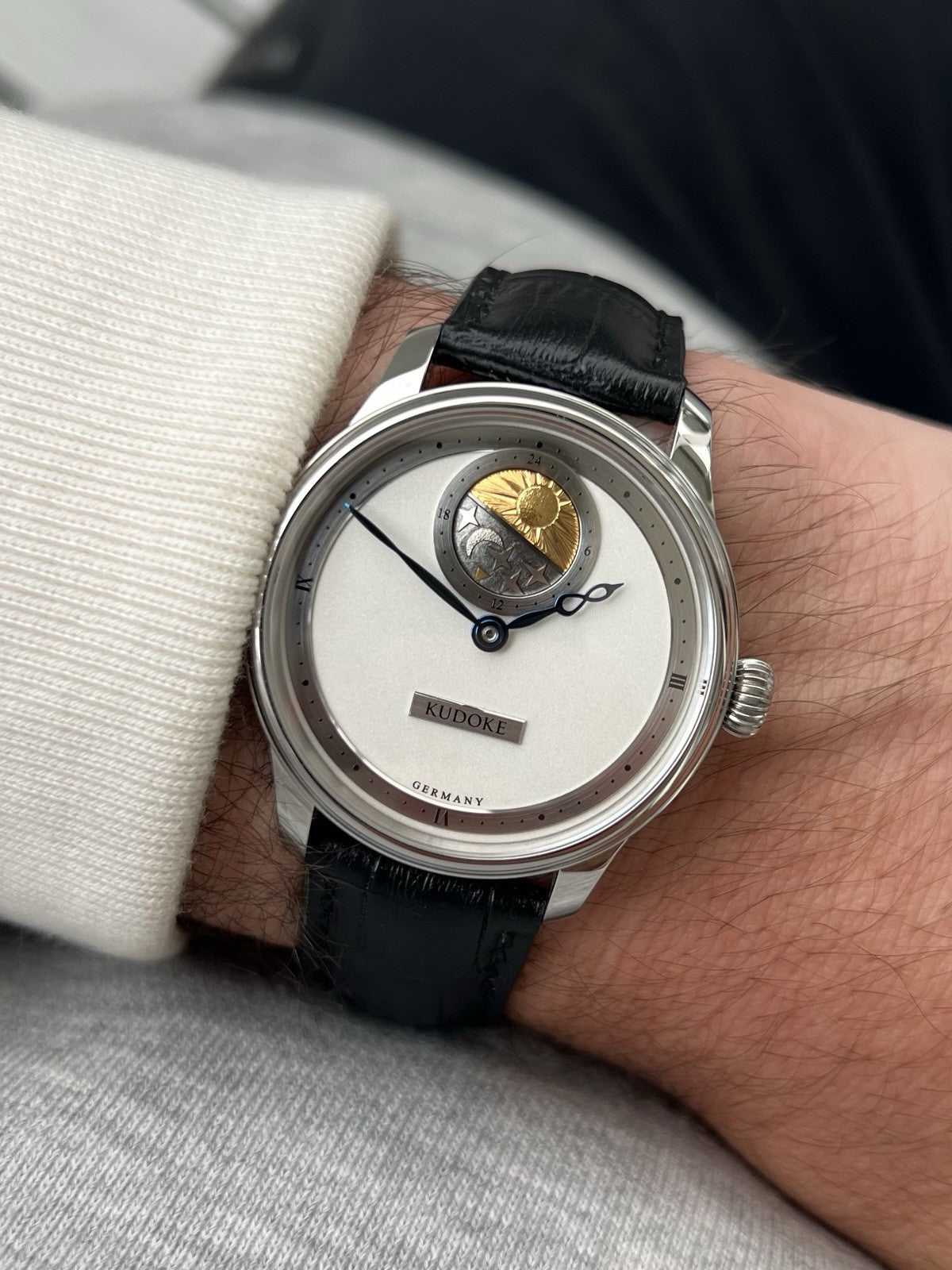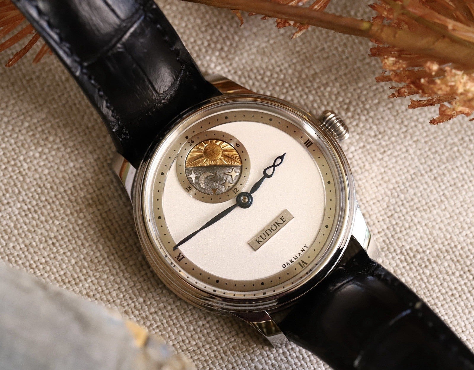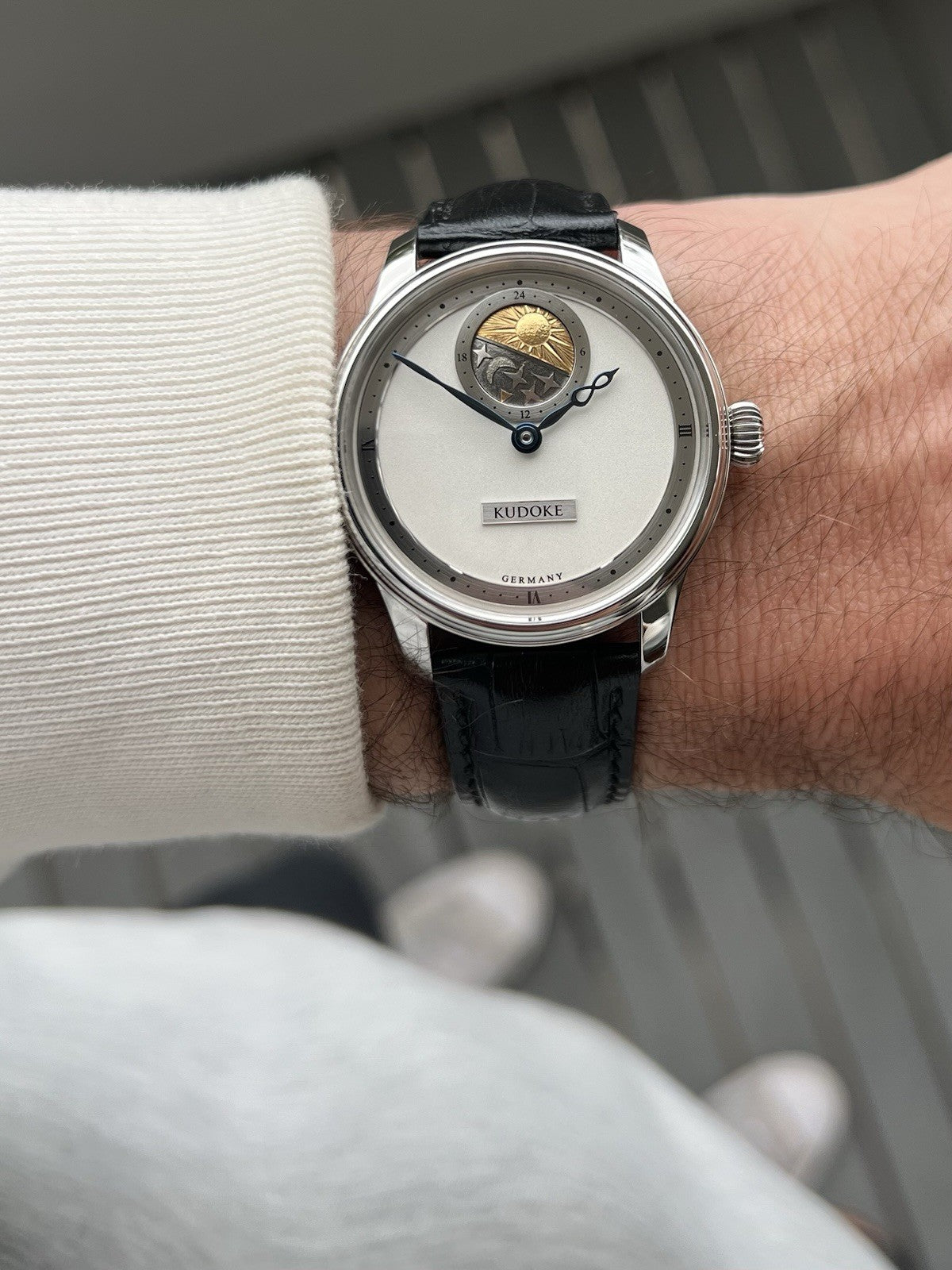 The piece we have here is the second amongst this HANDwerk (handmade) line, and is known simply as the K2. Featuring a 39mm case in steel, which stands at 10.7mm high. It is within this case that some proper magic lies. The base dial features a frosted white finish, with an outer rhodinized ring for the minute track. At 12 lies an intricate hand-engraved day/night indicator, electroplated in black & white rhodium aswell as yellow gold and looks absolutely spectacular in person. The hands are tempered blue steel, with the signature Kudoke infinity hour hand giving amazing legibility against the white of the dial.