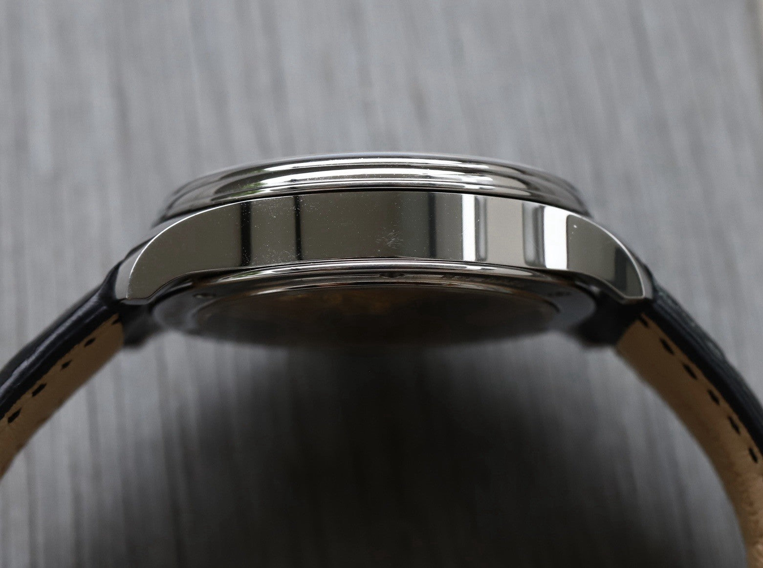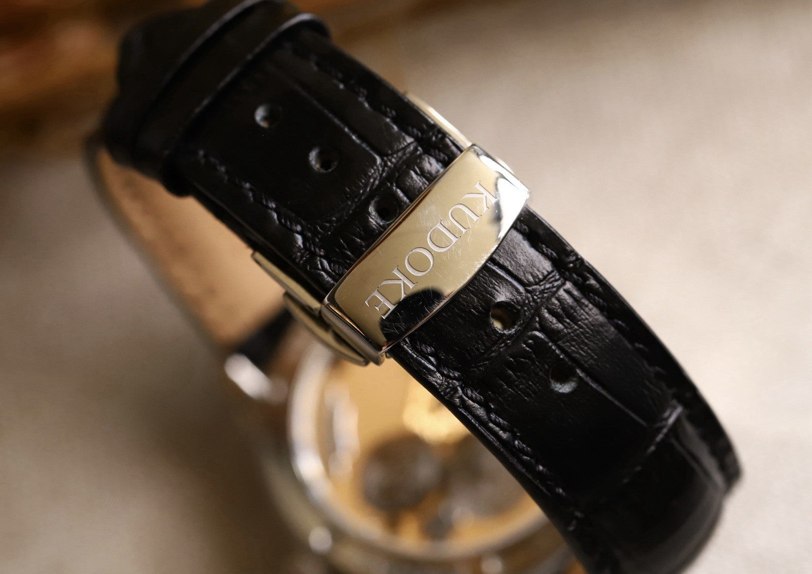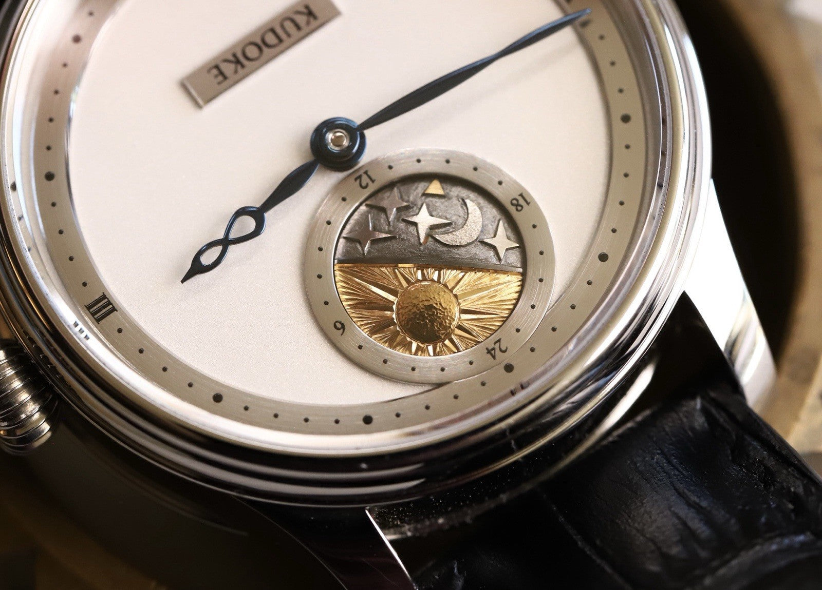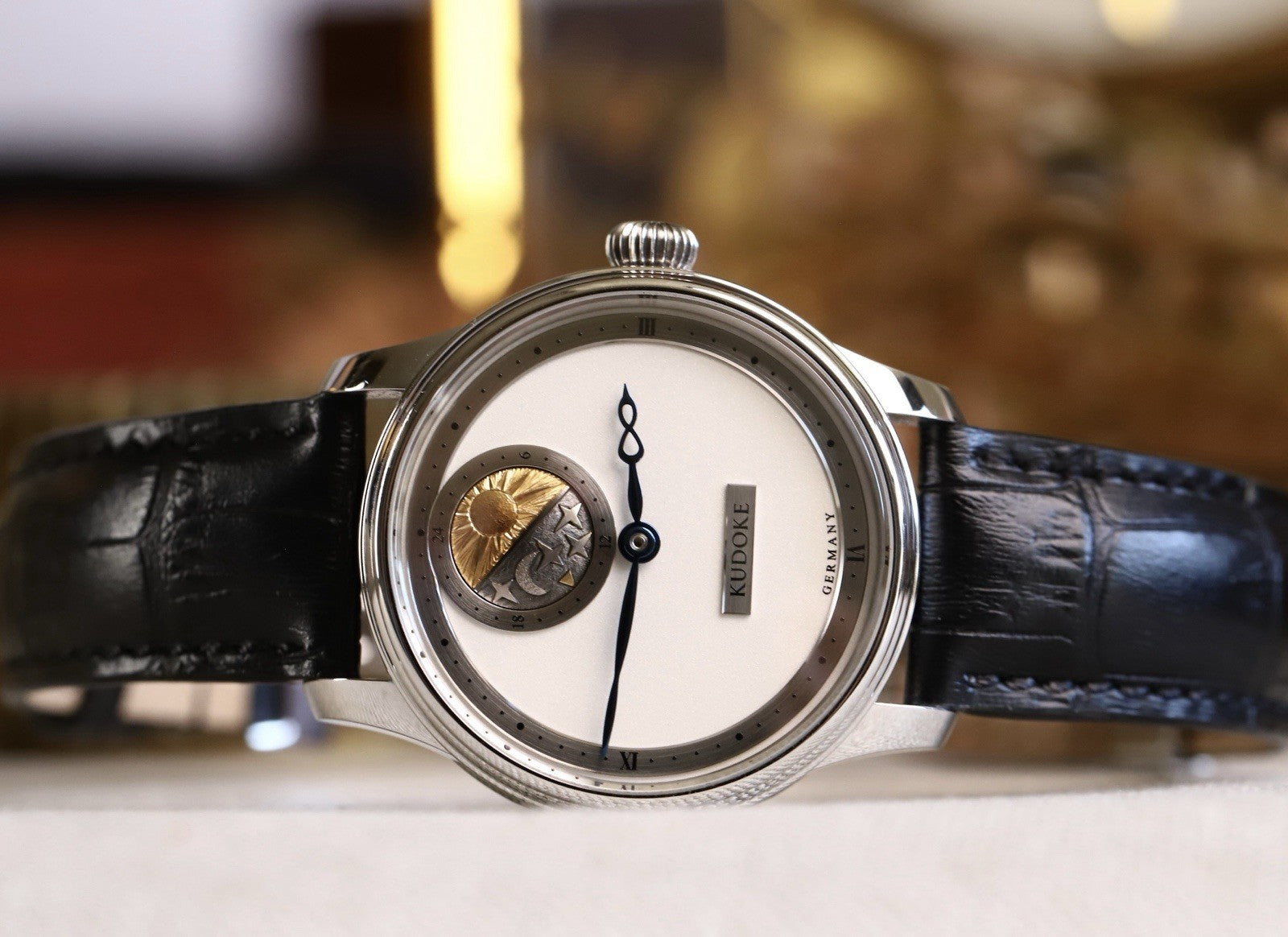 The piece we have here is the second amongst this HANDwerk (handmade) line, and is known simply as the K2. Featuring a 39mm case in steel, which stands at 10.7mm high. It is within this case that some proper magic lies. The base dial features a frosted white finish, with an outer rhodinized ring for the minute track. At 12 lies an intricate hand-engraved day/night indicator, electroplated in black & white rhodium aswell as yellow gold and looks absolutely spectacular in person. The hands are tempered blue steel, with the signature Kudoke infinity hour hand giving amazing legibility against the white of the dial.