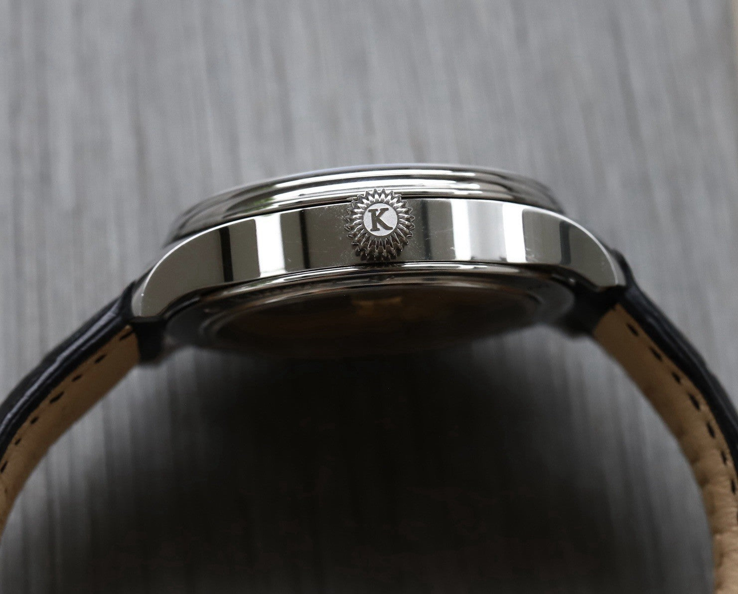 Mounted to a Kudoke 'gator strap with tang buckle. Strap is near-new and remains very stiff, with some minor desk diving marks on the buckle.