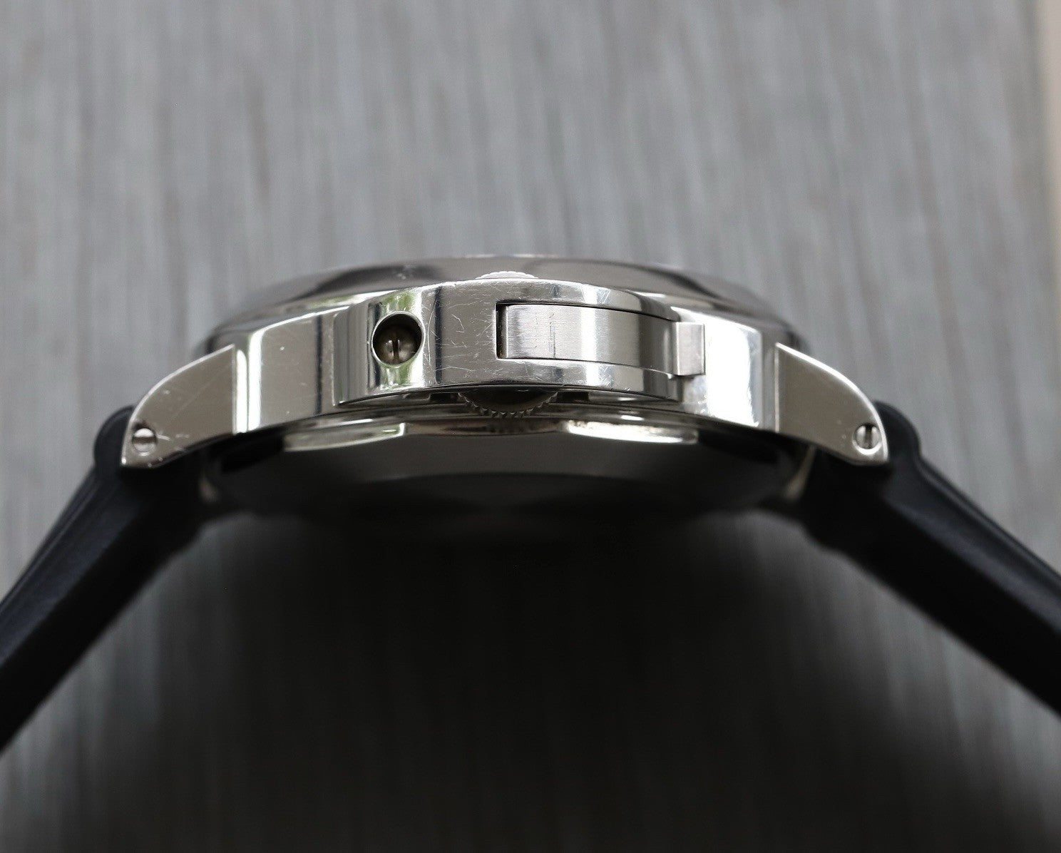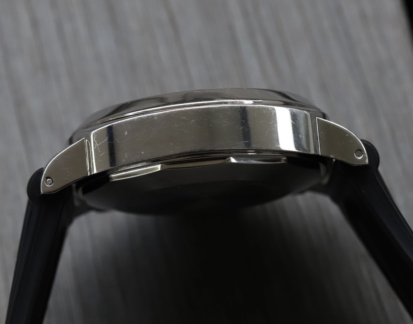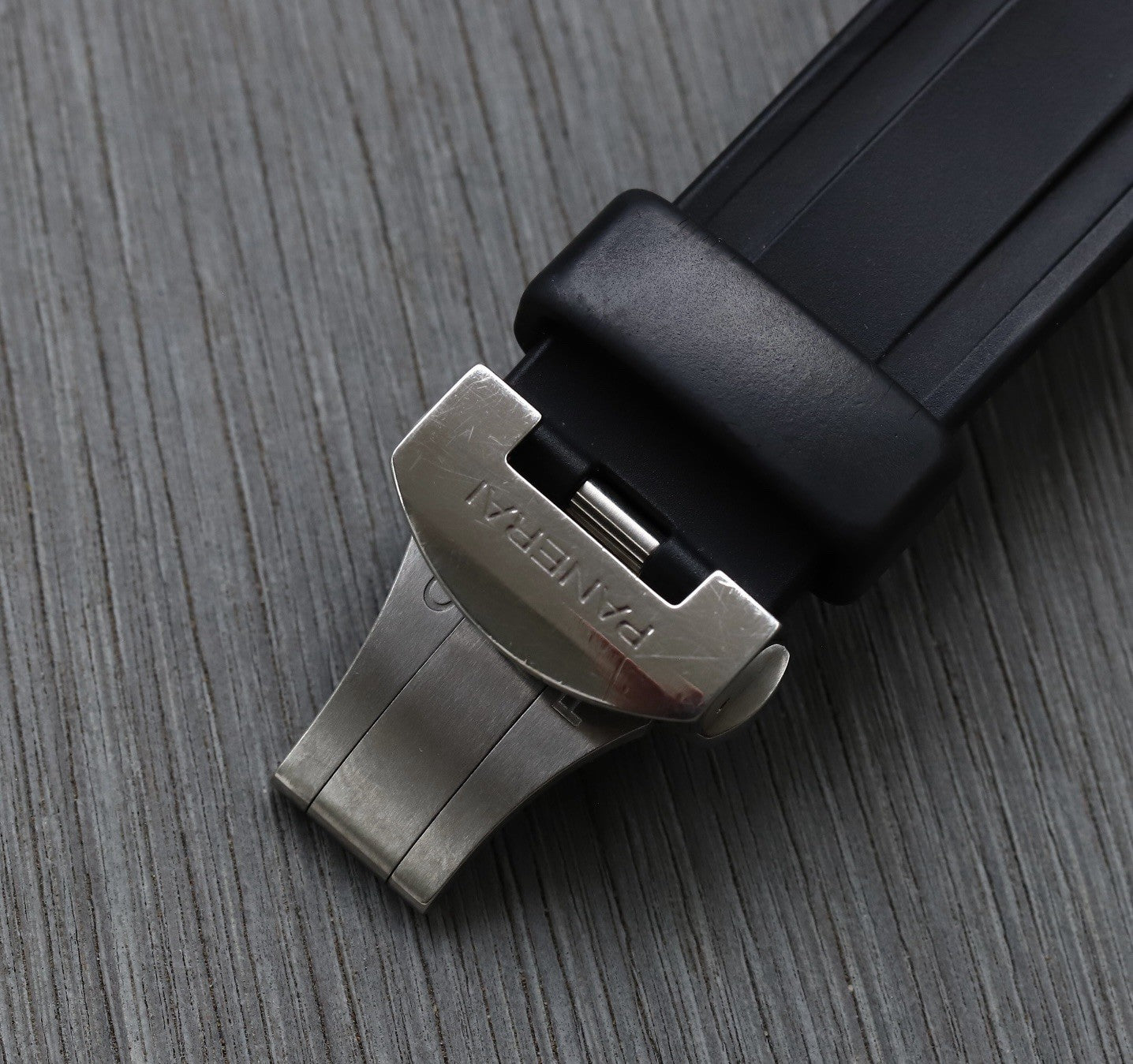 Currently mounted on a classic Panerai Black rubber strap on Panerai deployant. The strap is in decent condition, with some cracking present, but still has life left. Buckle shows desk dive marks.