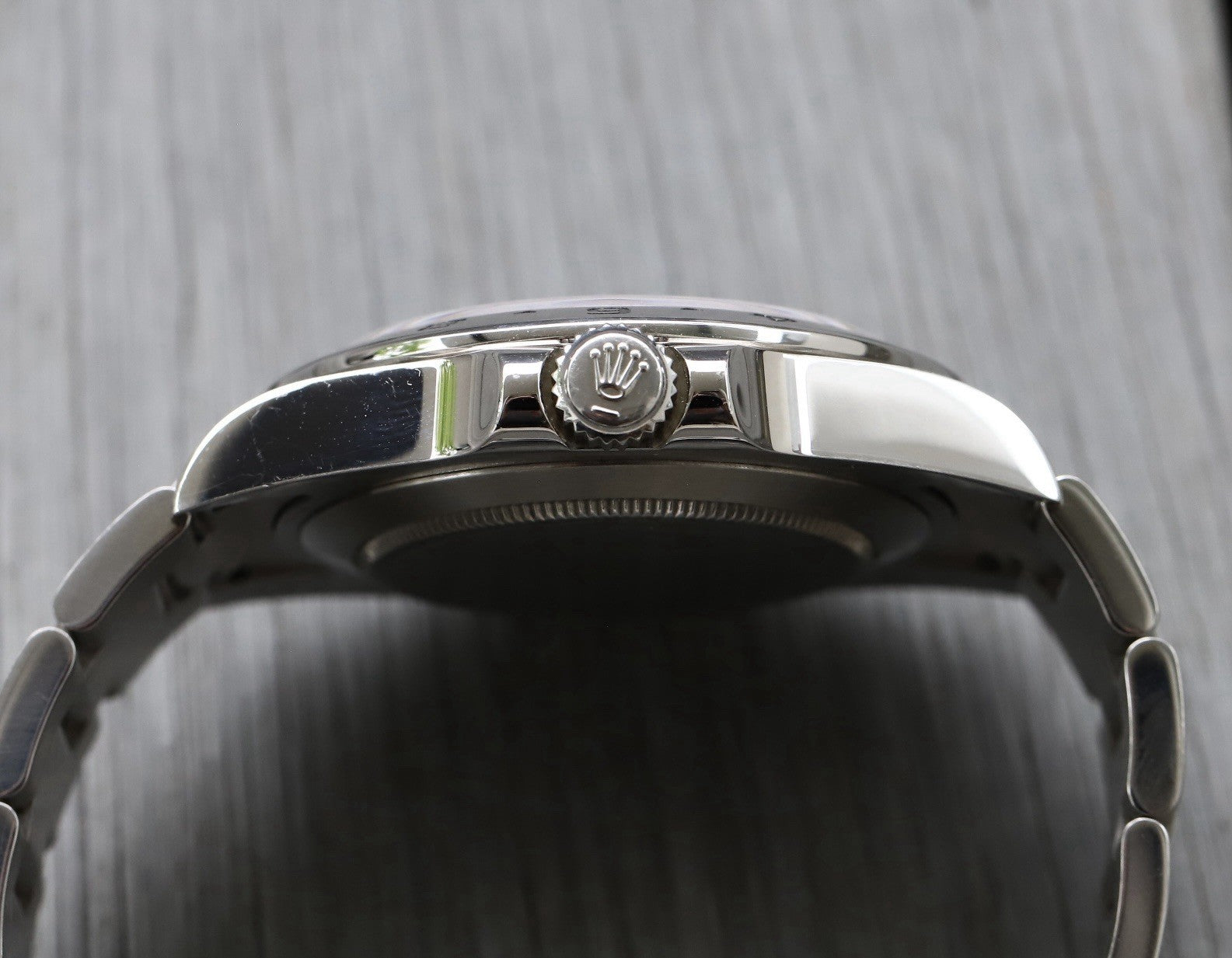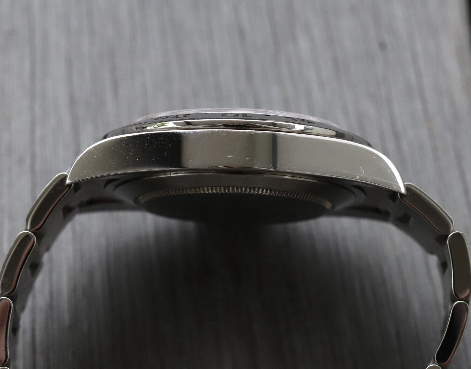 This particular piece dates from 2011 presents in TZ 'Excellent' condition. The case has scratching present on the sides, and some small 'flea bites' where the polished sides meet the brushed surfaces on the lugs. Bezel shows some minor rub marks and small scratches. Crystal has a small chip on its outer edge between 1 and 2. Please see images for full condition details.