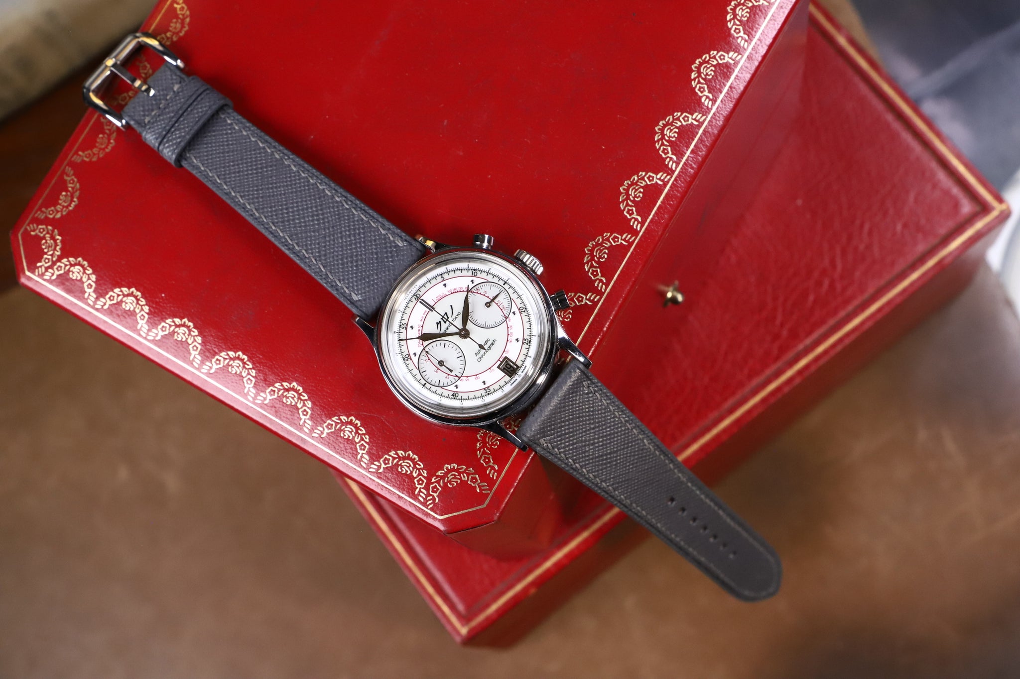 Saffiano Leather main face, water-resistant and soft Zermatt specialized lining. The inner part of the strap has a Velodon specialized reinforced material (SH-220 reinforcement) that helps to keep your watch firmly attached to your wrist while also being comfortable for all-day wear.