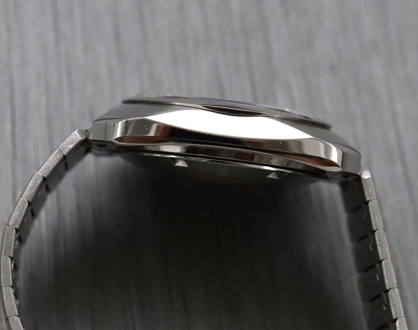 A very cool and seldom seen vintage Grand Seiko, the 6145-8020 is often referred to as the 'Pillow' by collectors thanks to it's unique case shape. It's a super interesting case, with soft brushed section on the top intersected by sharp, angular polished sections, and is unlike anything else. It measures in at 36.5mm x 41.2mm, and given its cushion style case tends to wear larger than a round watch of similar measurements.