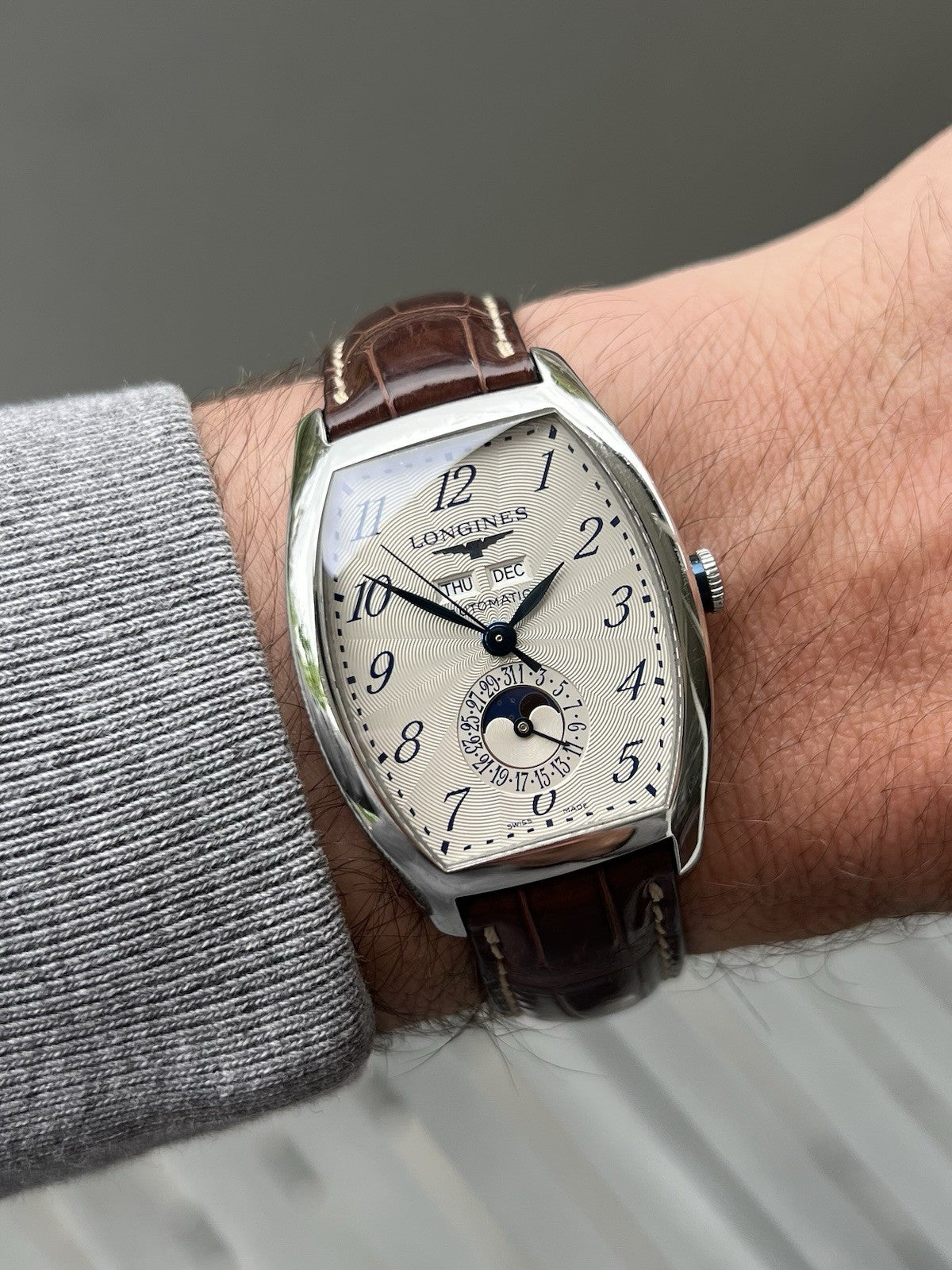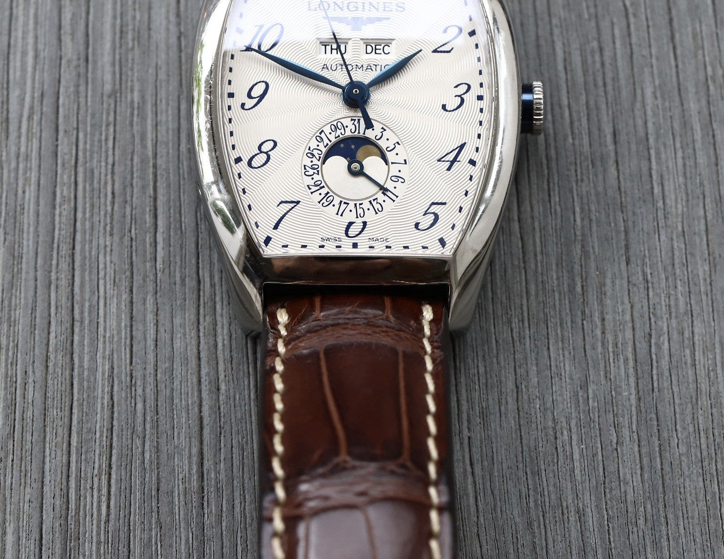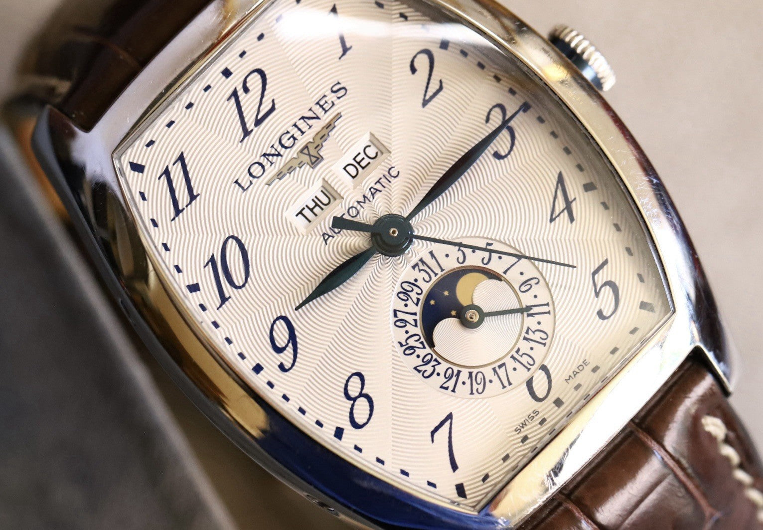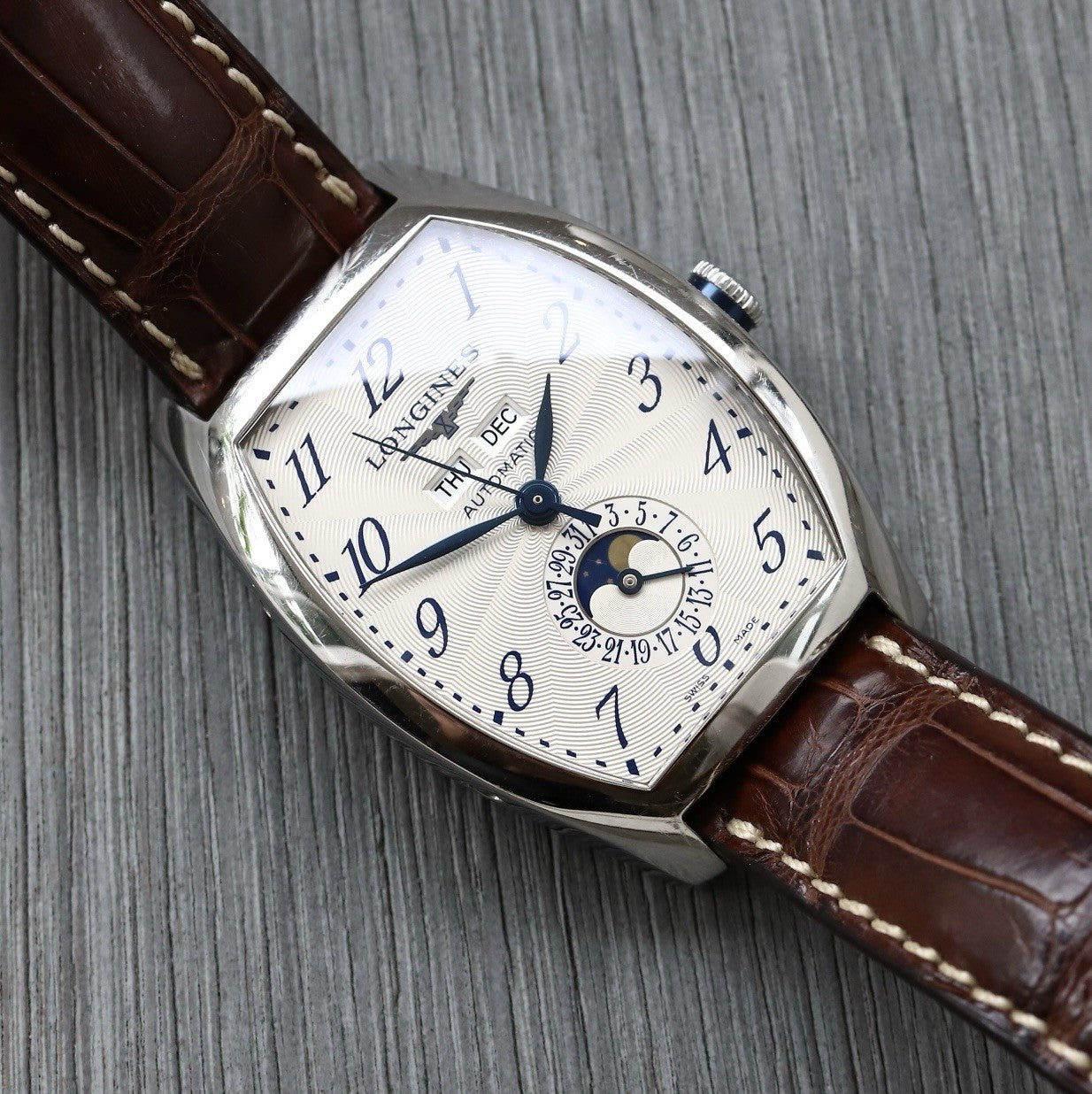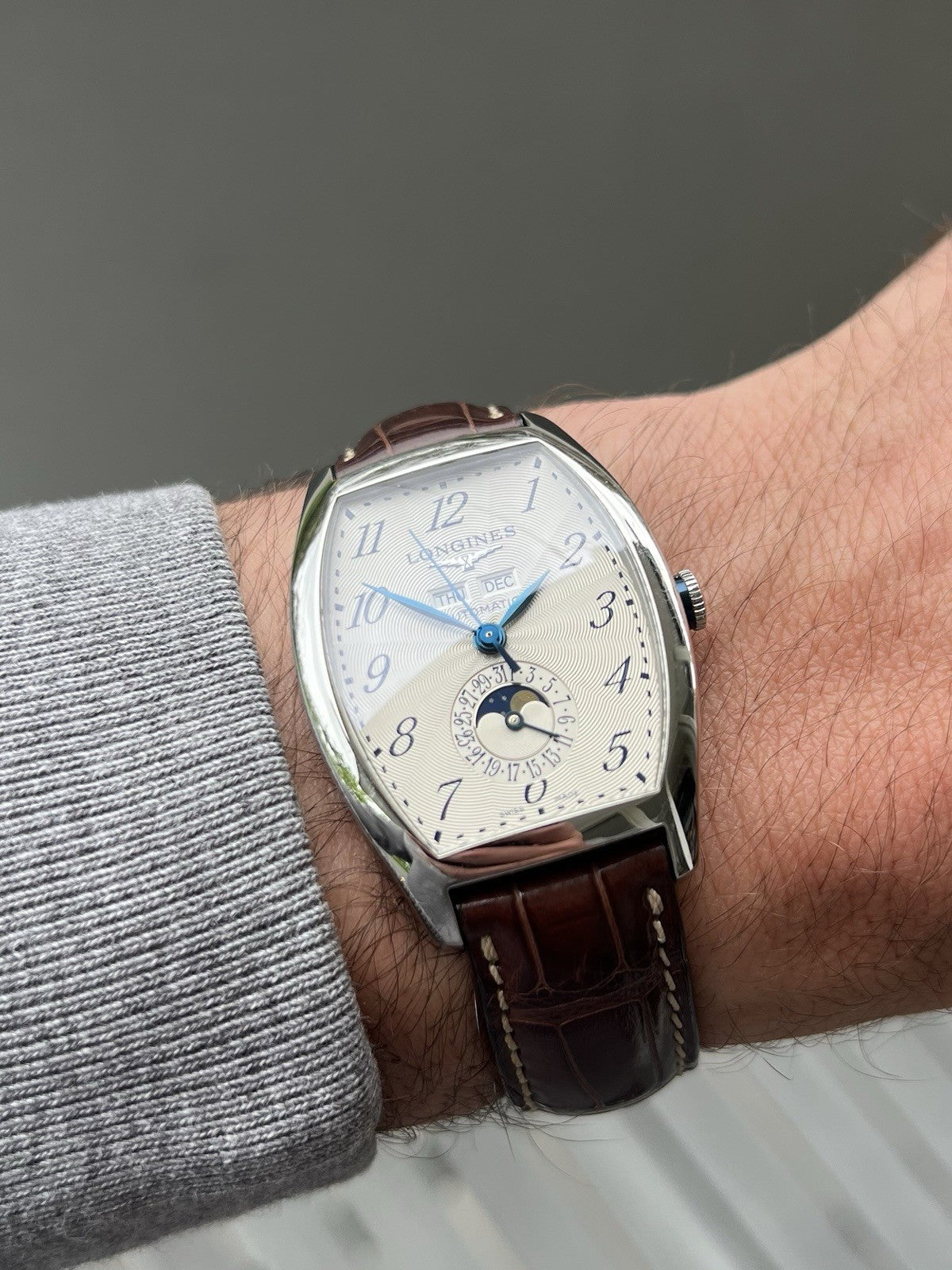 This particular reference is the L26714784, which features a magnificent tonneau-shaped case in steel that measures in at 33.1mm x 38.75mm x 11.85mm, and has a lovely curvature allowing it to hug the wrist. Within this case lies a silver opaline dial with radiating guilloche pattern and blue arabic numerals to match the blued feuille hands. Beneath the applied Longines logo sits the day and month windows, and at 6 you'll find a beautiful moonphase within the pointer-date sub-dial. The dial layout is very clean and crisp, packing in a lot of info while never feeling cluttered, in part due to the use of the tonneau-case allowing the information to be spread out across the dial.