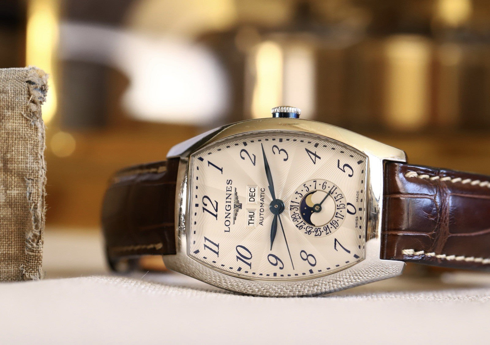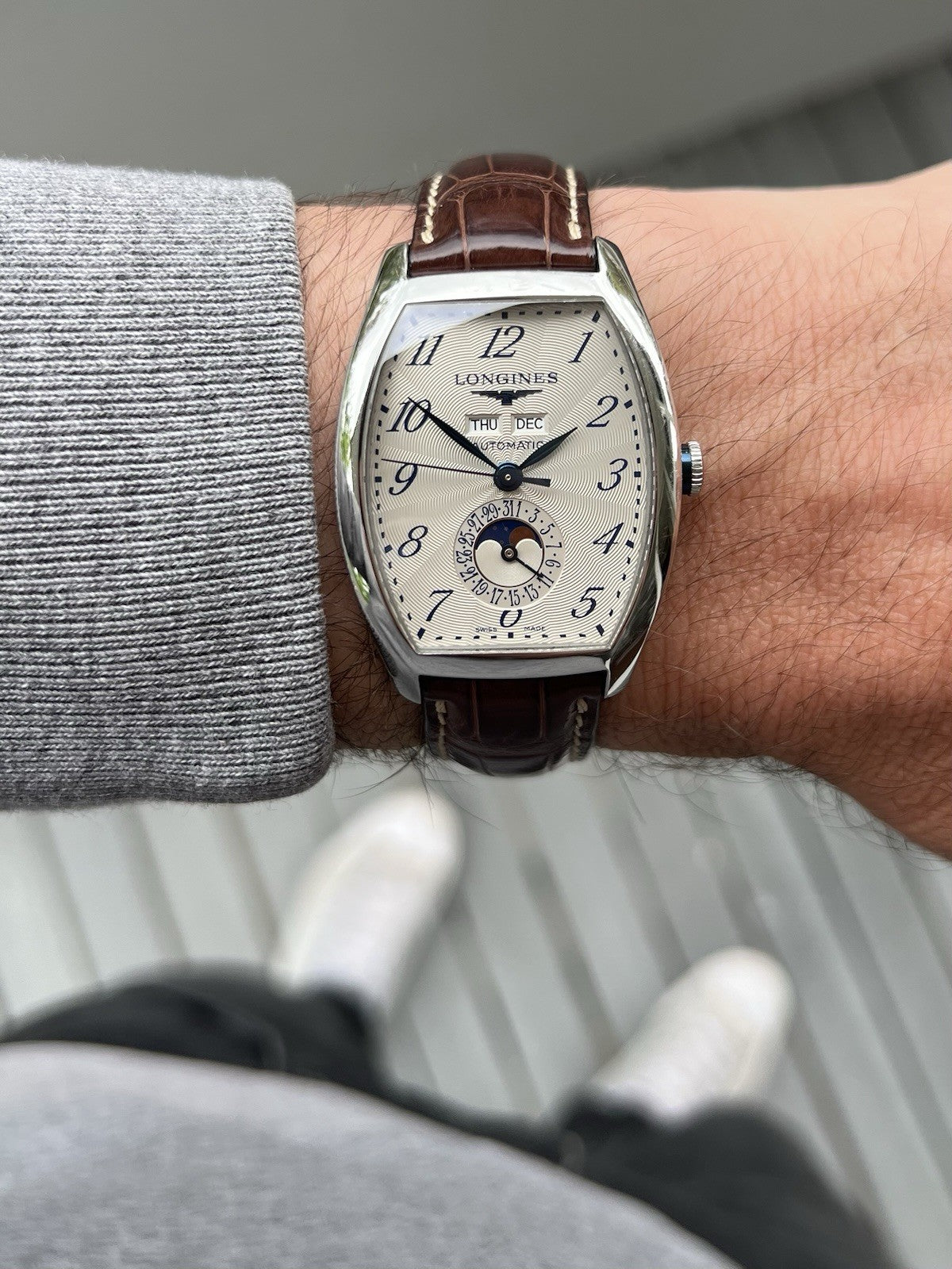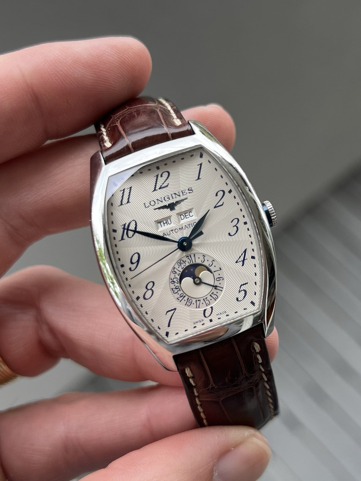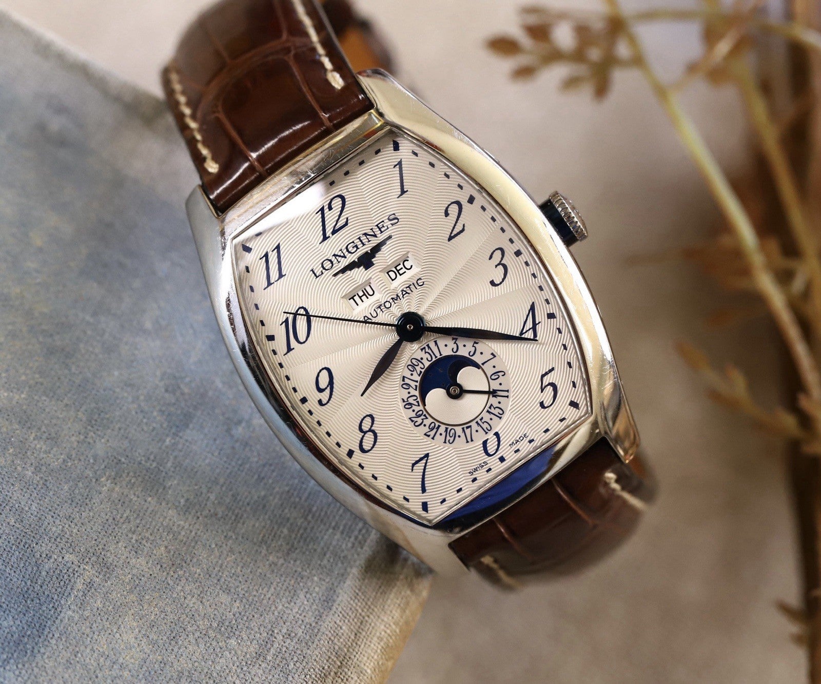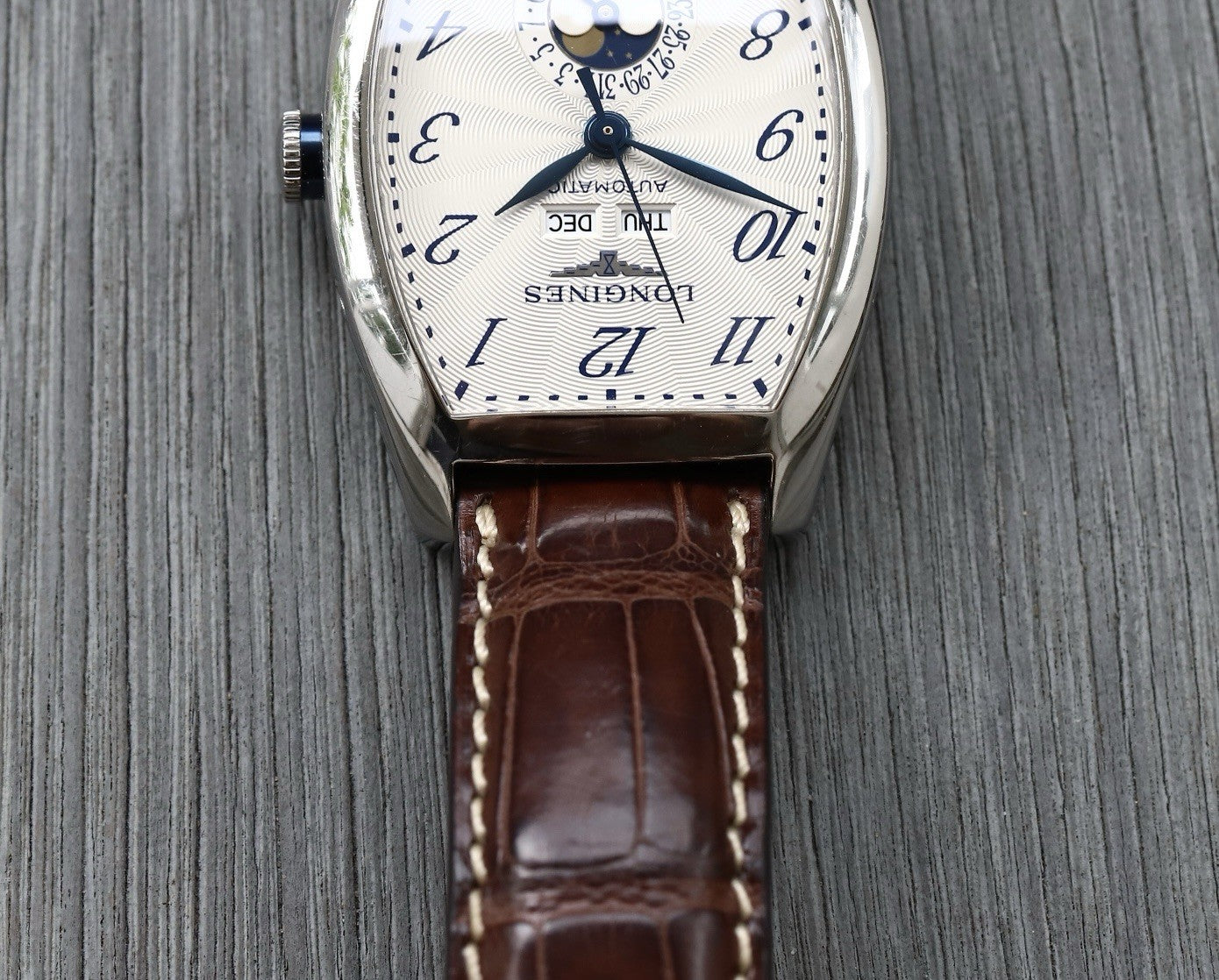 This particular reference is the L26714784, which features a magnificent tonneau-shaped case in steel that measures in at 33.1mm x 38.75mm x 11.85mm, and has a lovely curvature allowing it to hug the wrist. Within this case lies a silver opaline dial with radiating guilloche pattern and blue arabic numerals to match the blued feuille hands. Beneath the applied Longines logo sits the day and month windows, and at 6 you'll find a beautiful moonphase within the pointer-date sub-dial. The dial layout is very clean and crisp, packing in a lot of info while never feeling cluttered, in part due to the use of the tonneau-case allowing the information to be spread out across the dial.