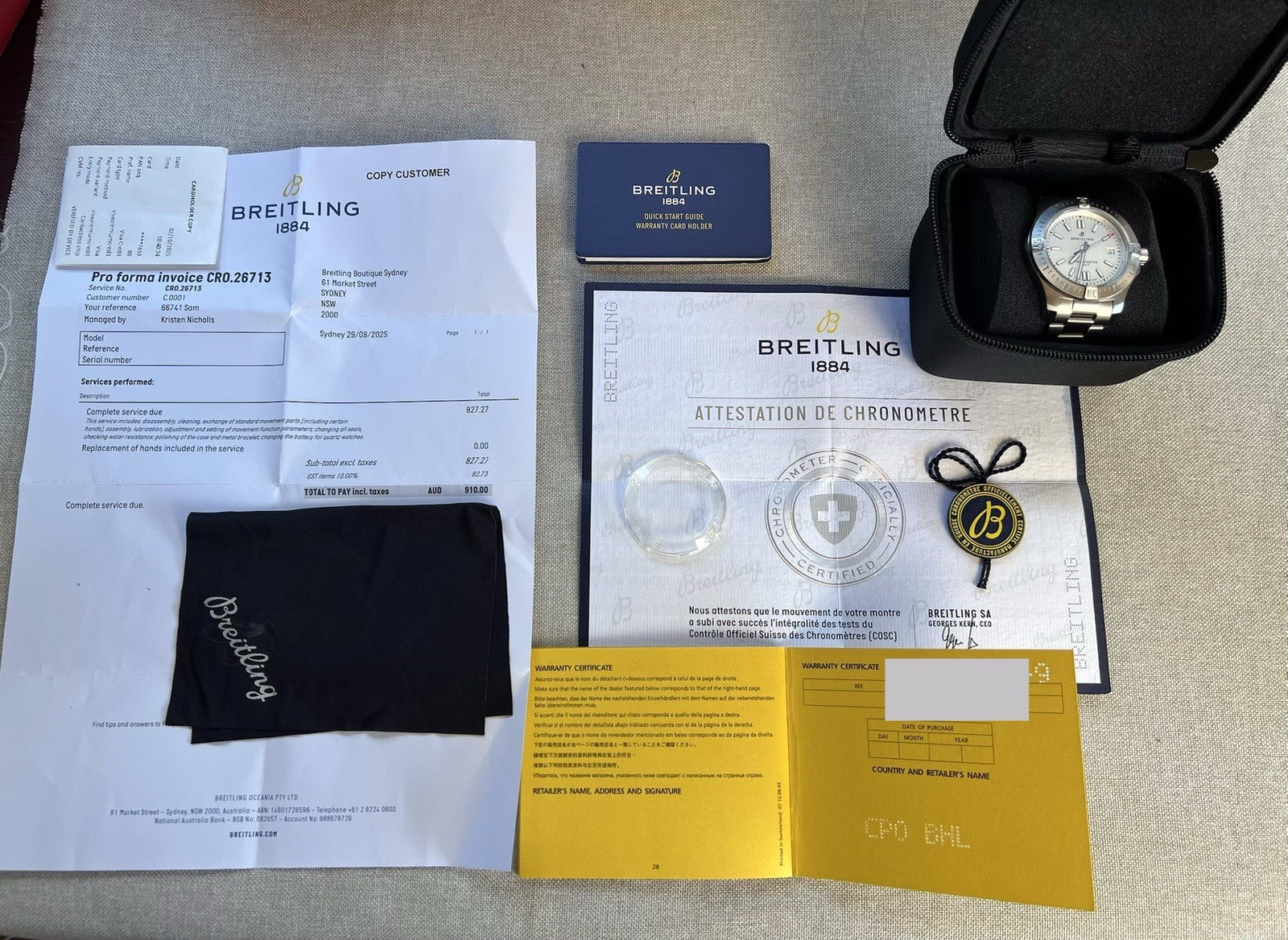 Paraphernalia: Breitling service case, service receipt, cleaning cloth, bezel protector, warranty booklet (undated), hang tag, instruction booklet, and Chronometre certificate