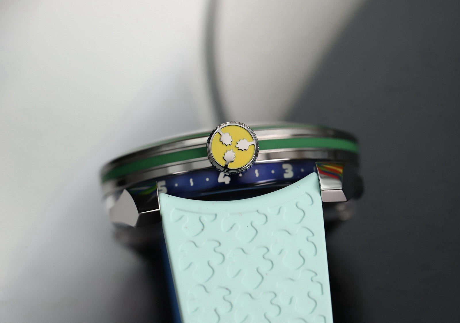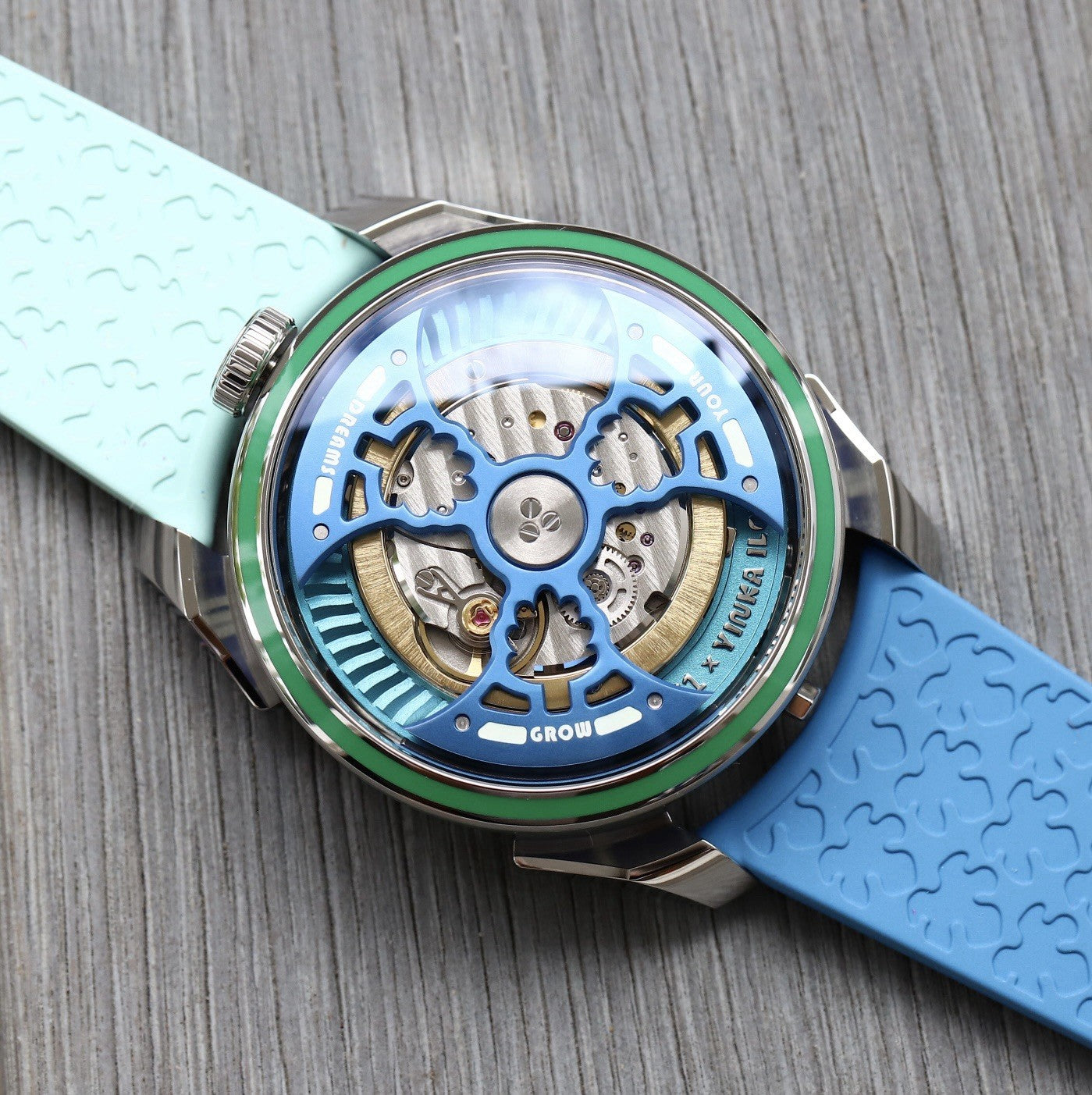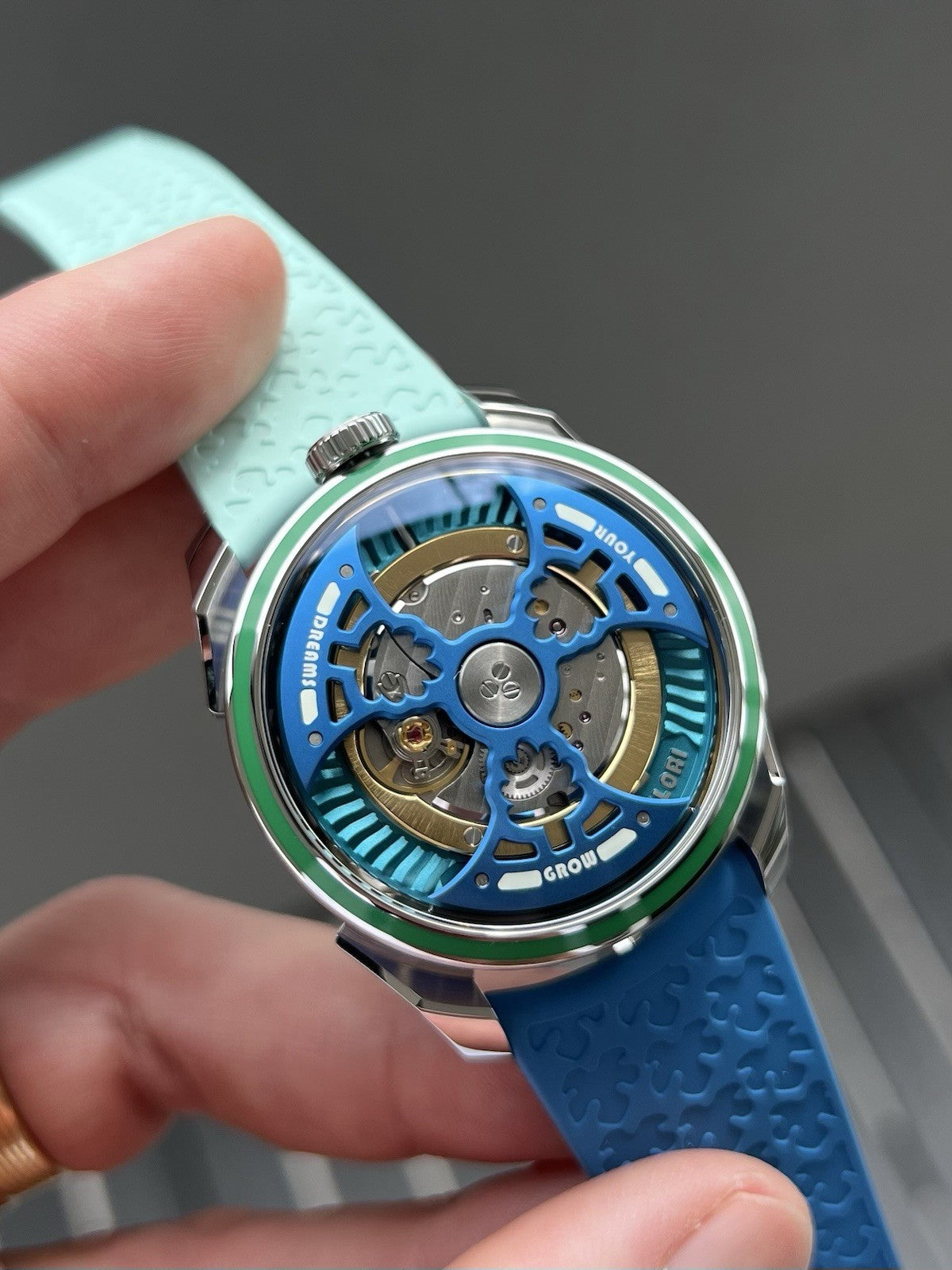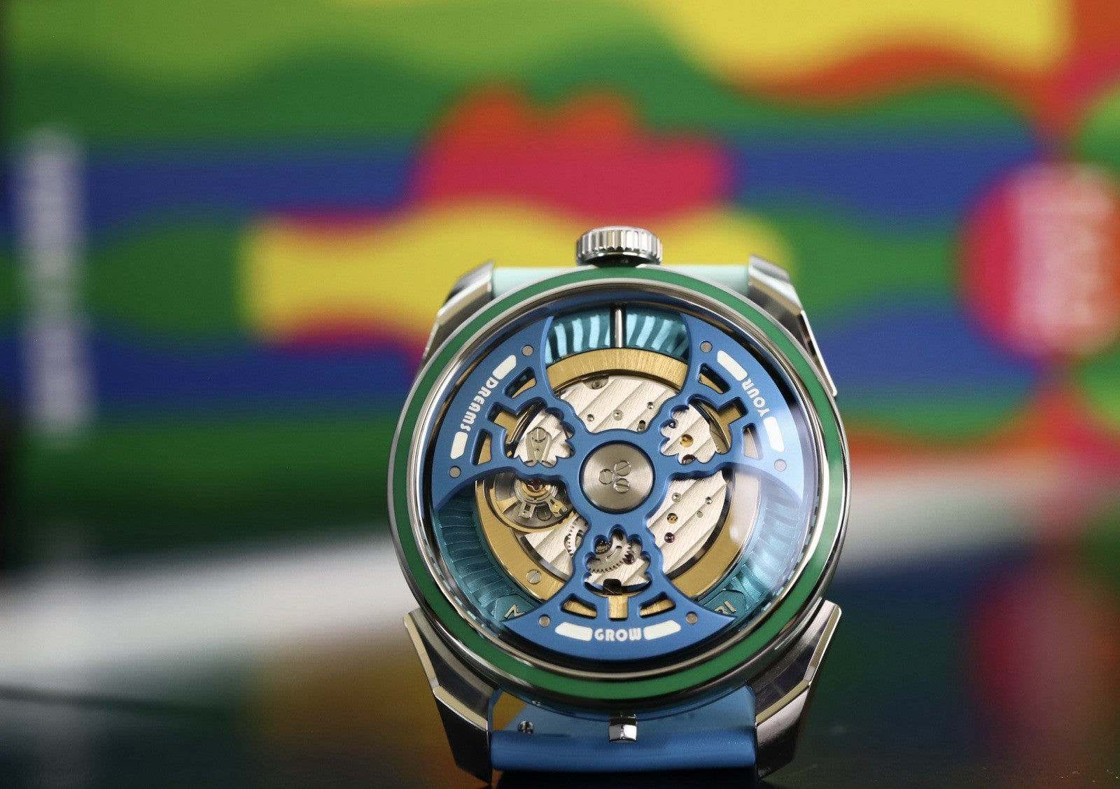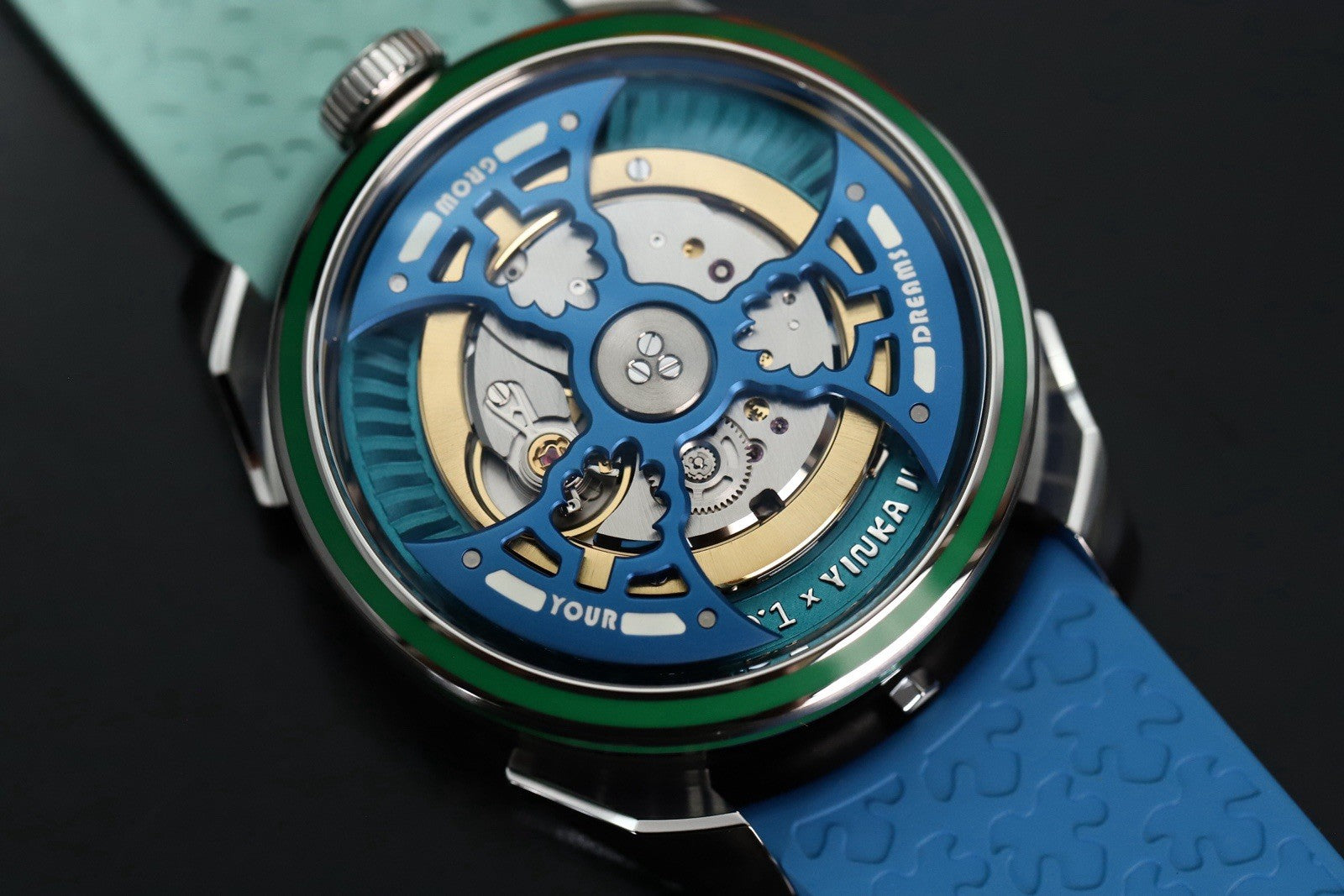 This version was released in 2025, and is a collaboration with famous artist Yinka Illori, taking inspiration from his signature bright color palette. It still utilises a 42mm case in steel and sapphire, and the same La Joux-Perret G101 that has been significantly reworked and is flipped upside down. This version is known as the 'Water', and features a light blue barrel, a blue rotor, and a dark and light blue rubber strap. The rotor itself is a work of art, with each titanium blade featuring a milled tree motif, and looks amazing spinning above the milled base plate. It's surrounded with a HyCeram bezel insert in green on both the tops and sides of the bezel, and finally the numbers on the time display are designed by Illori. Very cool.
