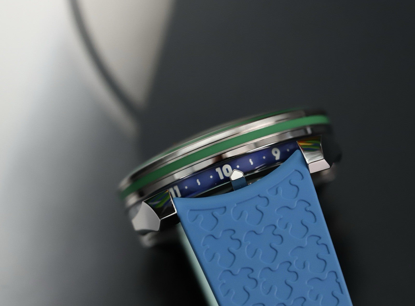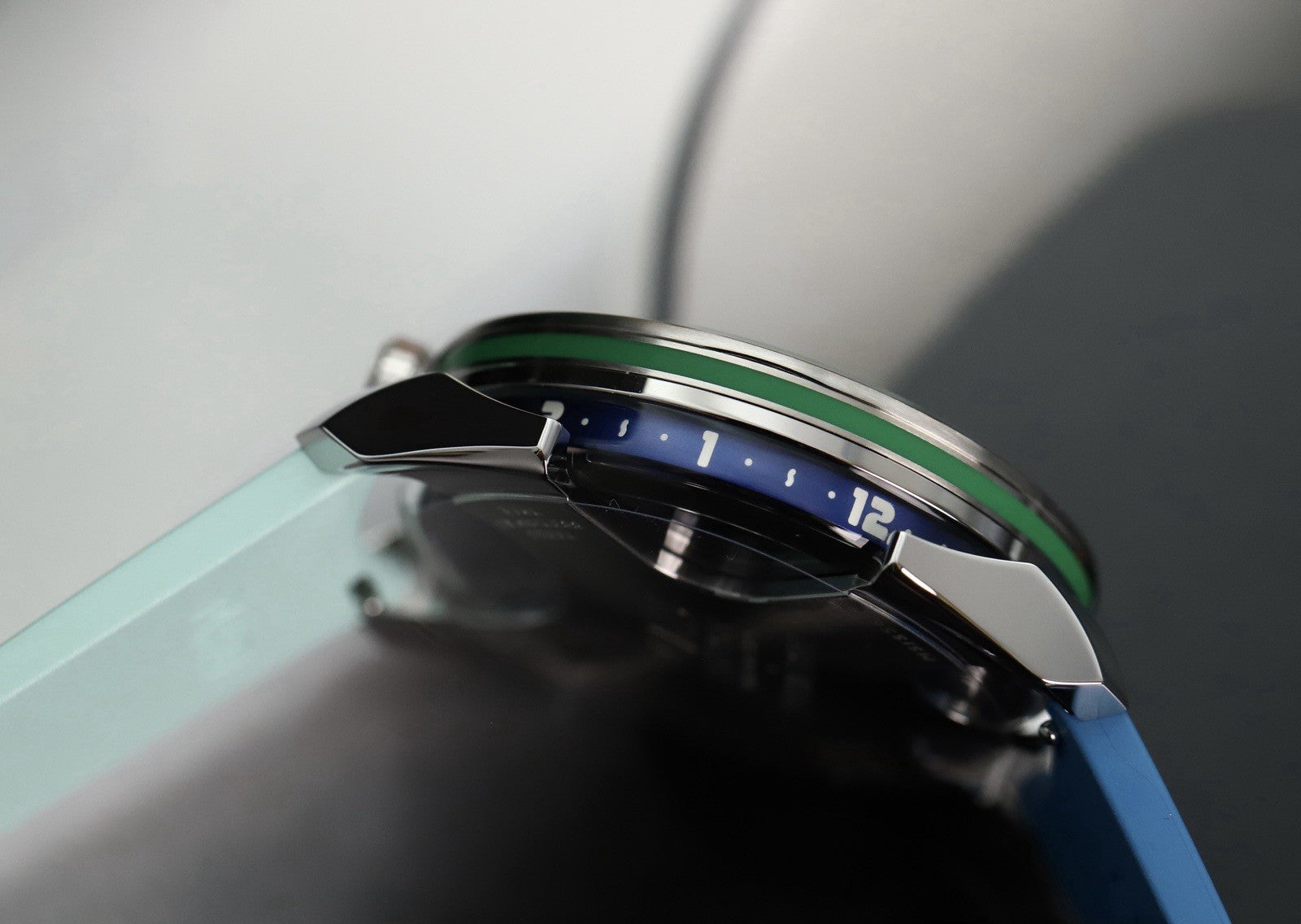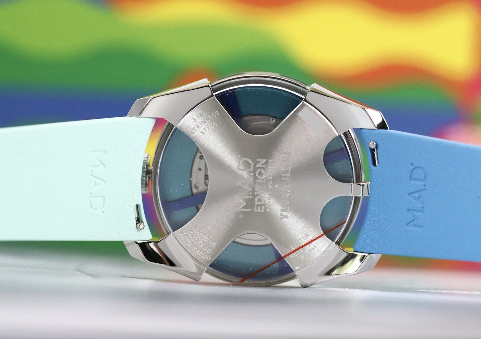 It comes equipped on a mismatch dark and light blue rubber strap with steel deployant, and a spare white strap. Certainly a very unconventional watch, but that's what MB&F's are all about.