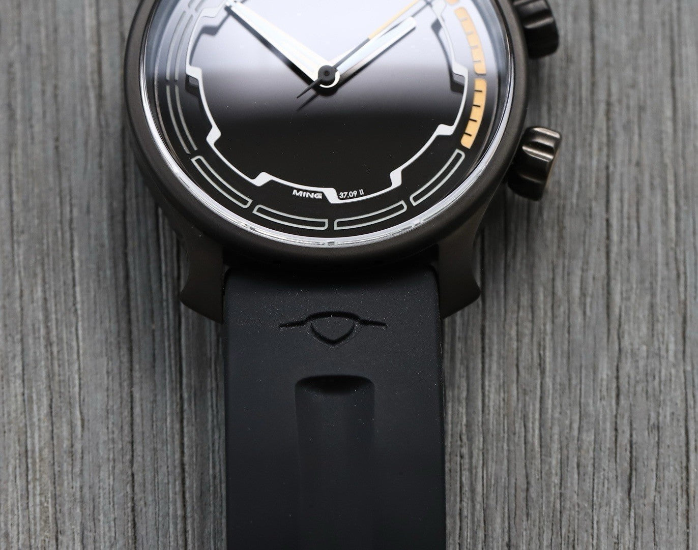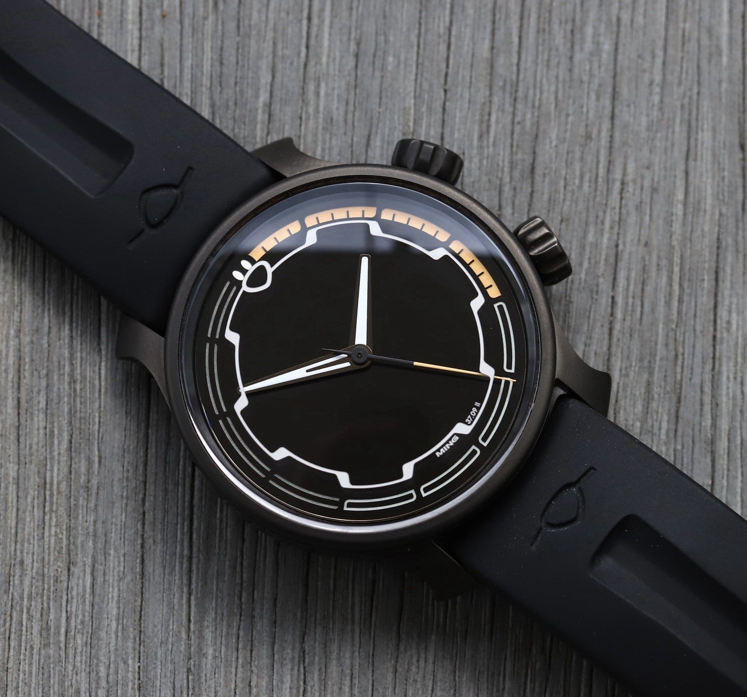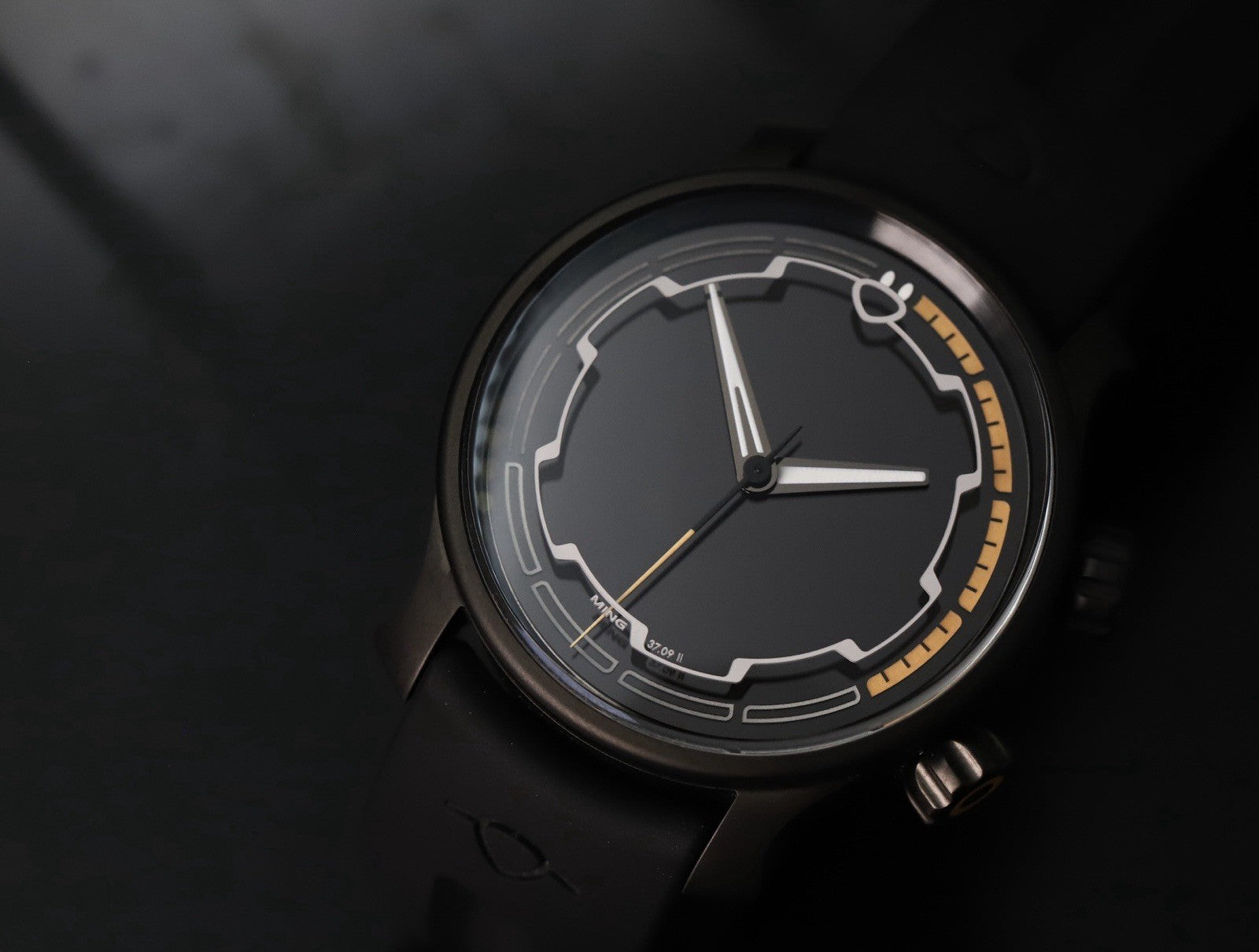 The dial and crystal are pretty spectacular, as you'd expect of Ming. The hour indices are actually on the inside of the crystal, and the effect this gives when viewed on an angle is very cool indeed. It's brimmed with lume, and the orange against black is the perfect colour combo for a darth spec watch like this.