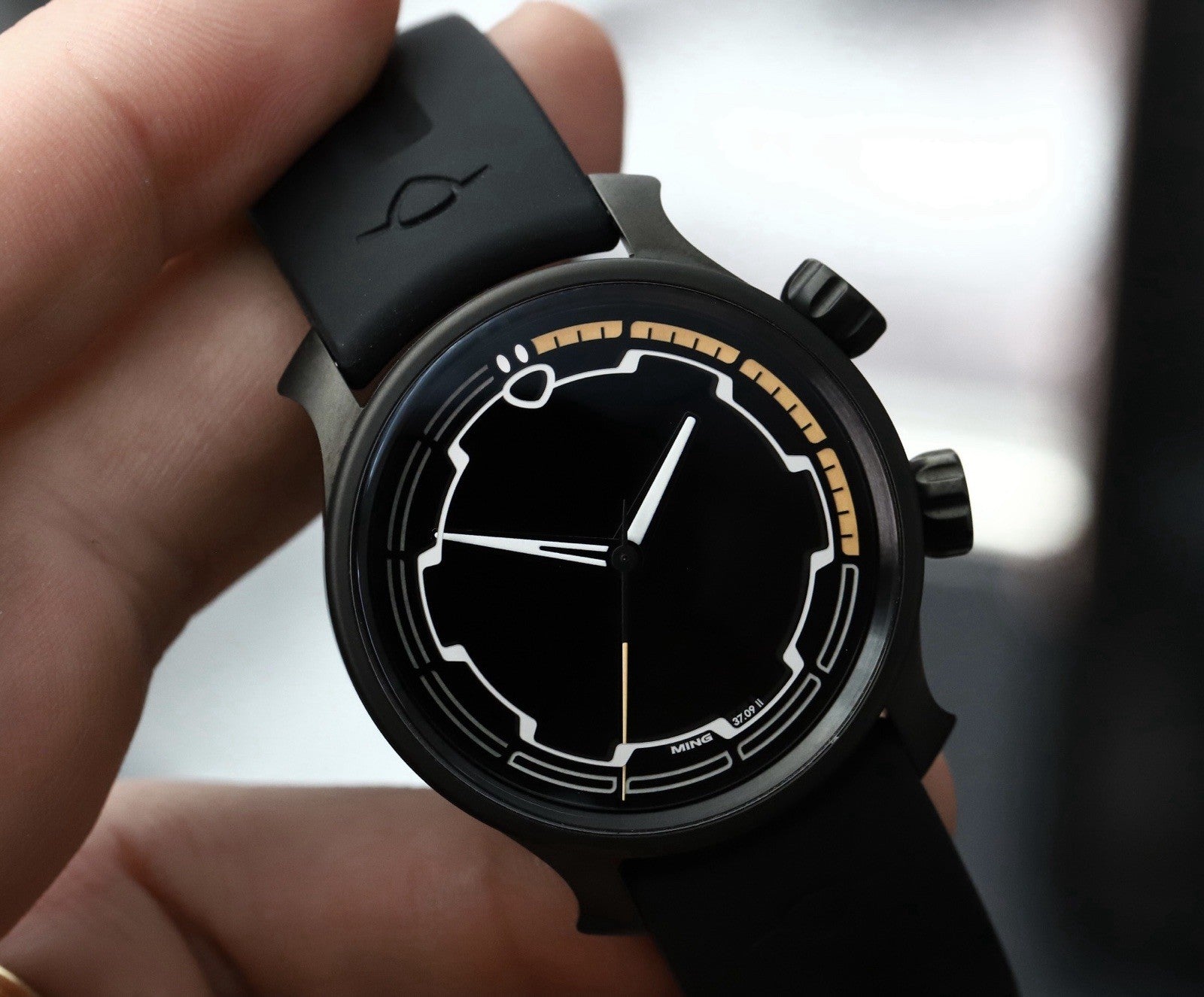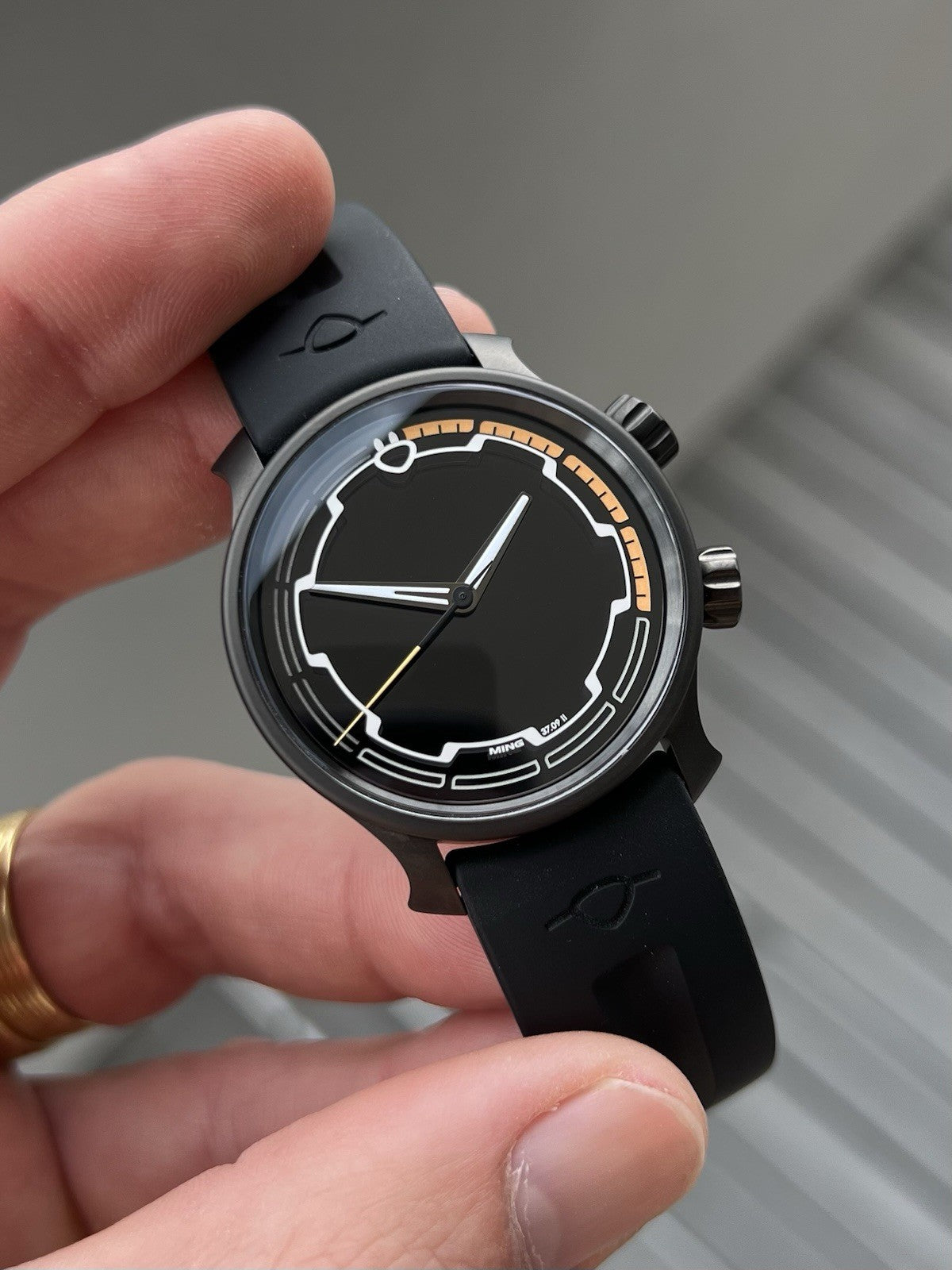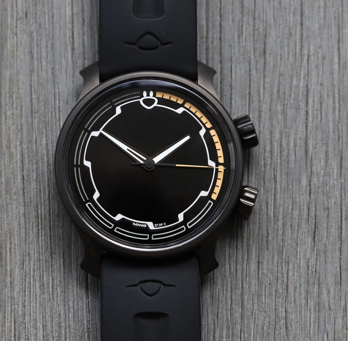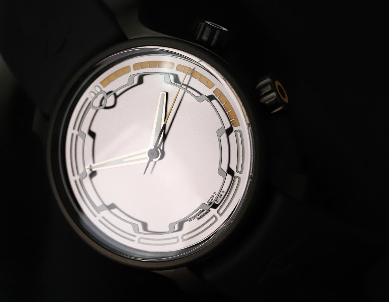 The dial and crystal are pretty spectacular, as you'd expect of Ming. The hour indices are actually on the inside of the crystal, and the effect this gives when viewed on an angle is very cool indeed. It's brimmed with lume, and the orange against black is the perfect colour combo for a darth spec watch like this.