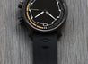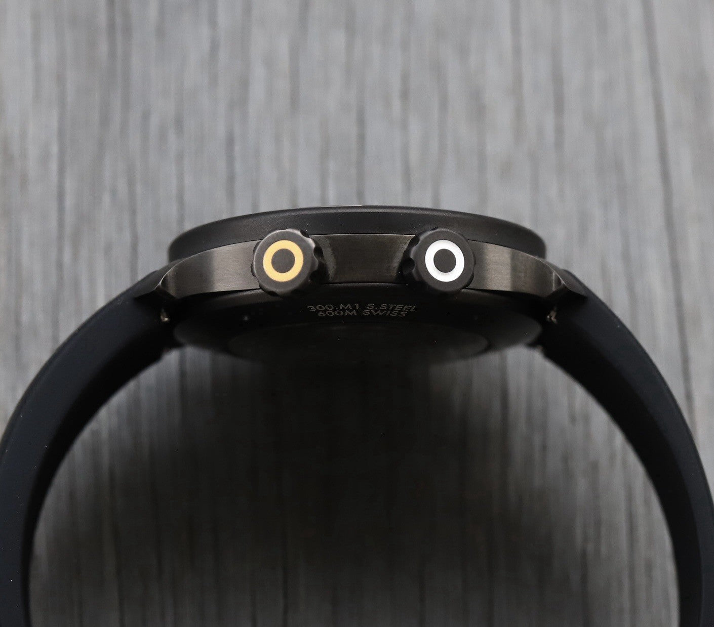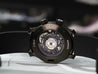 The DLC-coated stainless steel case measures in at 38mm, with a thickness of 12.8mm, 2.8mm of which is the heavily domed sapphire crystal which makes it appear very slender on the wrist. The absence of a traditional external bezel makes it feel a little larger on the wrist than 38mm, so visually perhaps more like a 39-40mm, but with the case proportions of a 38. Being a compressor-style case, the dive scale is internal, with the lower crown operating this above or below the waters surface. The upper crown is a screw-down, and allows this watch to have a water resistance of 600m.