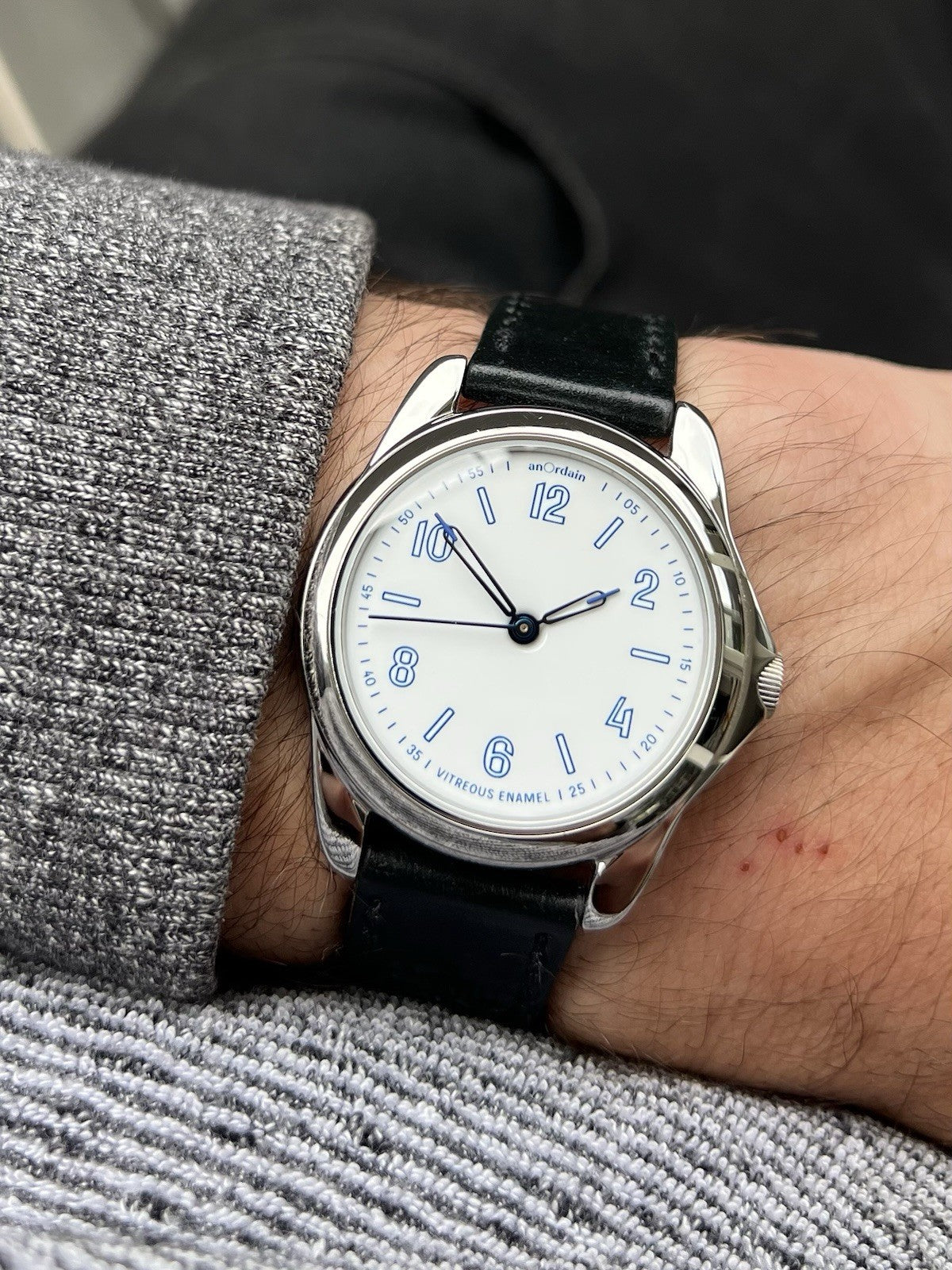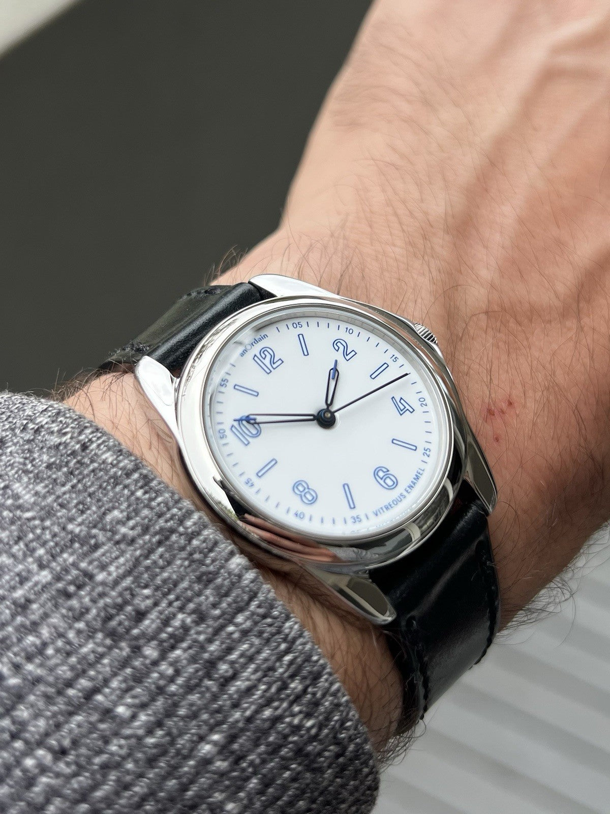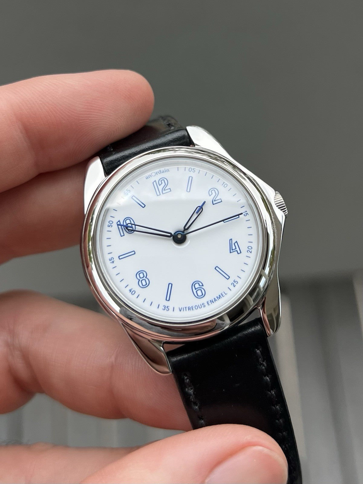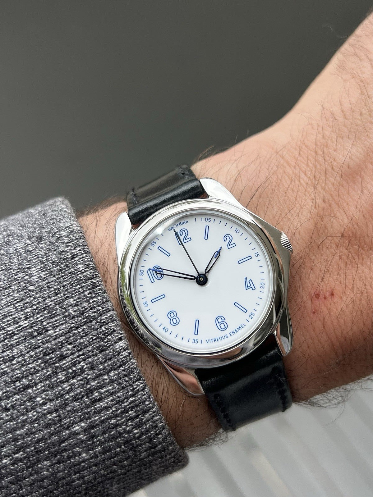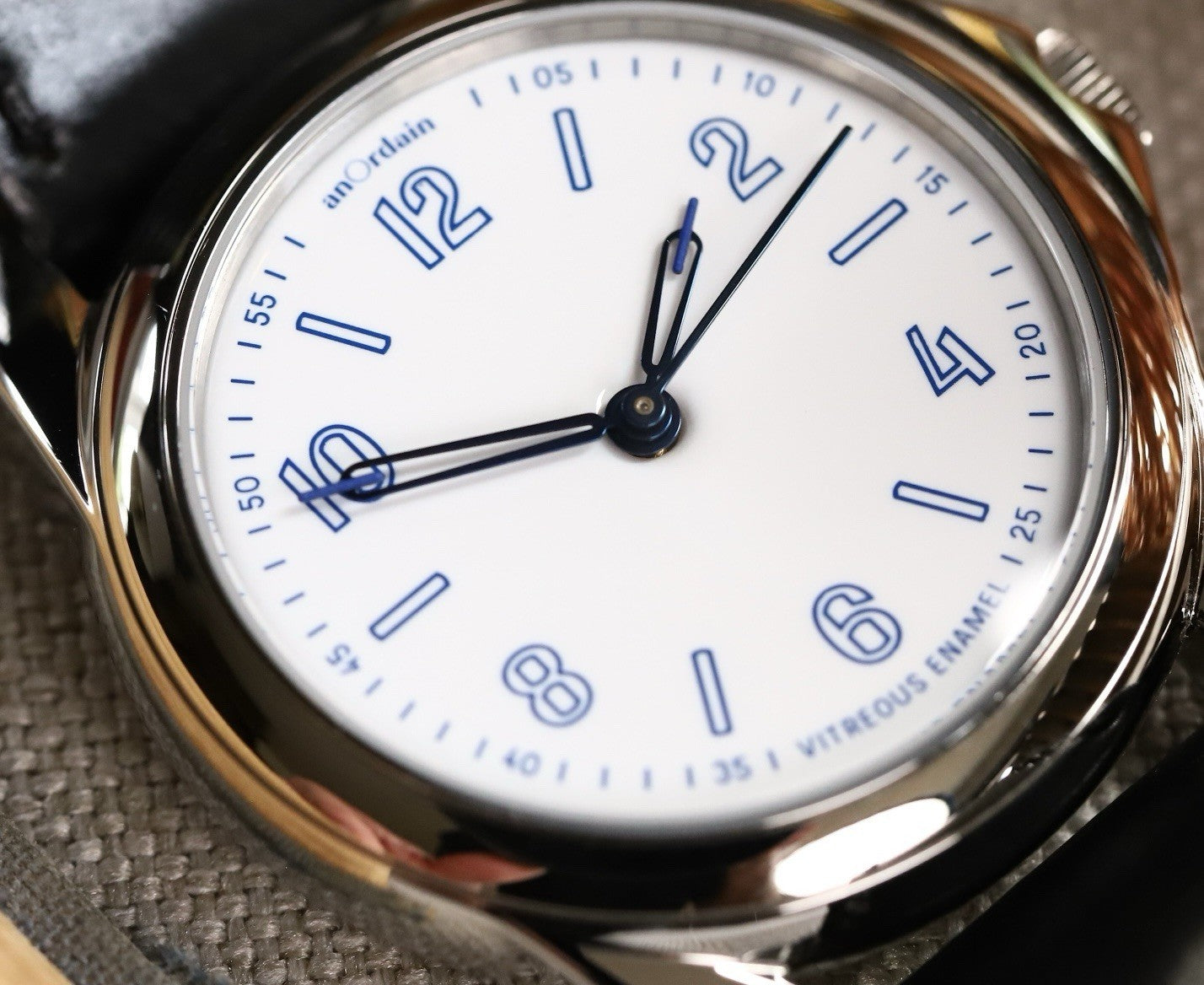 Utilising the traditional AnOrdain 36mm case in steel, it houses within it a spectacular vitreous enamel off-white dial, otherwise referred to as a Grand Feu dial. Each dial is made in-house and takes about 12 hours to craft, and the result is absolutely spectacular, changing with the light and providing a texture not always seen in more staid enamel options from other brands. The dial is topped with blued syringe hands to match the blue numerals in AnOrdains own font, minute track and markers.
