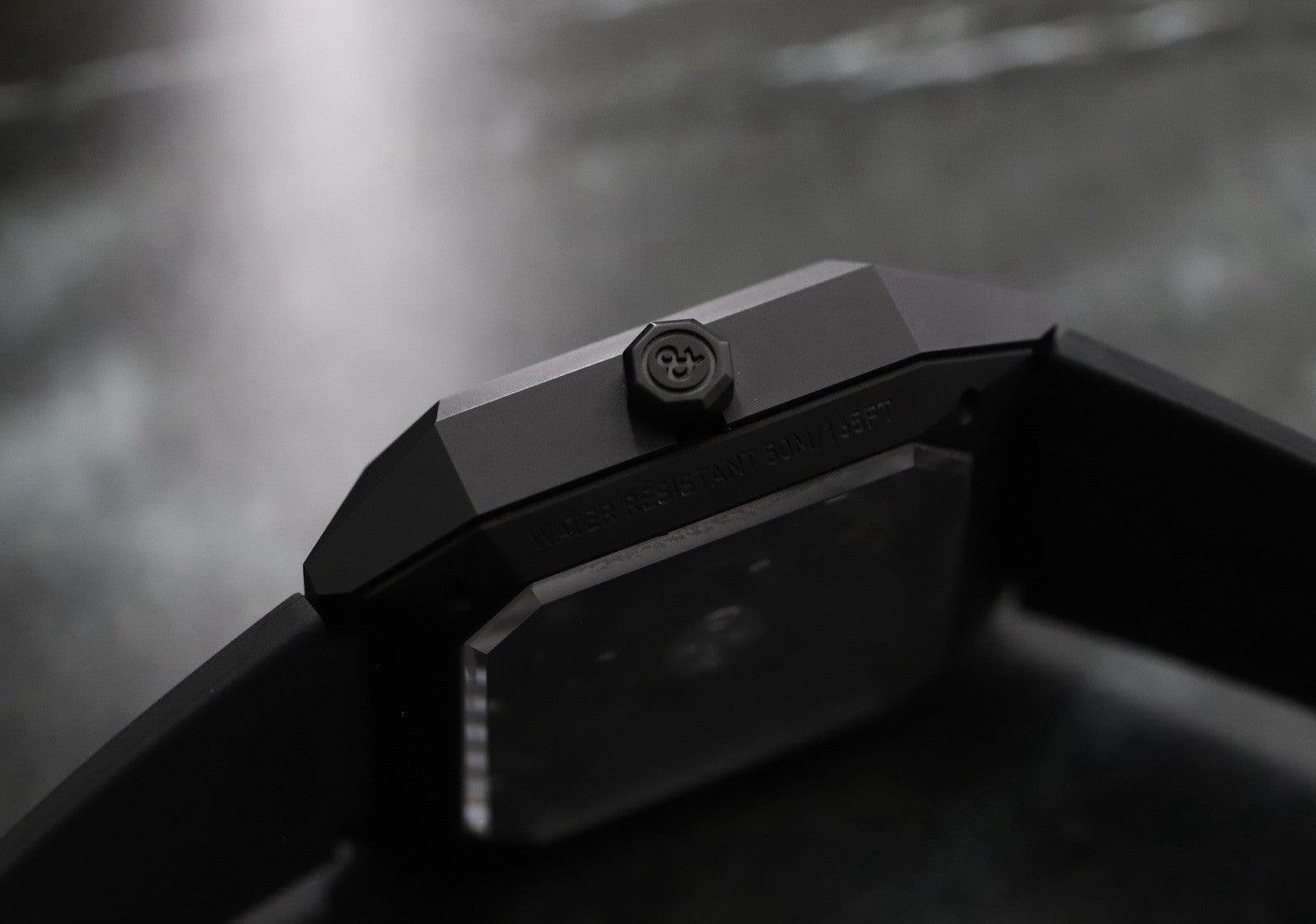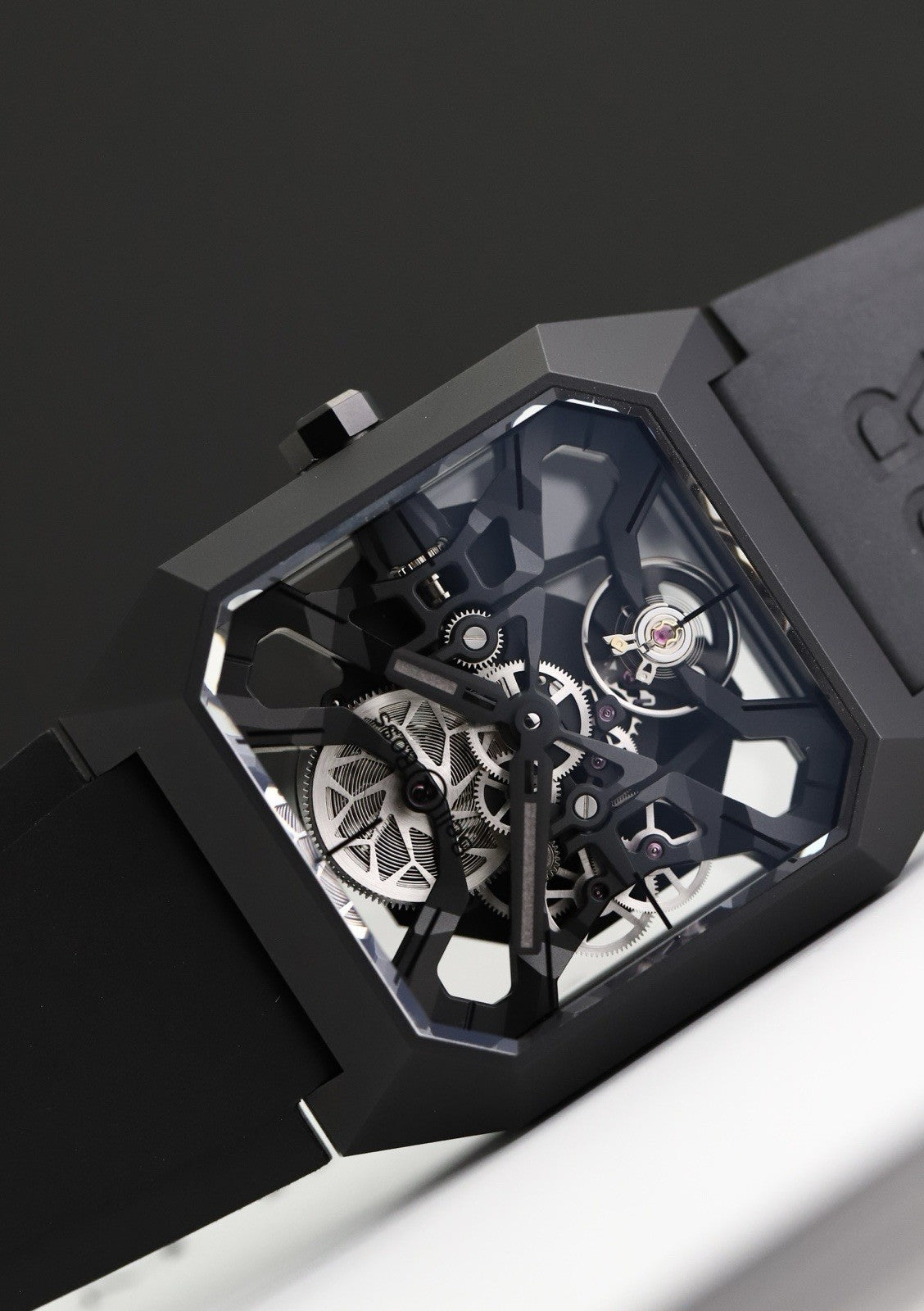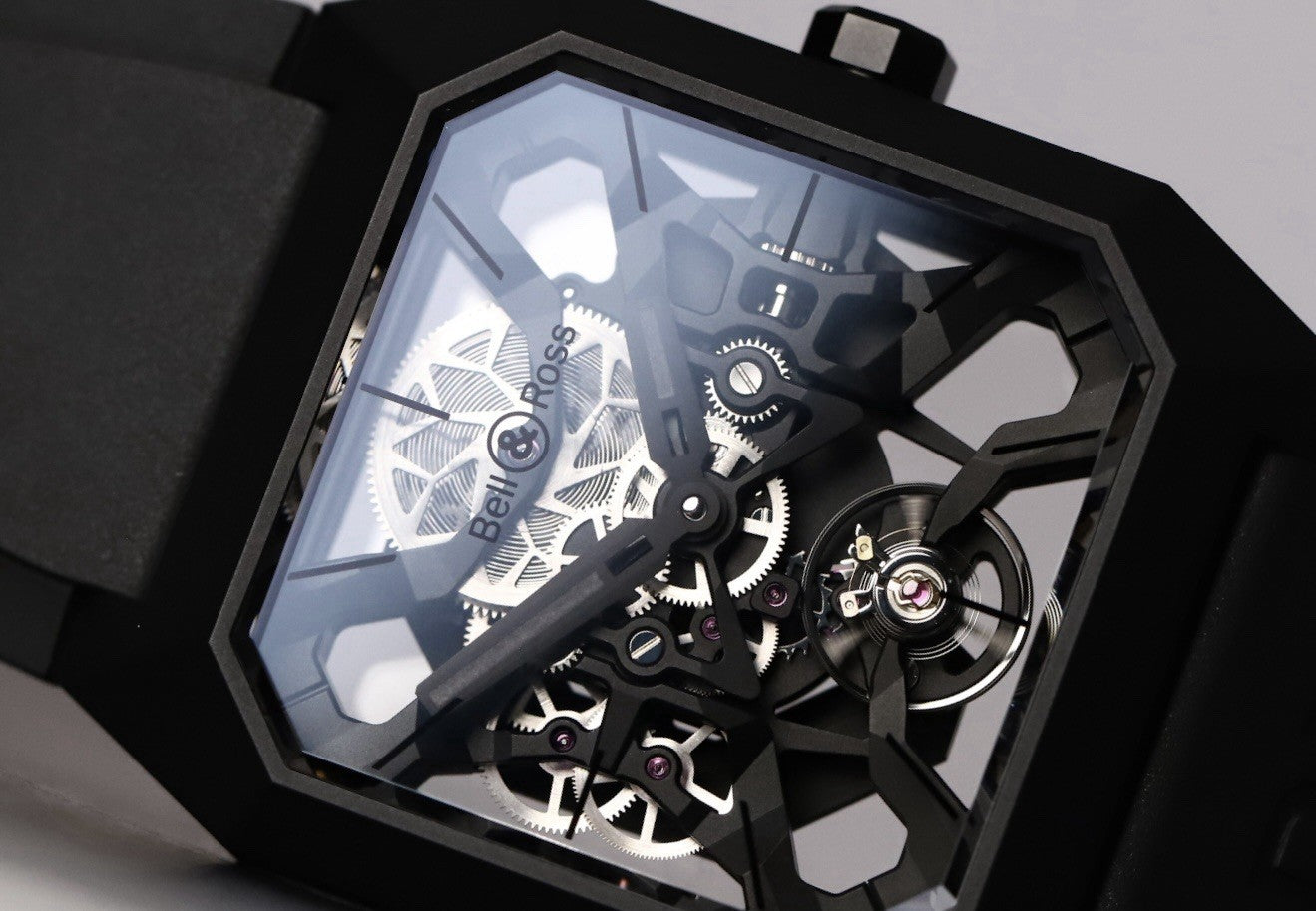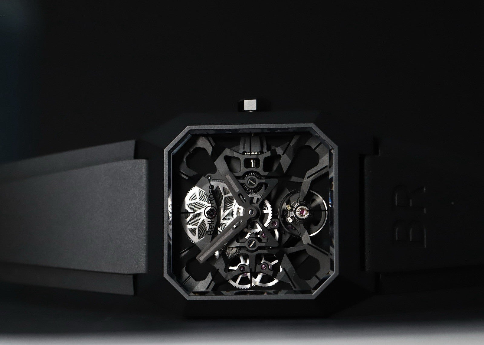 As cool as the case is, it's what lies inside that is most interesting. Developed by Concepto, the same company who constructed the movements for the Bulgari Octo Finissimo Ultra, as well as movements for Jacob & Co. such as the Chiron Tourbillon, the BR-CAL.383 is an automatic movement with black skeletonized main plate and bridges, which form a cross-bone shape which supports the wheel train. There is no dial, with the indices printed on the underside of the heavily faceted crystal. It really is a sight to behold, and the rhodium plated wheel train provides a stunning contrast against the sandblasted, black finish of the bridges. We love the exposed mainspring at 12 too, which allows you to see the approximate power reserve by viewing how tightly coiled it is, not unlike a Ulysse Nardin Freak.