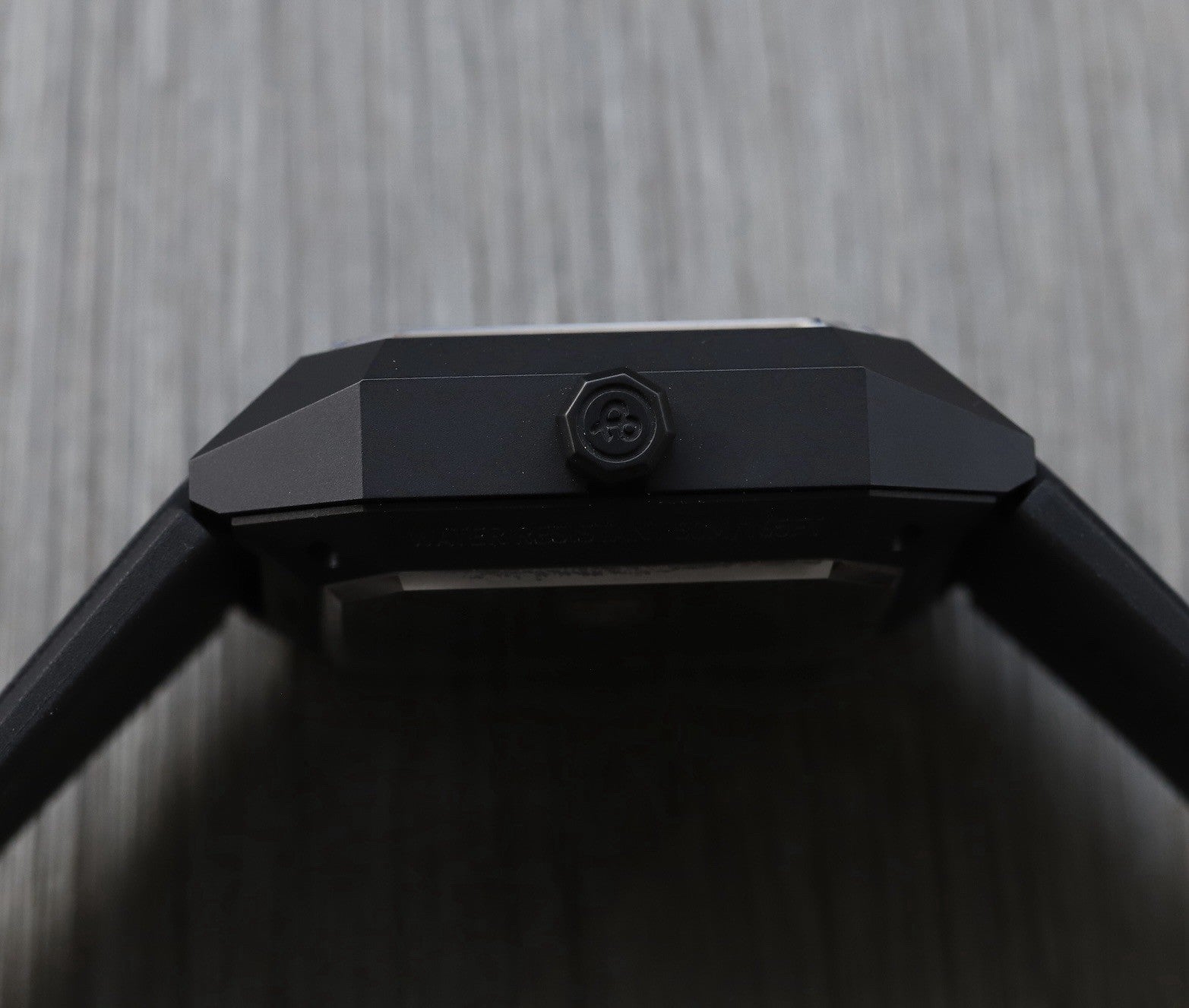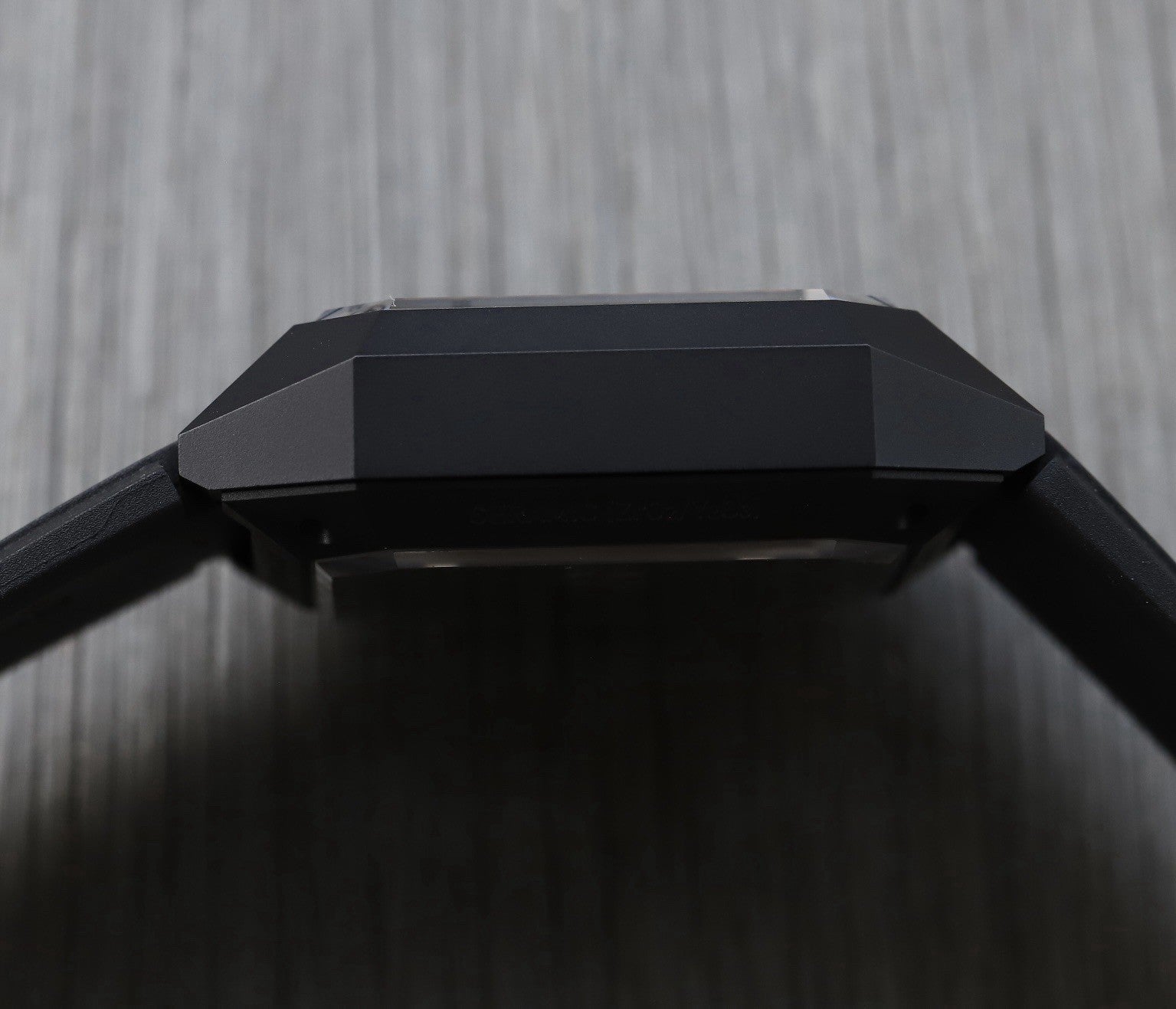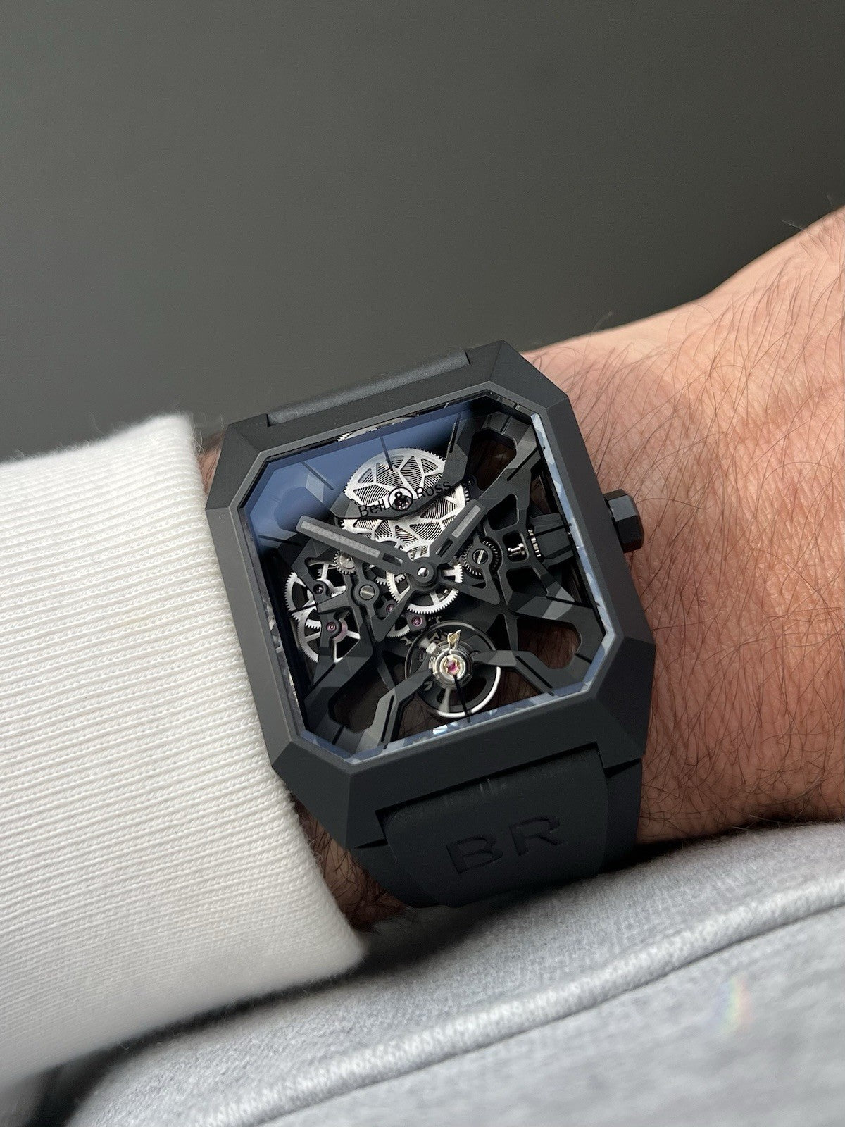 The case is constructed in ceramic, and features sharp facets throughout. This case shape was first debuted with the BR01 Cyber Skull, but for the ceramic model it was moved to the BR03 series, meaning it has shrunk quite a bit and now measures in at 42mm x 43.7mm lug-to-lug and around 15mm thick. Much more manageable than the 45mm BR01, and with the short lug-to-lug is a good fit for most medium to large sized wrists. The case execution is flawless, as to be expected of one manufactured by G&F Châtelain, the same case maker responsible for the Chanel ceramic cases which are some of the best in the world, as well as components for MB&F and Richard Mille amongst others.