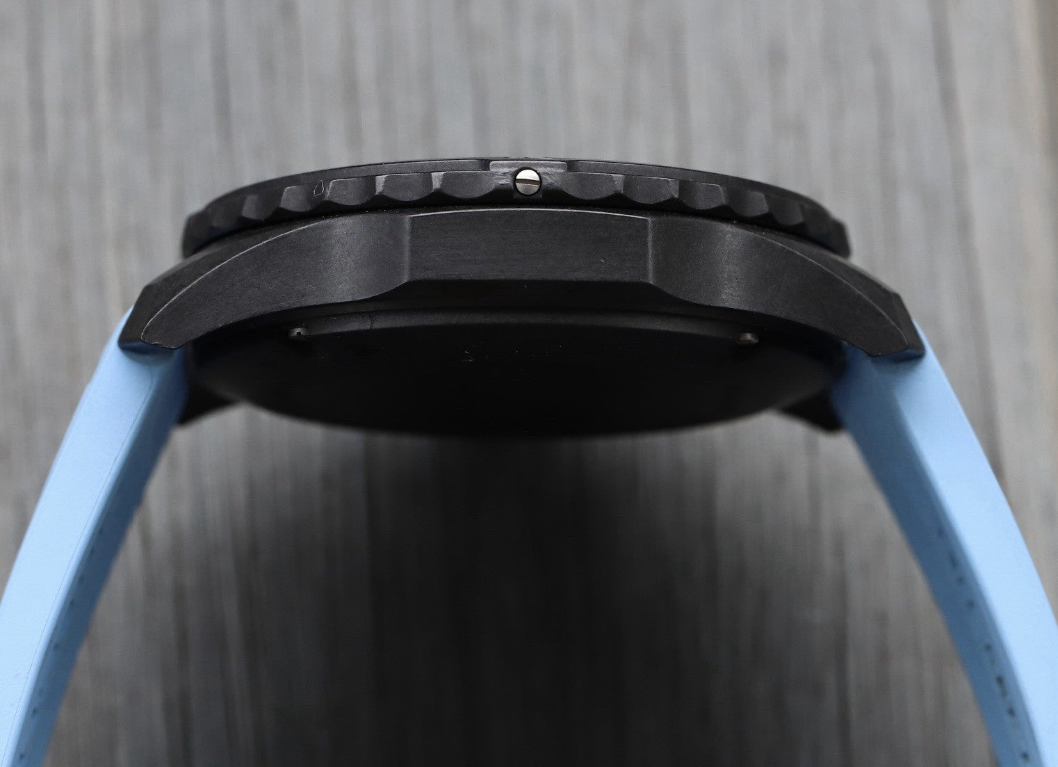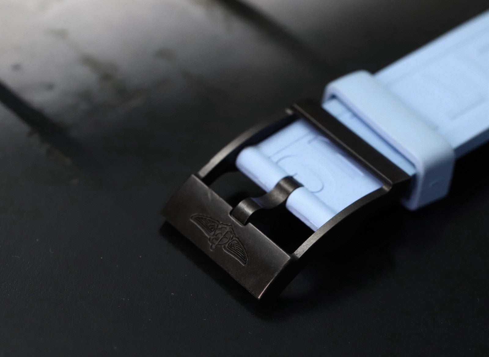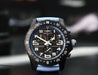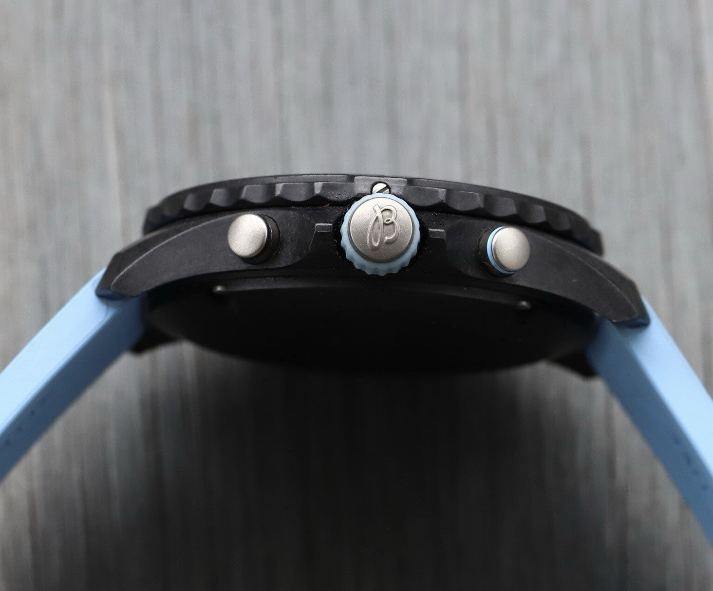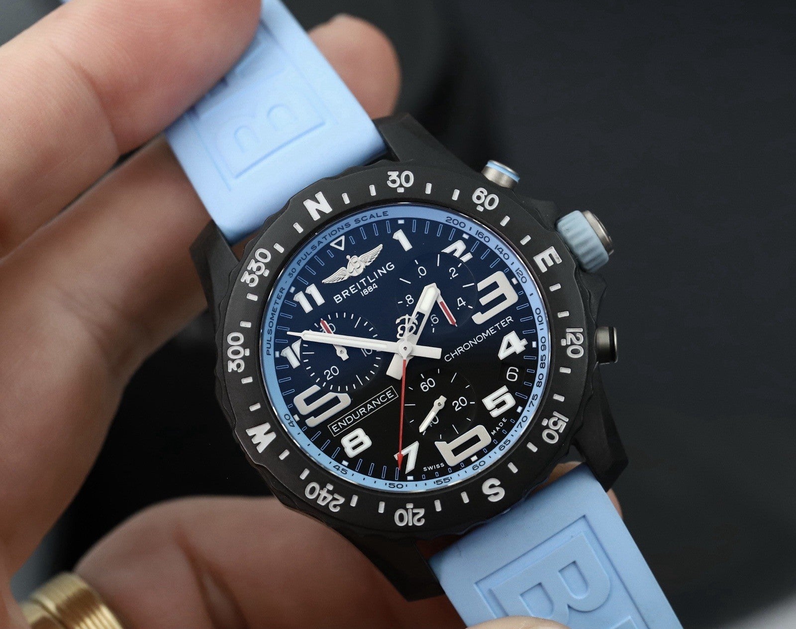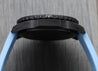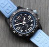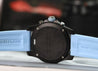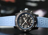 The case is made from an ultra-lightweight composite material known as Breitlight, weighing in at just 65g including the strap and buckle. It measures in at 44mm with a 52.6mm lug to lug, and just 12.6mm thick, and is amazingly comfortable on the wrist. Within this case lies a deep black dial with baby blue pulsations scale matched by the rubber of the crown, and lots of lume for the indices. It features a 1/10th of a second counter at 2, 30 minute counter at 10, running seconds at 6 as well as a discreet date at 4:30.