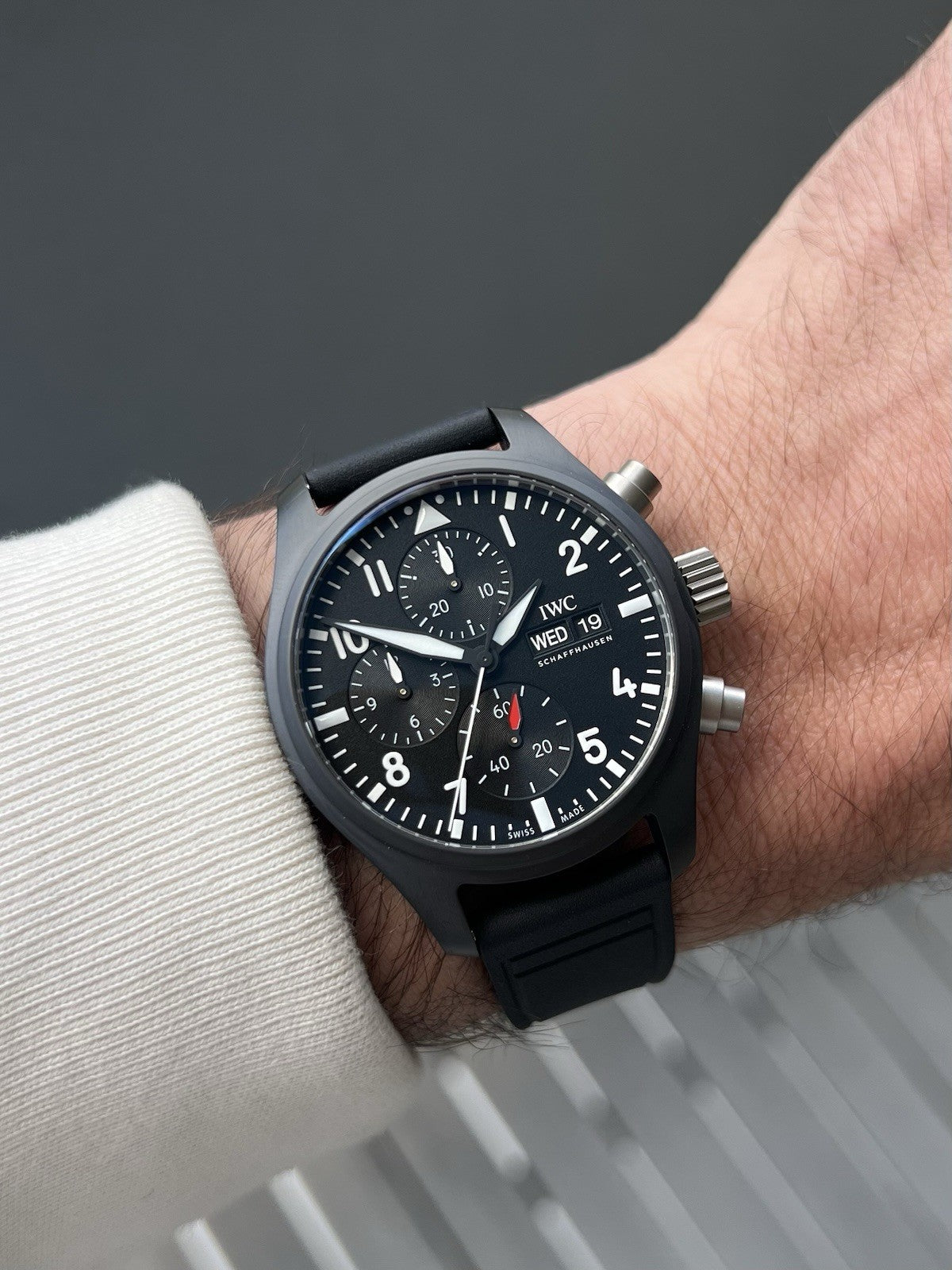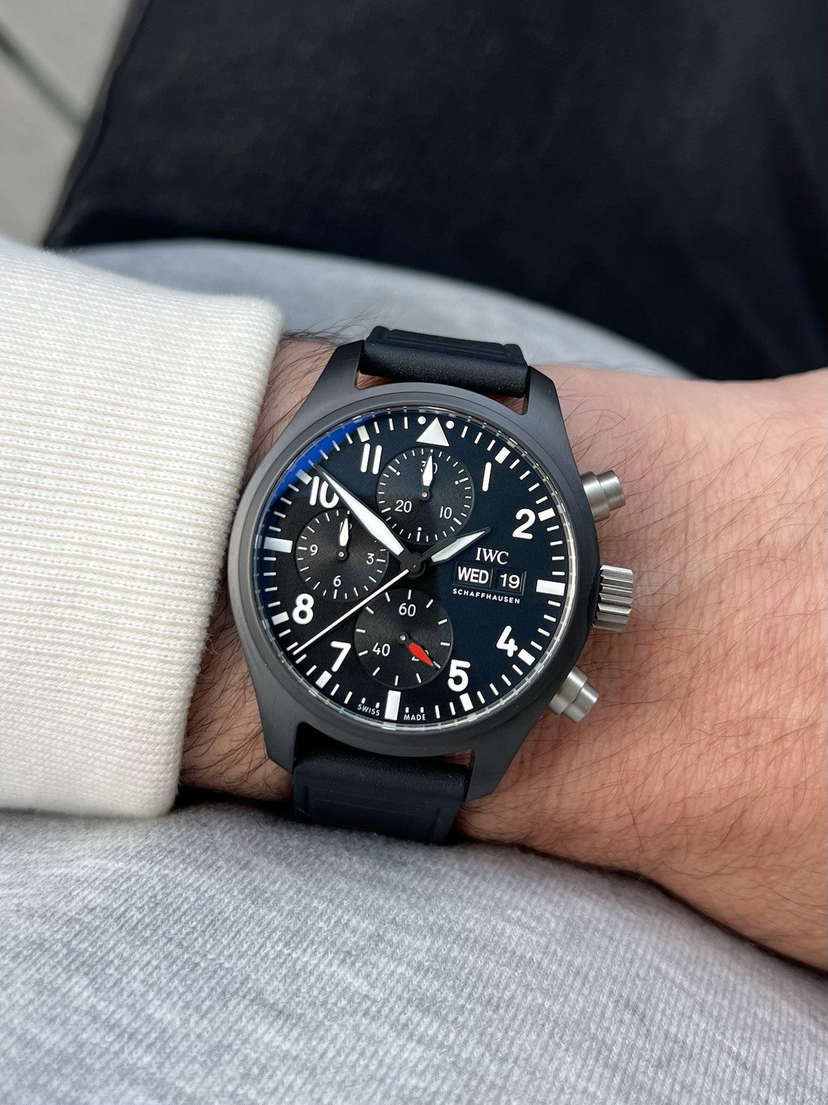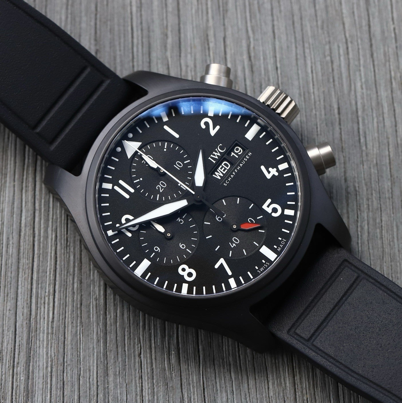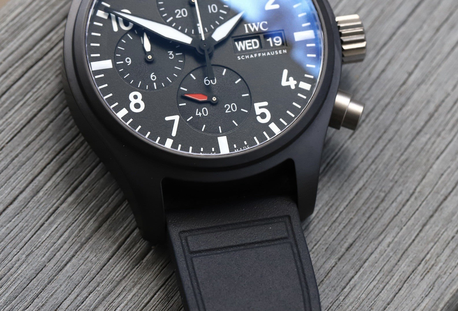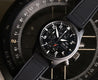 The case itself is manufactured in ceramic, while the pushers and crown are in untreated titanium which contrast beautifully against the flat black case. Within this case lies a wonderfully balanced dials, with the 30 minute counter at 12, running seconds at 6, and the 12 hour counter balanced by the day and date on it's opposite side. Classic white lumed railroad track minutes and markers create high-contrast legibility against the matte black dial, and it feels like pure IWC.