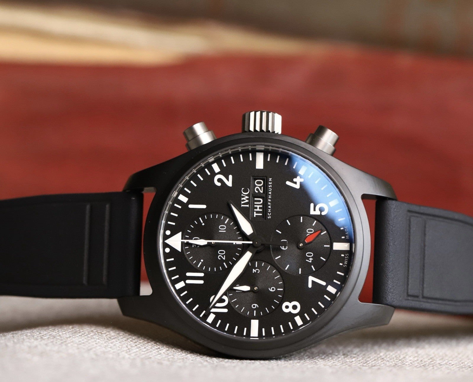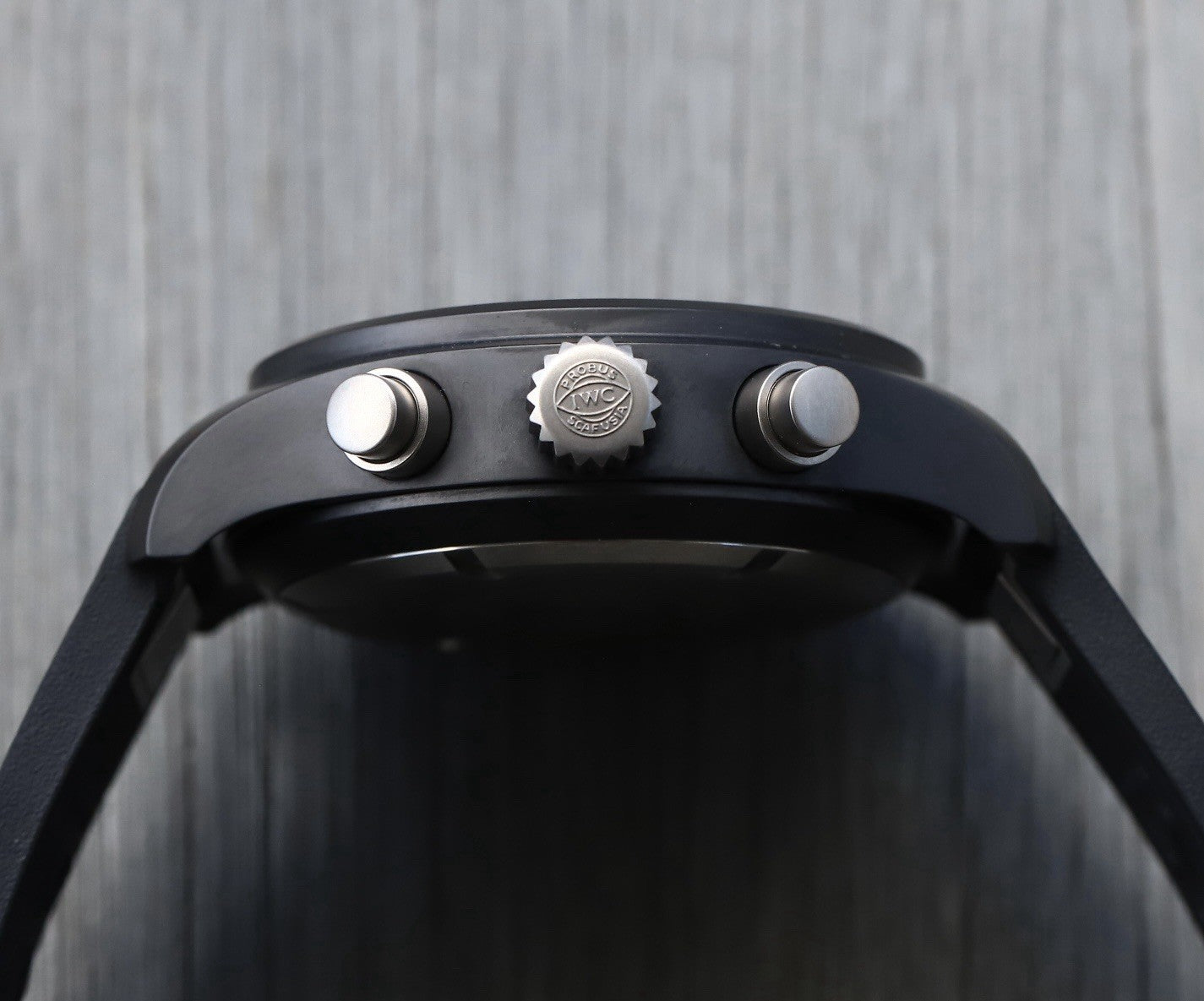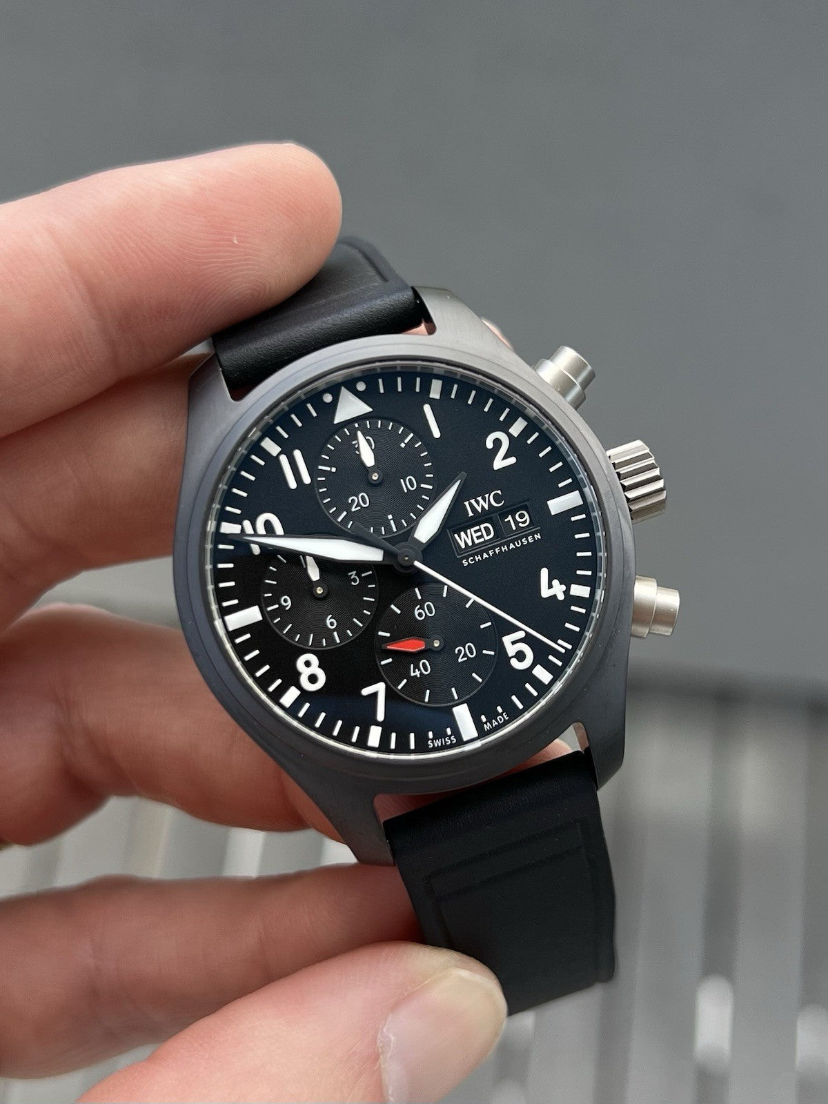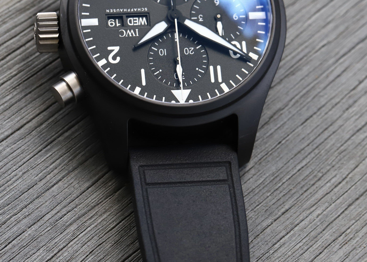 The case itself is manufactured in ceramic, while the pushers and crown are in untreated titanium which contrast beautifully against the flat black case. Within this case lies a wonderfully balanced dials, with the 30 minute counter at 12, running seconds at 6, and the 12 hour counter balanced by the day and date on it's opposite side. Classic white lumed railroad track minutes and markers create high-contrast legibility against the matte black dial, and it feels like pure IWC.