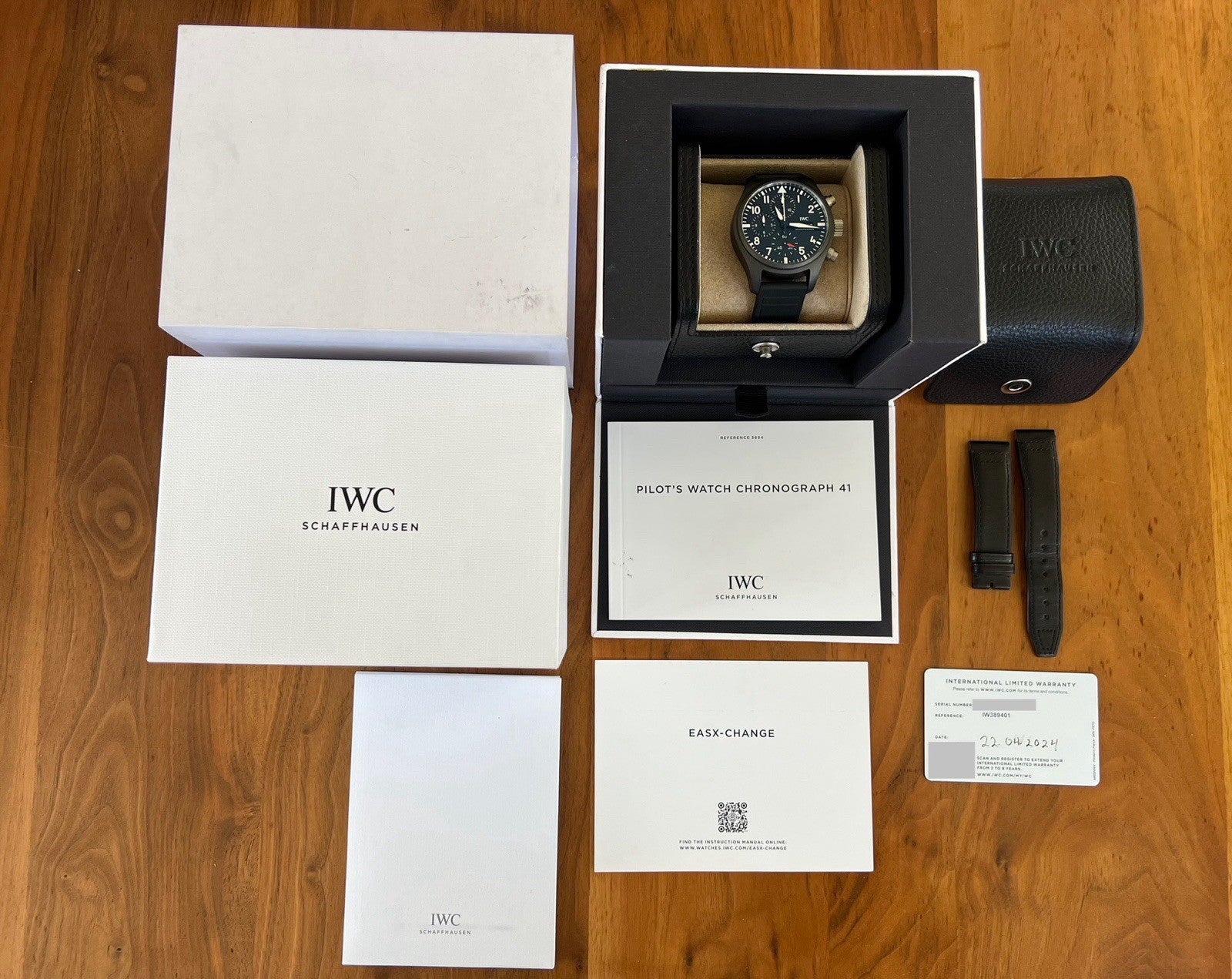Comes with outer box, inner travel case, instruction booklet, IWC cleaning cloth, warranty card dated April 2024 and IWC leather strap.