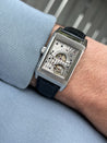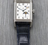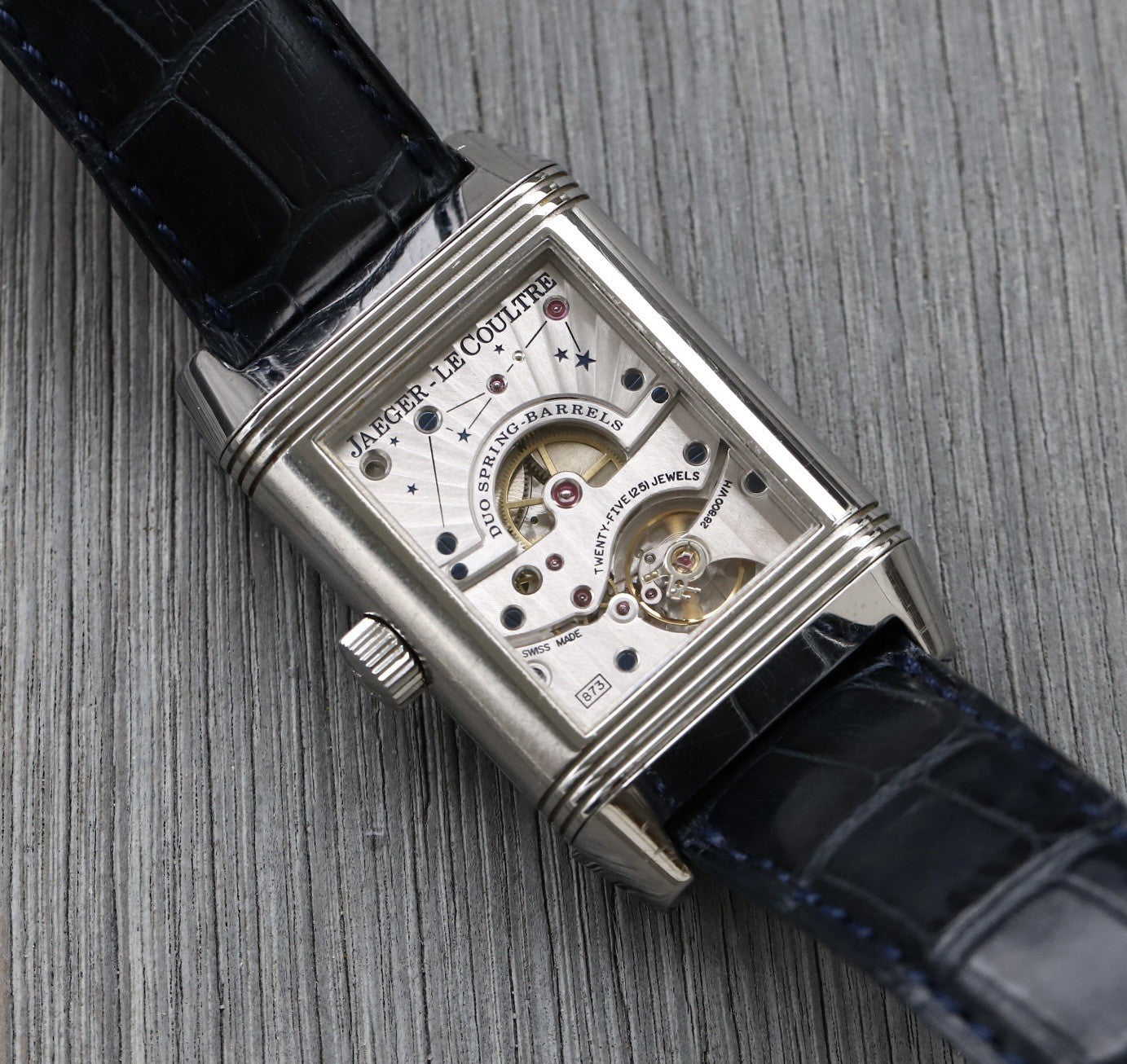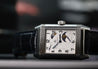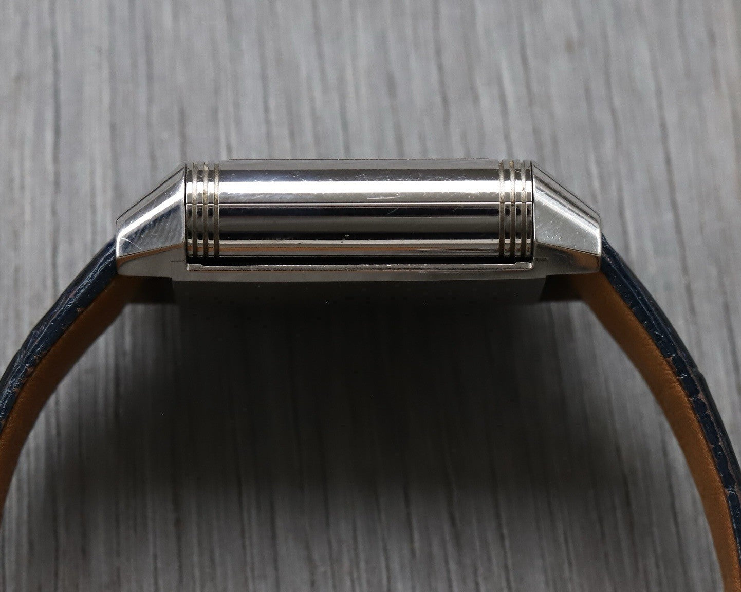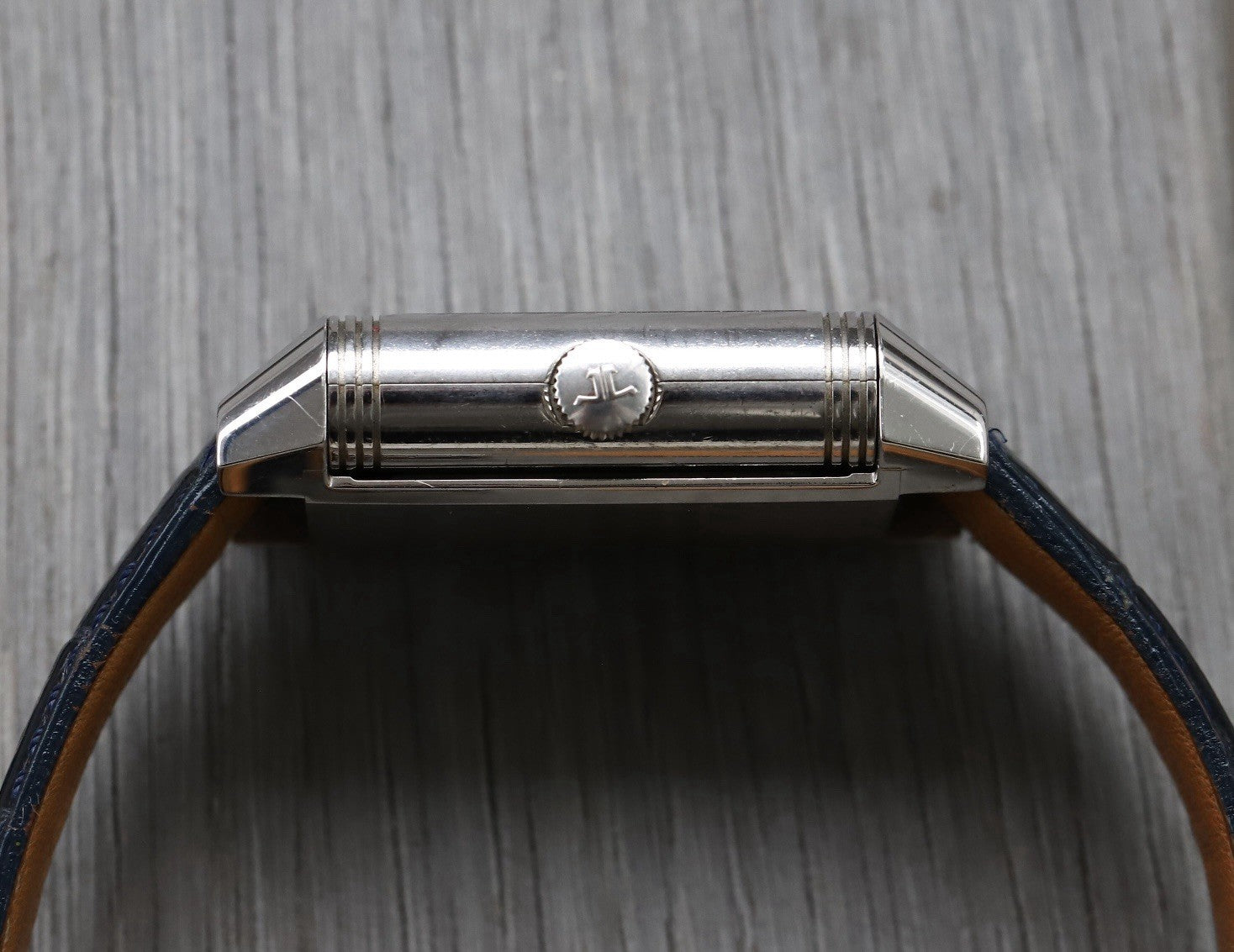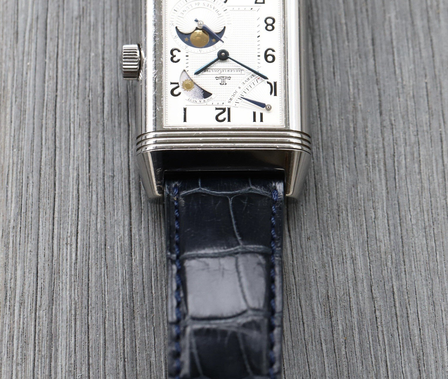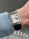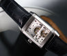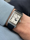 One of the largest offerings in the Reverso range at the time, the XGT case was based around the case introduced for the 70th anniversary Reverso of 2002. It's steel case measures in at 46.6mm x 29.5mm x 12.1mm making it a great fit for the larger wrist. Within this case lies an absolutely stunning silver matte finish dial, with quite a bit going on with this complicated piece. On the bottom right you'll find running seconds running above a beautiful moonphase, below which you'll find lovely rayon finishing. Just below 2 you'll find the Day/Night indicator, and to the left of that you'll find the 8 day power reserve indicator. Interestingly, despite it being called the 8 day, and showing an 8 day indicator, the watch will actually run for closer to 10 days. It's most accurate within the first 8 days, hence JLC remind you to wind it every 8 days rather than running out to 10.