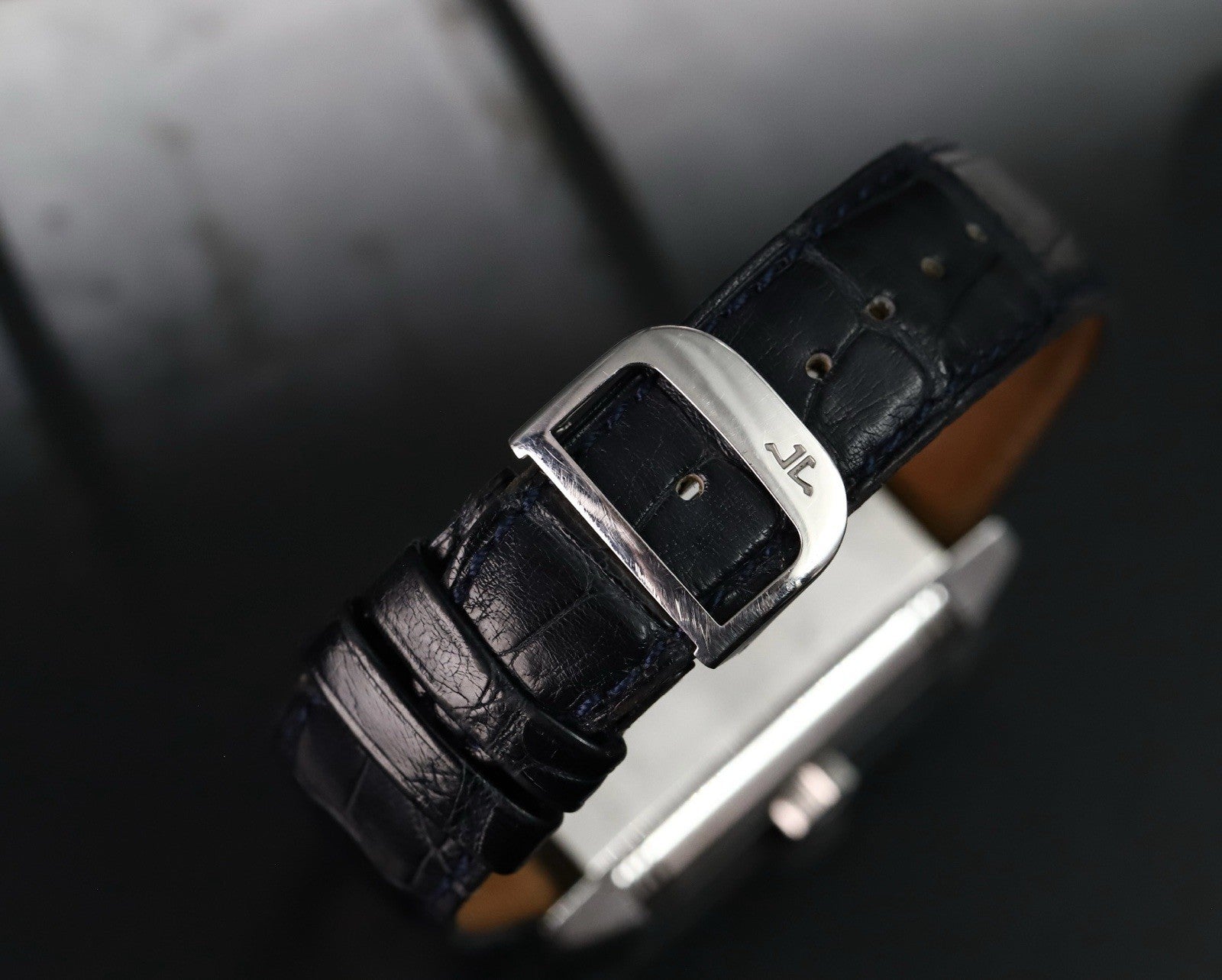 Comes on a stunning blue JLC 'gator strap that has been used, but has plenty of life left, and comes mounted on the excellent JLC deployant clasp which shows desk dive marks. Also includes the original brown 'gator strap which is in excellent condition.