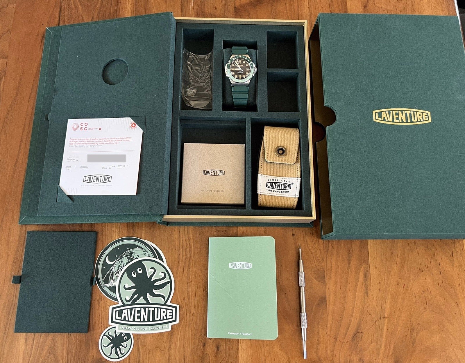 Comes with outer sleeve, inner box, warranty and info booklet dated June 2025, strap changing tool, springbar tool, cleaning cloth, COSC certificate and Laventure stickers.