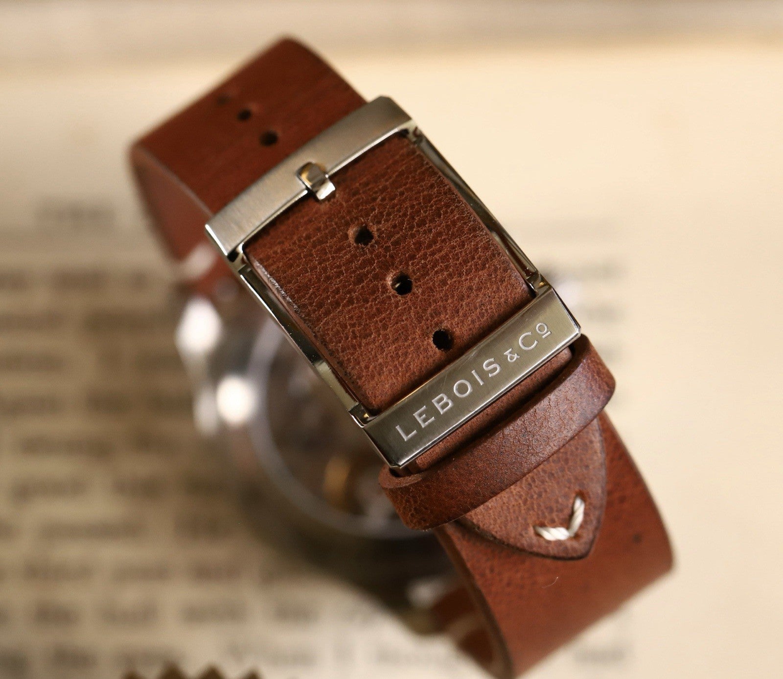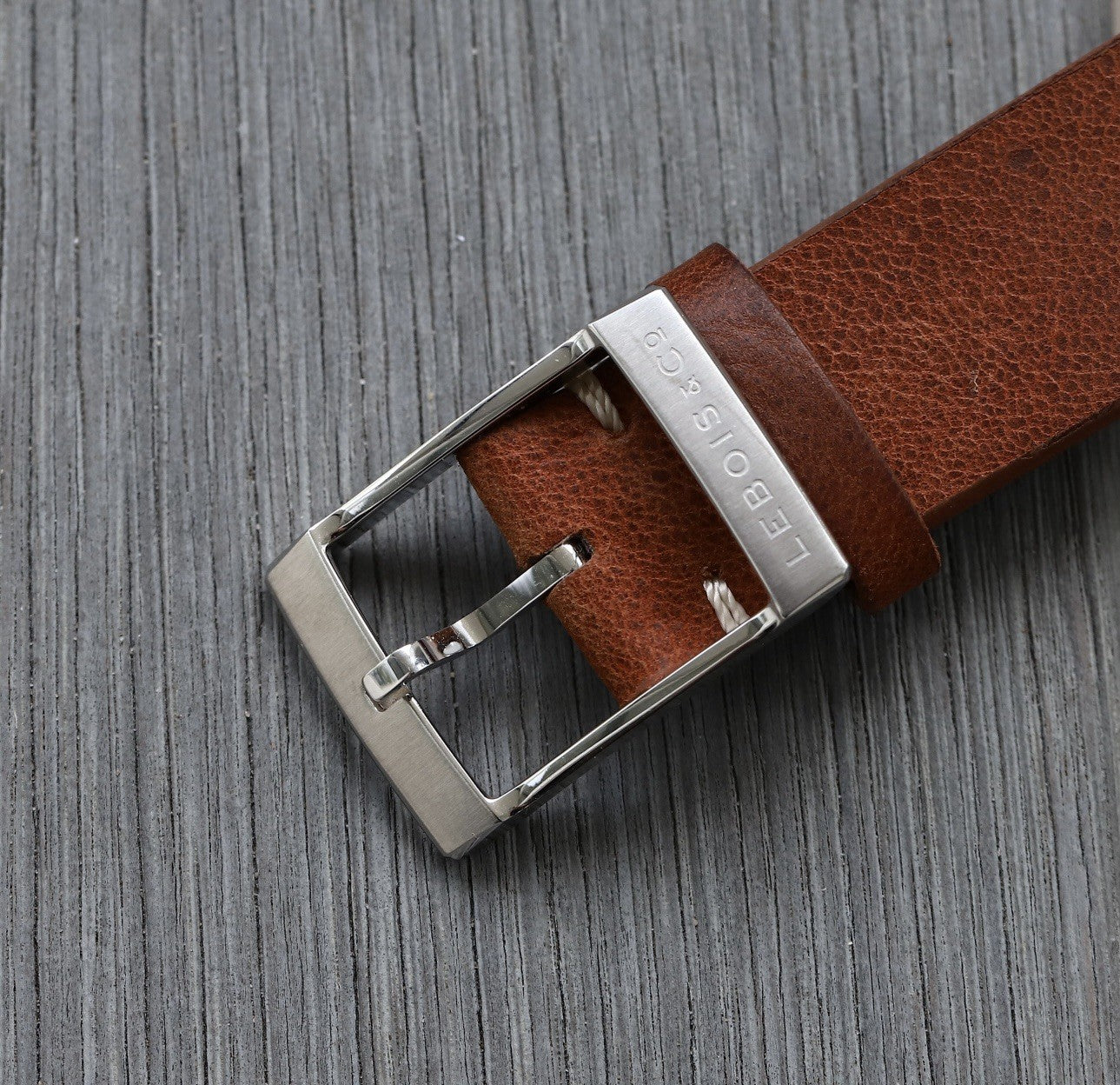 It's finished off with a lovely cognac leather strap, with highly detailed Lebois & Co buckle that suits the aesthetic to a tee.