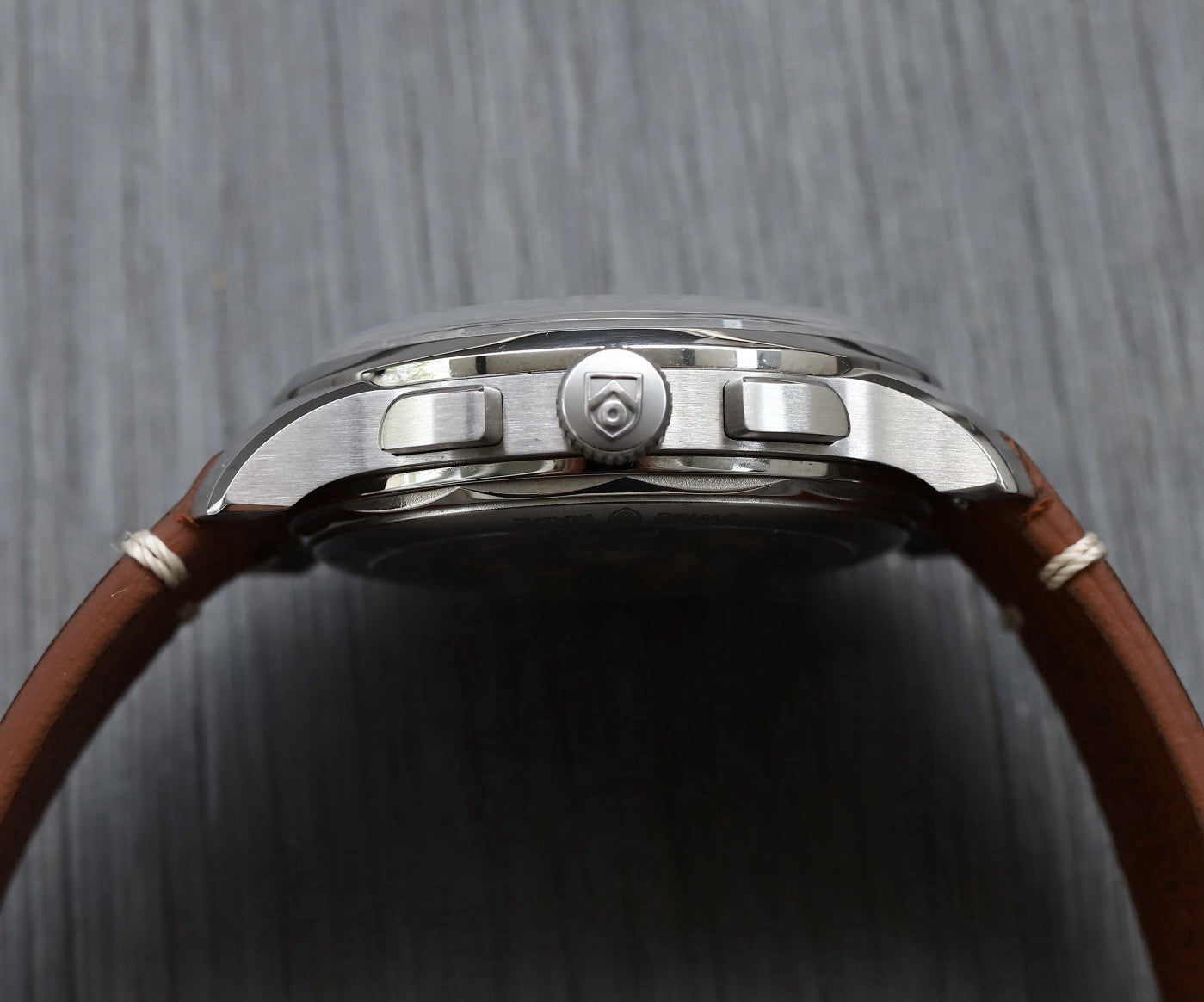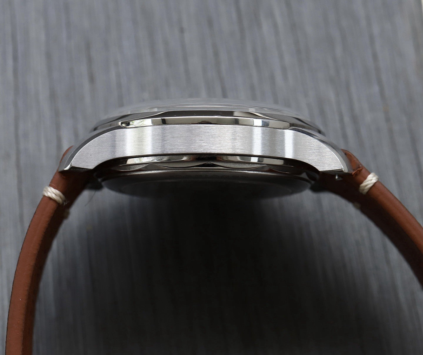 The Heritage Chronograph was released in 2021, with this 324.406 version coming 3 years later, and is perhaps our favourite design to date. It features a beautifully proportioned 39mm case in steel, with a 47.35mm lug-to-lug length and a 13.9mm thickness. Those proportions are slightly misleading, though, as the case itself is quite thin with the heavily domed crystal making up 3.5mm's of that overall height, so it wears very nicely on the wrist with its very slim brushed mid-case.