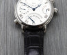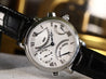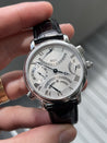 So what do we have? Well, it's a Double Retrograde as you can see, with the one at 6 representing the date, but the really interesting display is the dual time function at 12. This is adjusted by the pusher at 2, and allows you to set a second time. The use of a retrograde display for this, along with the pusher, makes it one of the most legible and easy to use dual time functions we've yet to experience. Same goes for the date, which is adjusted using the pusher at 8. We then have running seconds at 9, and a power reserve at 3, handy when you have a manual wind watch, and very well integrated. The dial features multiple guillochet finishes, and is lovely to behold, and the blued hands look magnificent above the opaline finish.