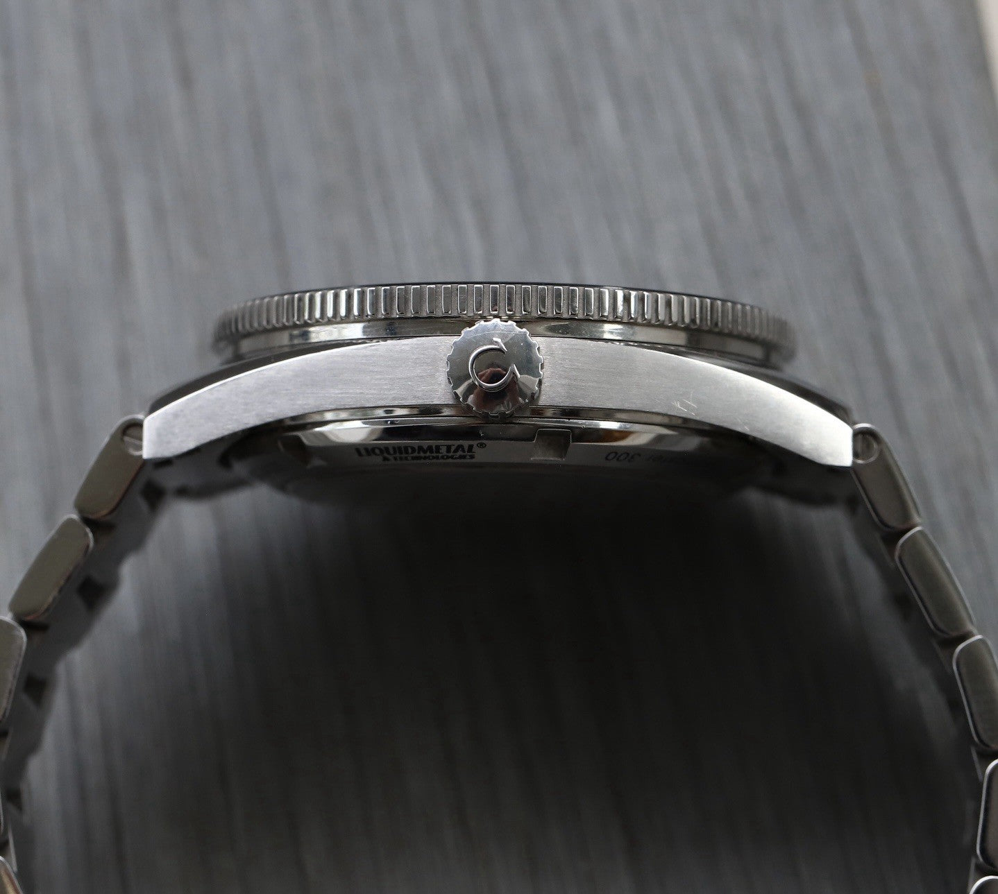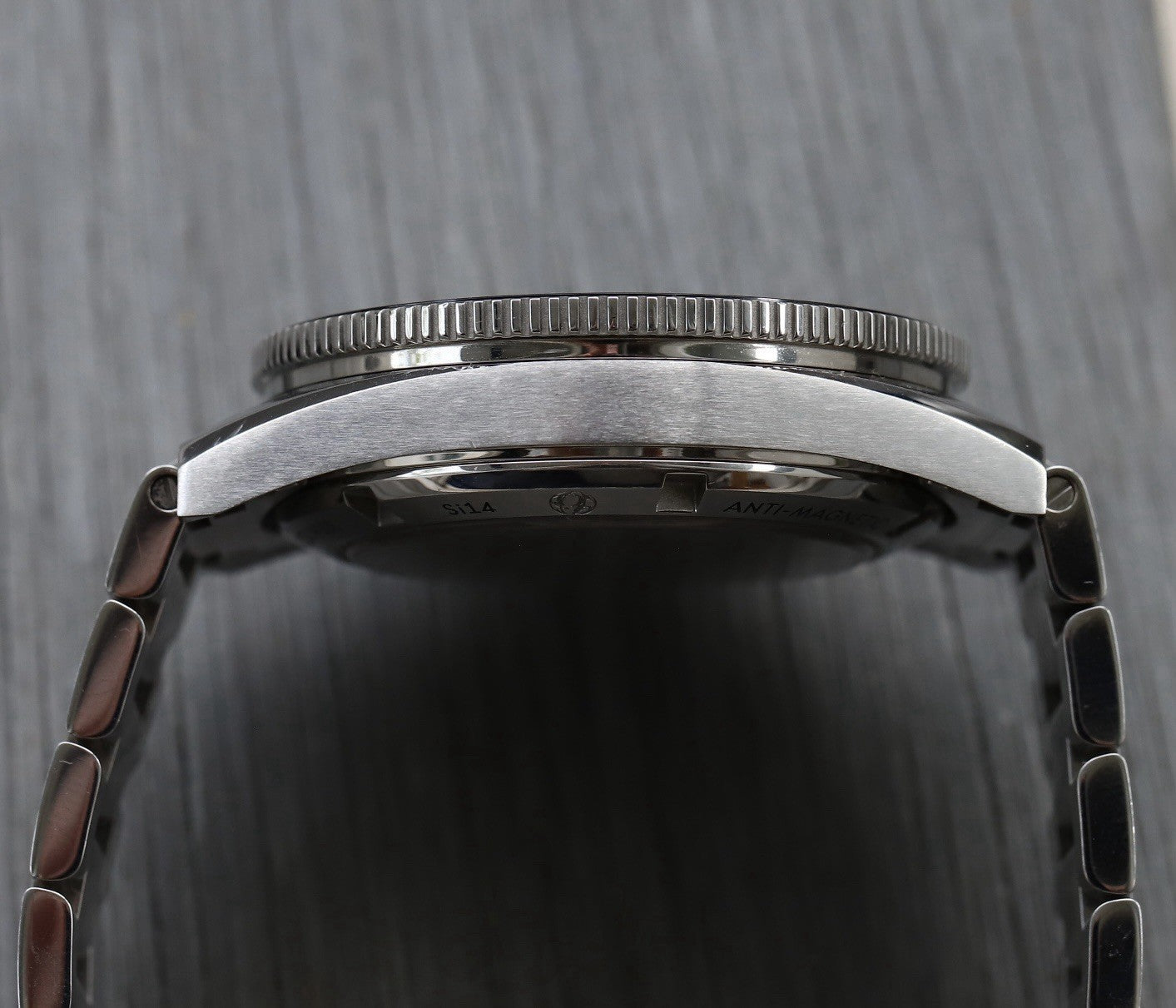 The case is made of stainless steel, and measures in at 41mm across. The flat black dial features sunken ecru lume filled markers with Arabic numerals at 3,6,9 along with classic Seamaster hands. The bezel is uni-directional, made from ceramic, and filled with Omega’s Liquidmetal for the scale markers. It’s powered by the co-axial 8400 automatic movement, and comes equipped on fantastic flat-link style Omega steel bracelet.