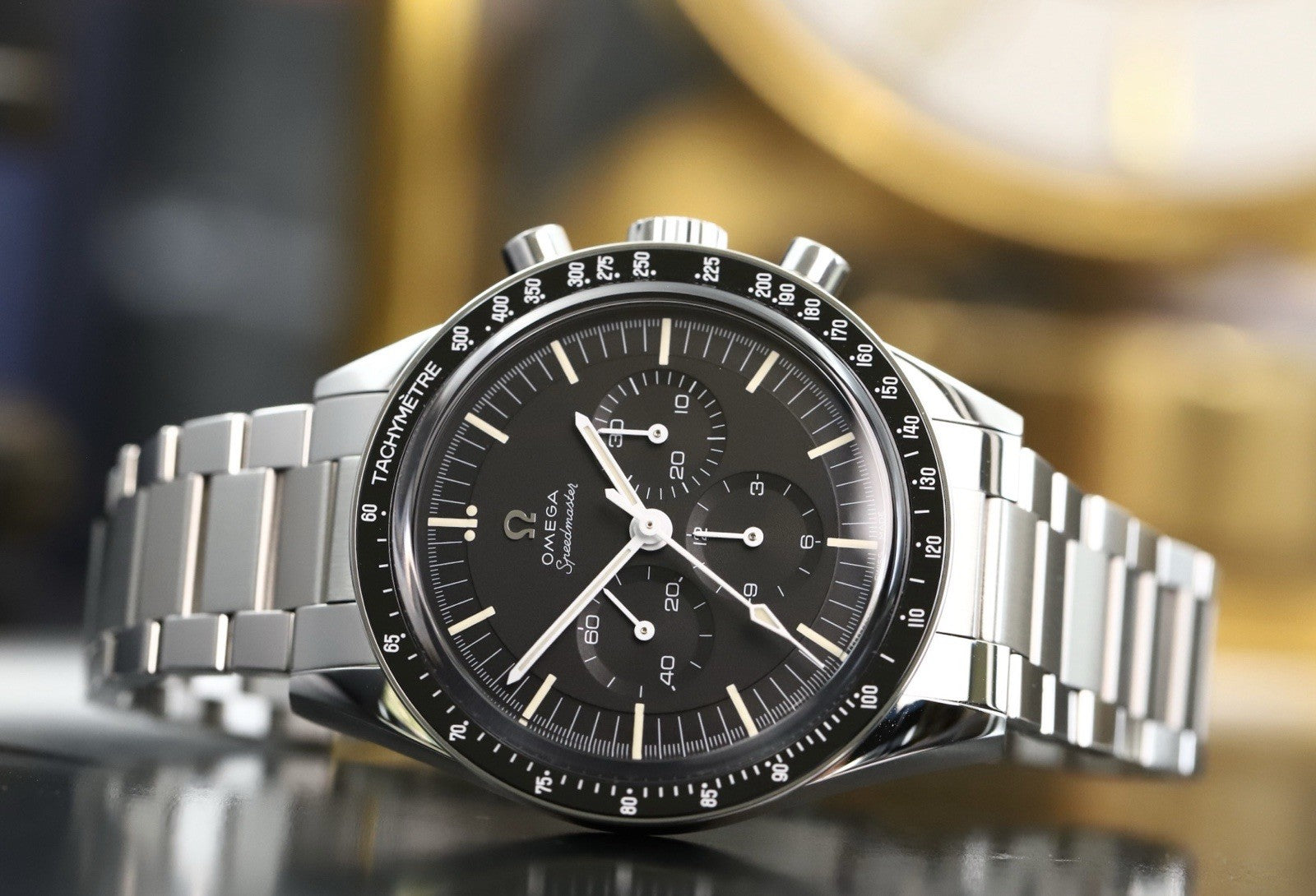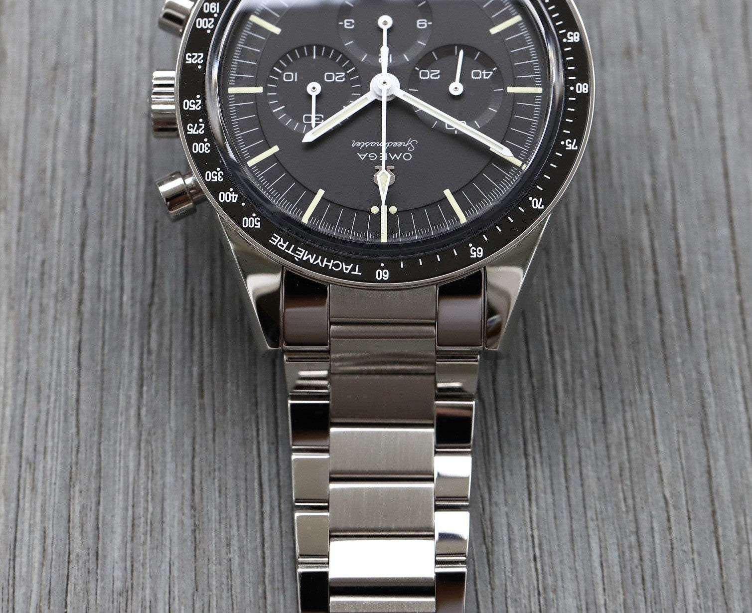 Paraphernalia: Outer sleeve, outer box, inner box, Speedmaster Medallion, Omega Loupe, 2 factory straps unopened, strap changing tool, spare springbars, card holder, pictogram card, warranty card, Speedmaster LE booklets and spare links to complete the bracelet