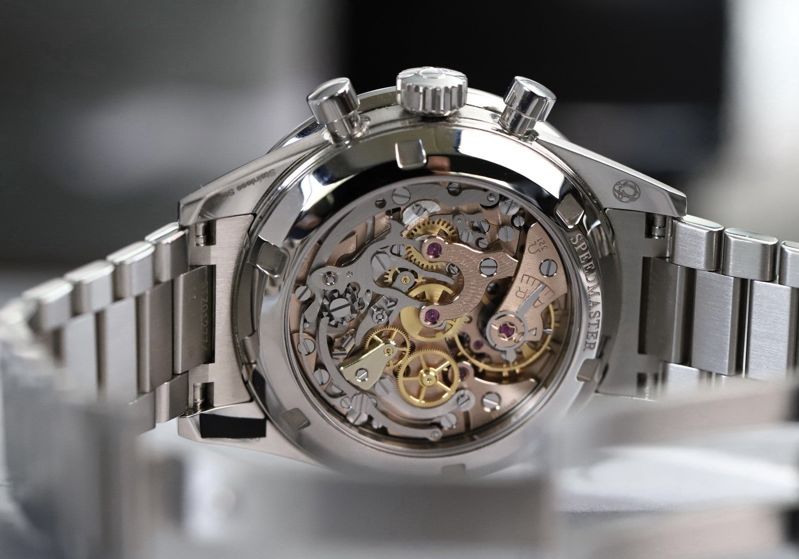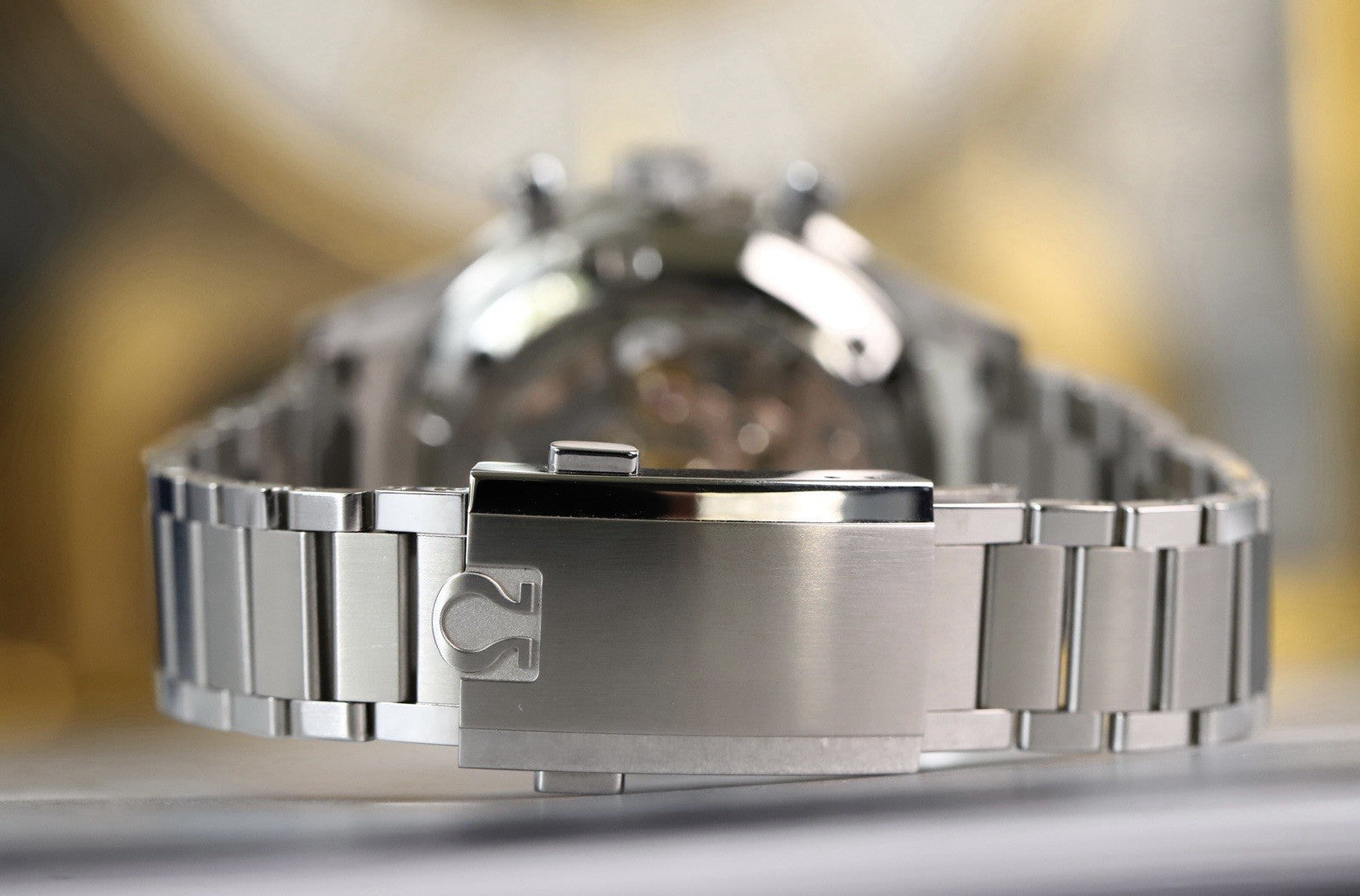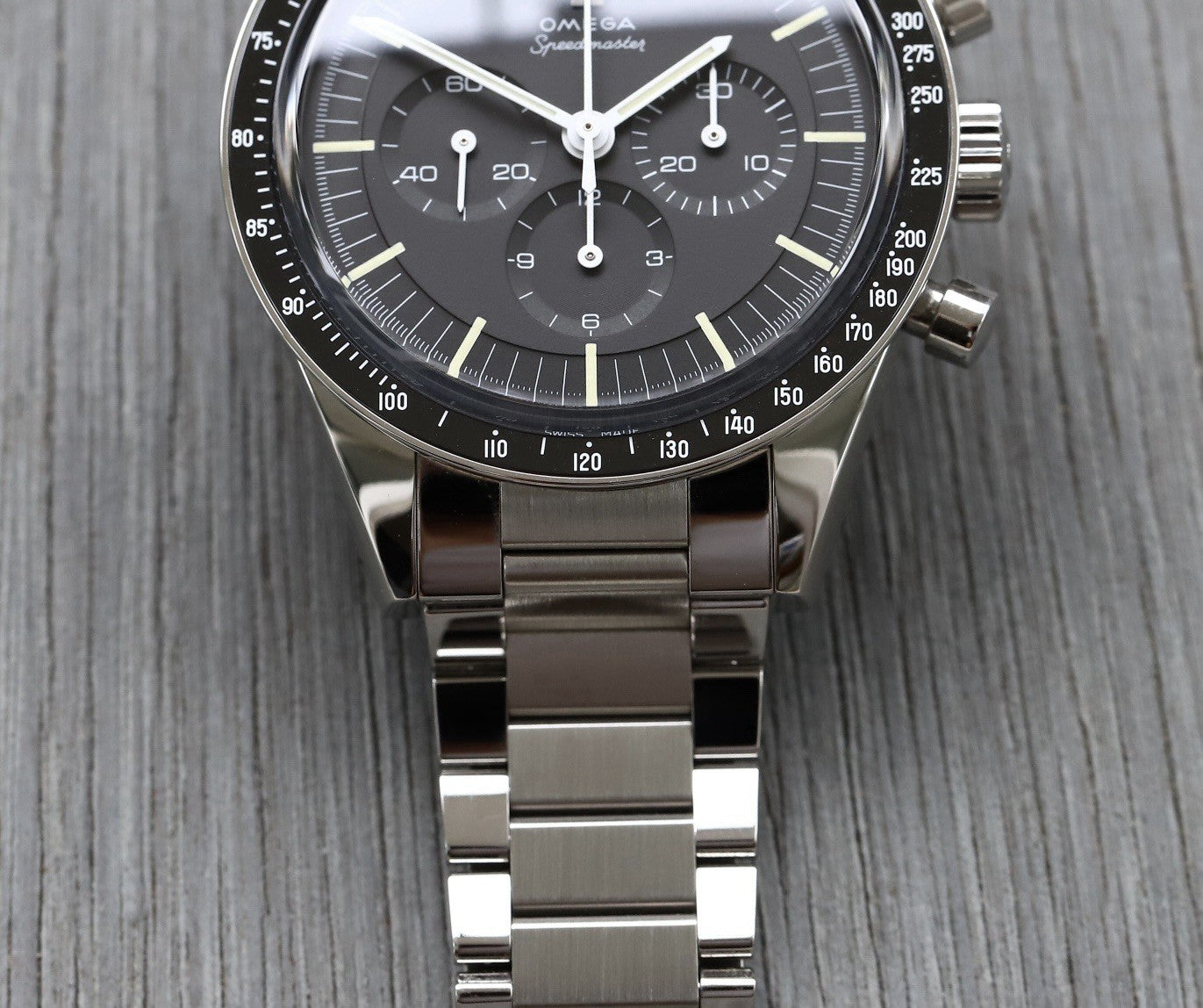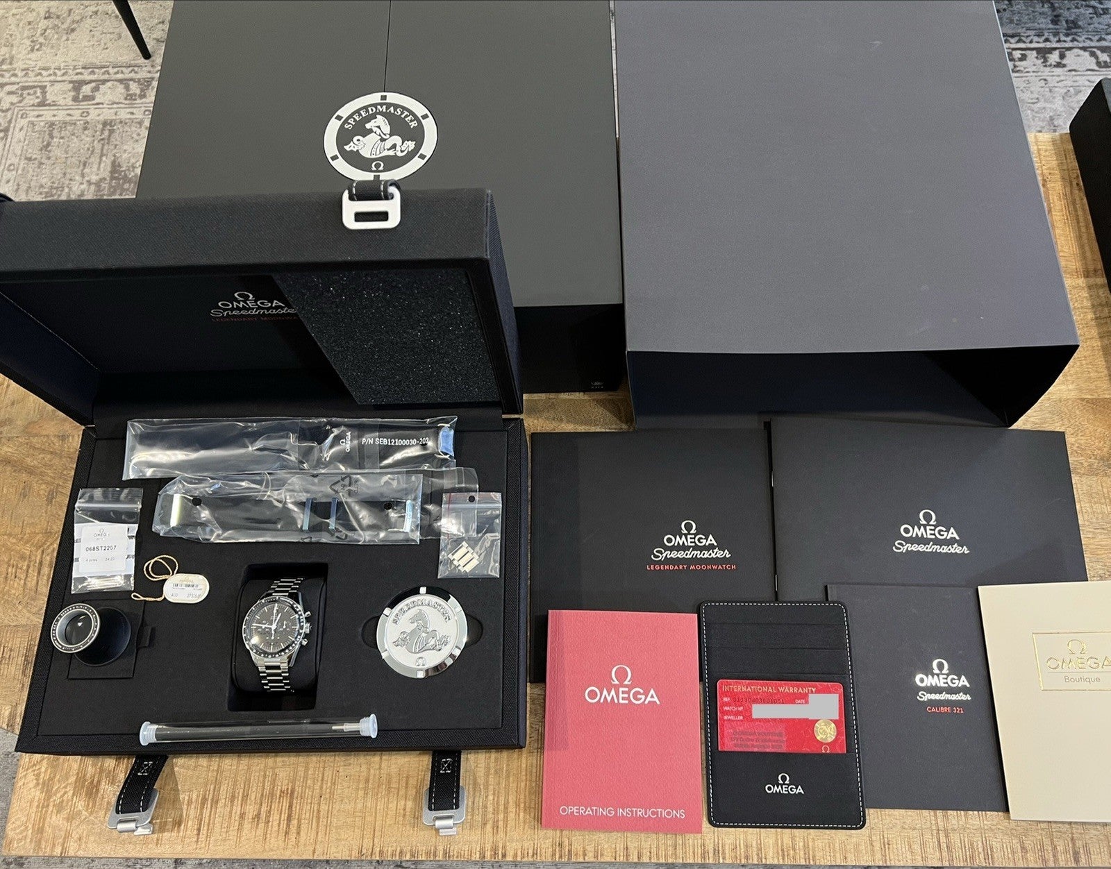 Includes outer sleeve, outer box, inner box, Speedmaster Medallion, Omega Loupe, 2 factory straps unopened, strap changing tool, spare springbars, card holder, pictogram card, warranty card, Speedmaster LE booklets and spare links to complete the bracelet