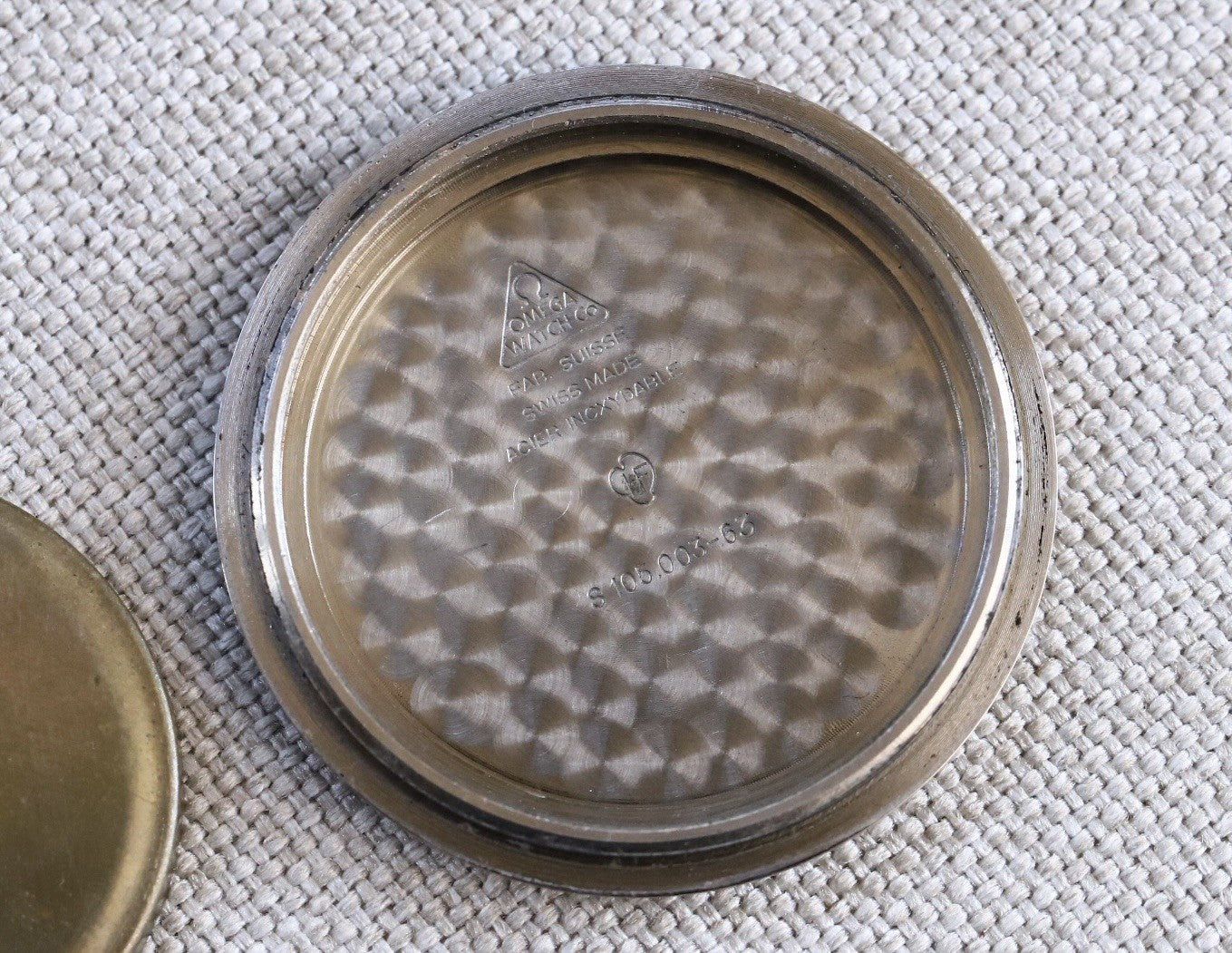 Bezel appears original, with a uniform fade throughout and marks consistent with its age. Domed Omega plexi is in excellent condition, with minor scratches and Omega logo clearly visible in the centre.