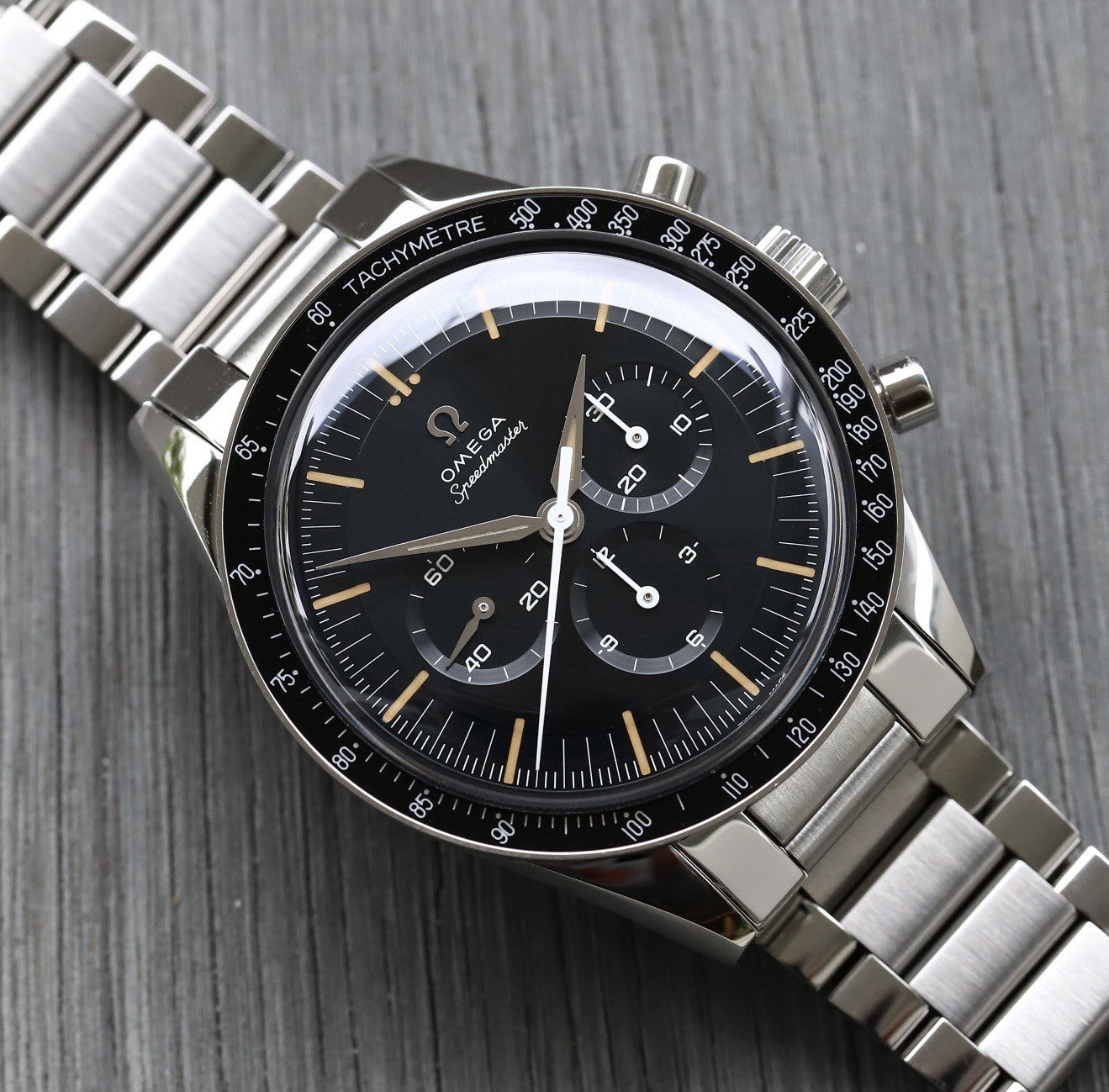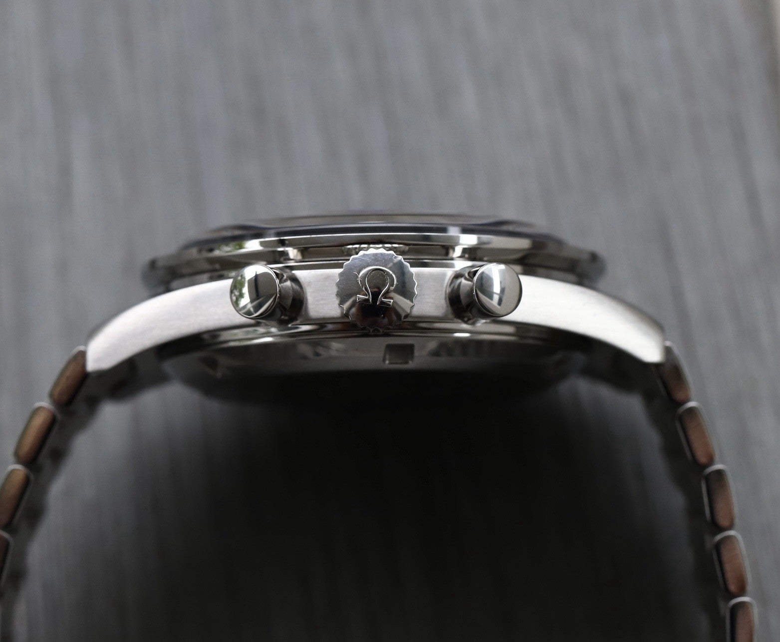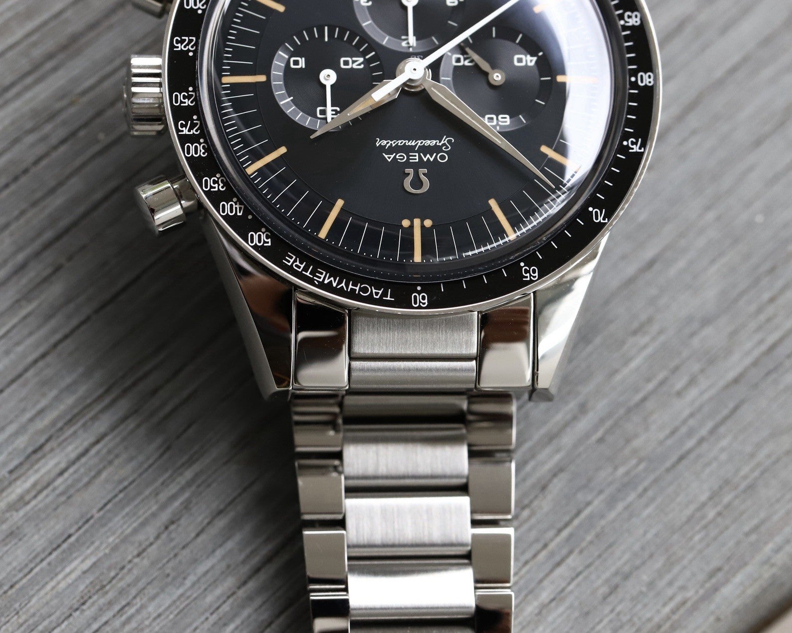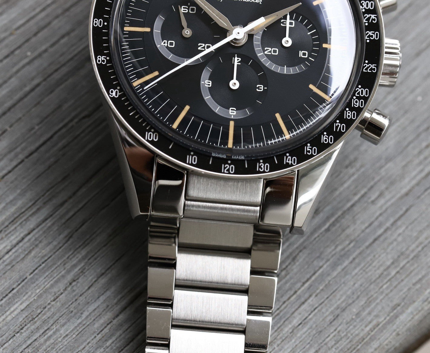 The original Moonwatch "First Omega in Space" was inspired by the watch worn by astronaut Wally Shirra in 1962 as he orbited the earth during the "Sigma 7" mission, and it's always been one of our favourite modern iterations of the Speedy with it's 39.7mm case, straight lugs, and vintage touches like the stepped dial and Alpha hands.