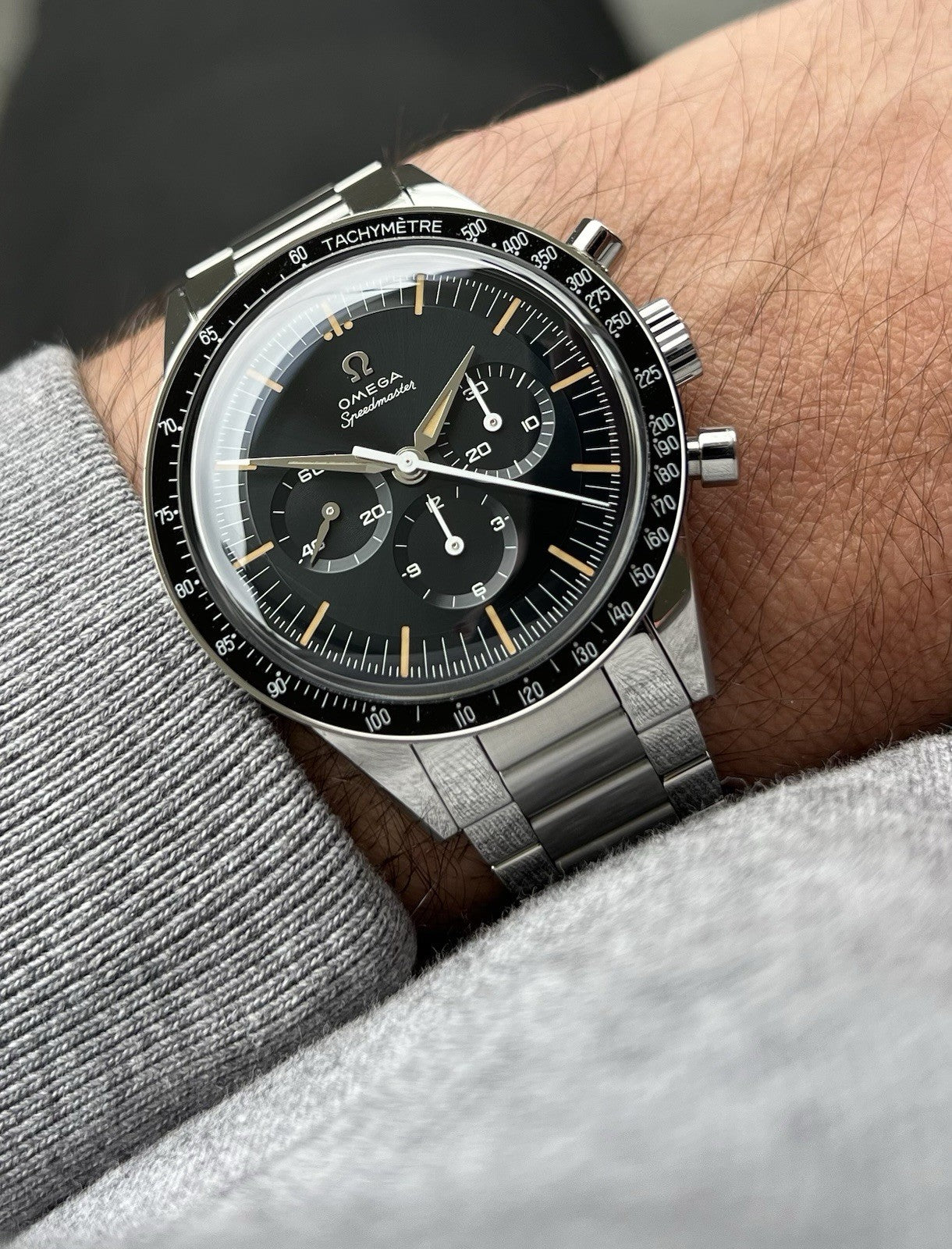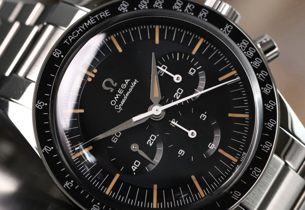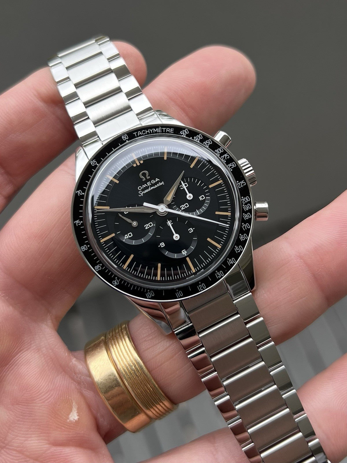 The original Moonwatch "First Omega in Space" was inspired by the watch worn by astronaut Wally Shirra in 1962 as he orbited the earth during the "Sigma 7" mission, and it's always been one of our favourite modern iterations of the Speedy with it's 39.7mm case, straight lugs, and vintage touches like the stepped dial and Alpha hands.