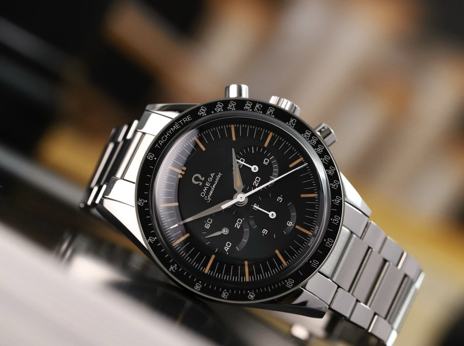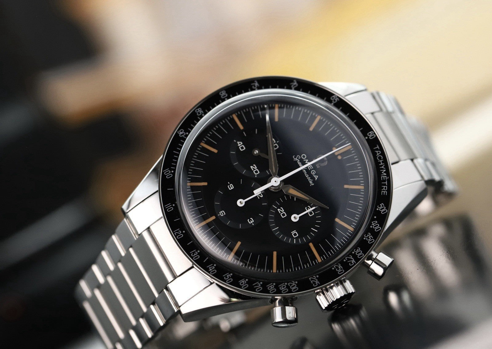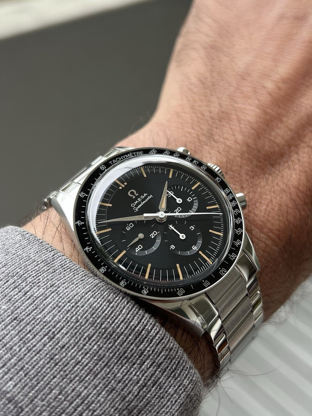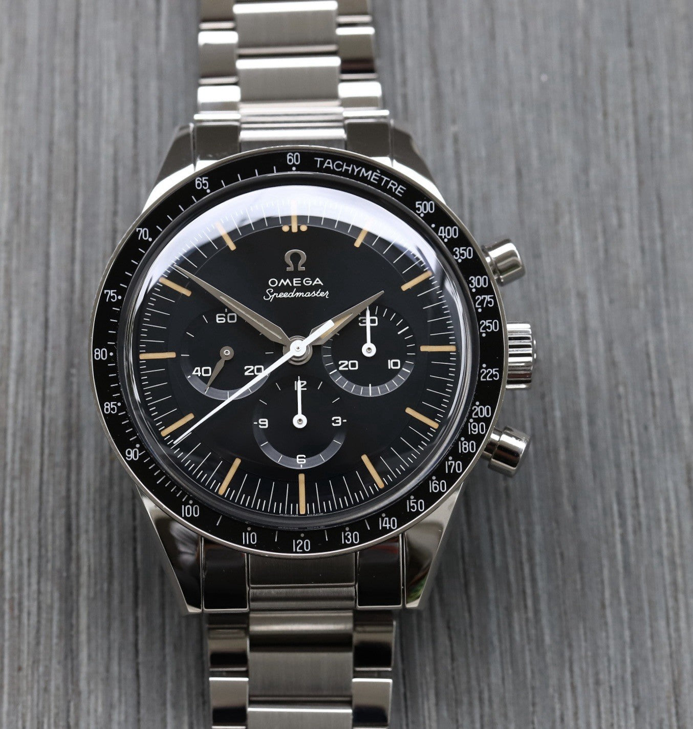 The original Moonwatch "First Omega in Space" was inspired by the watch worn by astronaut Wally Shirra in 1962 as he orbited the earth during the "Sigma 7" mission, and it's always been one of our favourite modern iterations of the Speedy with it's 39.7mm case, straight lugs, and vintage touches like the stepped dial and Alpha hands.