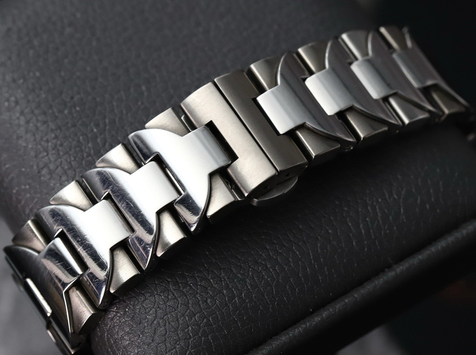 The bracelet contains enough links to fit a 7.6in wrist, with one spare. Shows scratches and scuffs throughout, but remains very tight. Please see images for full condition details.