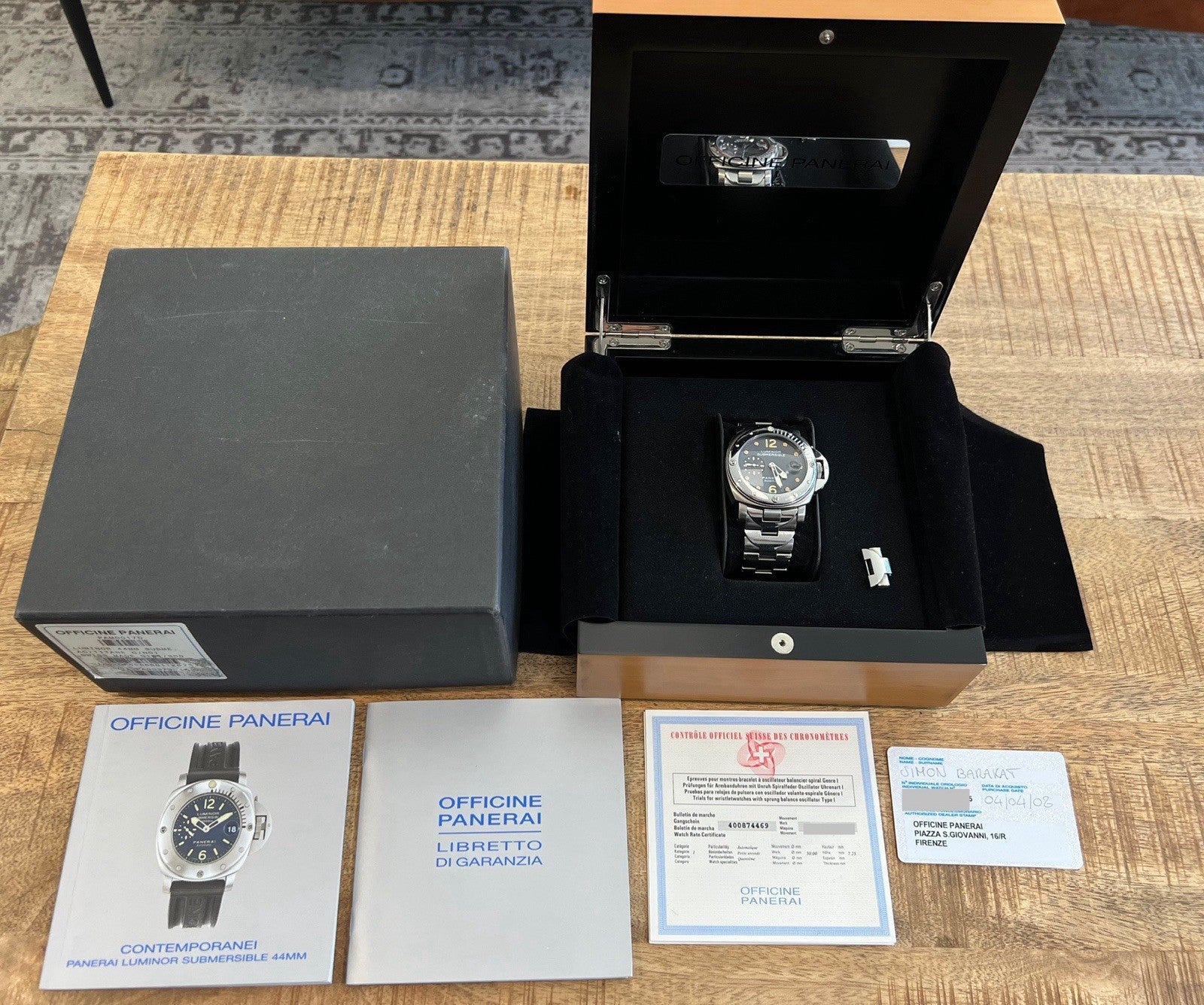 Paraphernalia: Outer box, inner box, warranty card (expired), Panerai booklets, reprinted COSC certificate and spare link for the bracelet